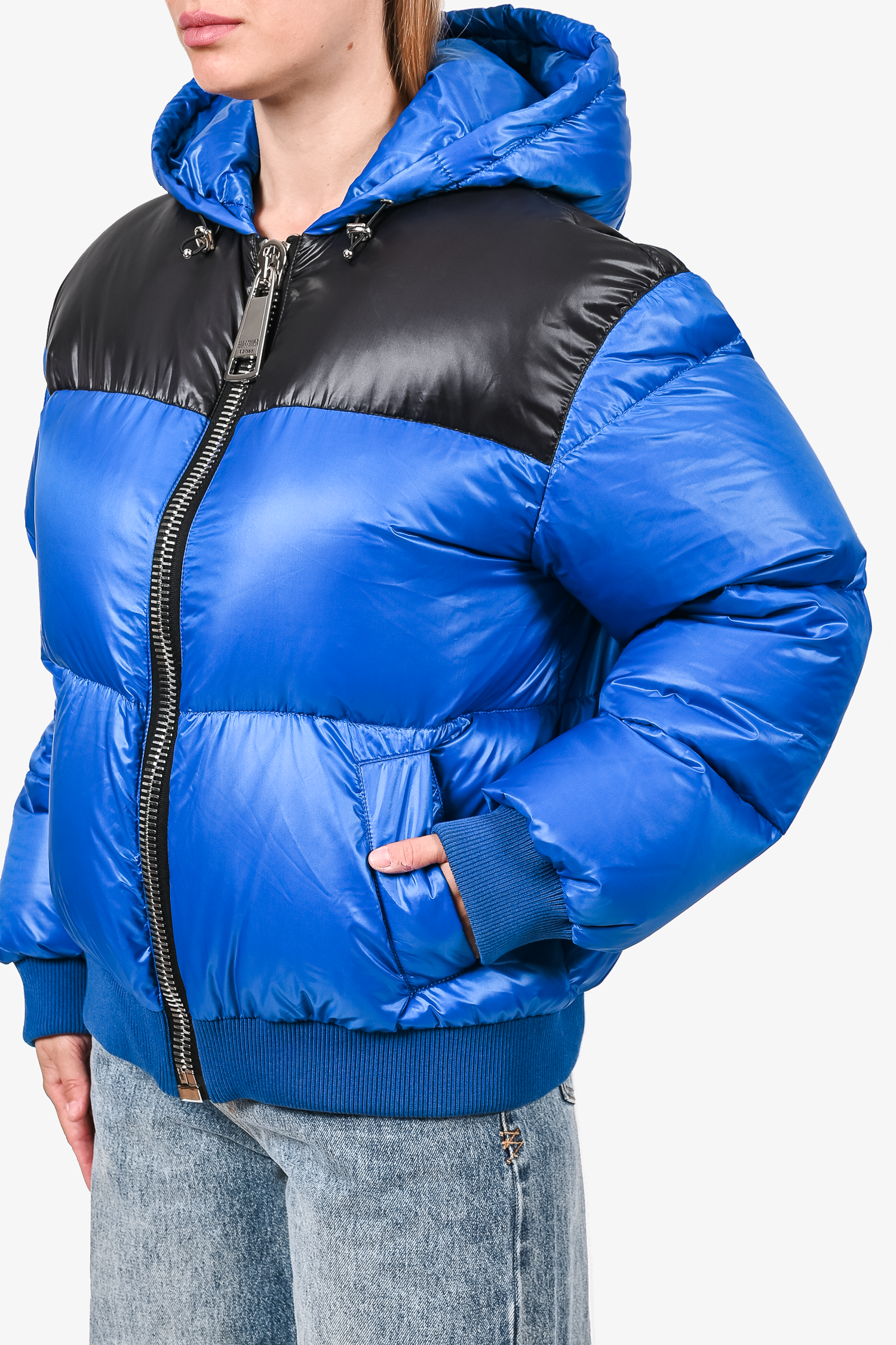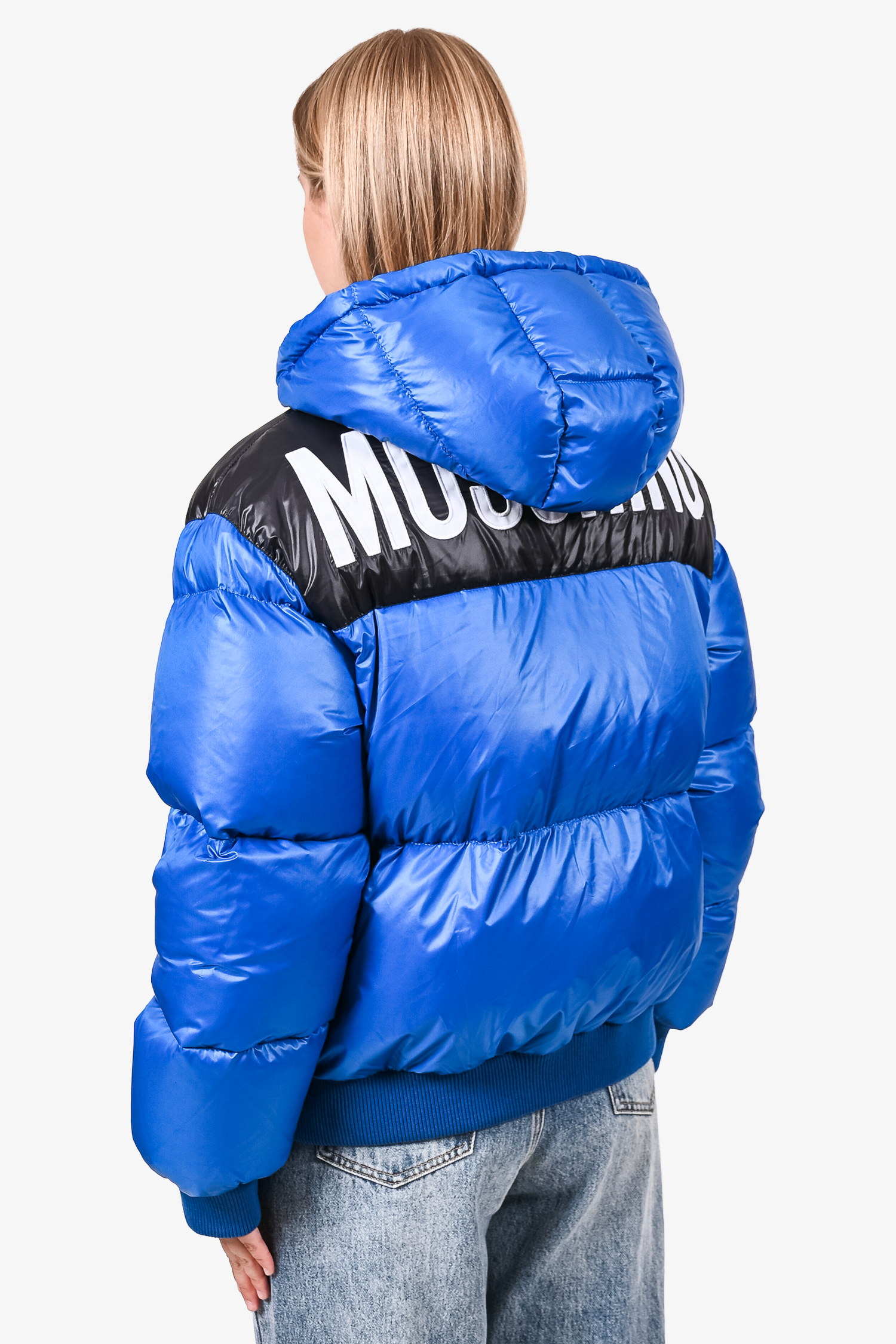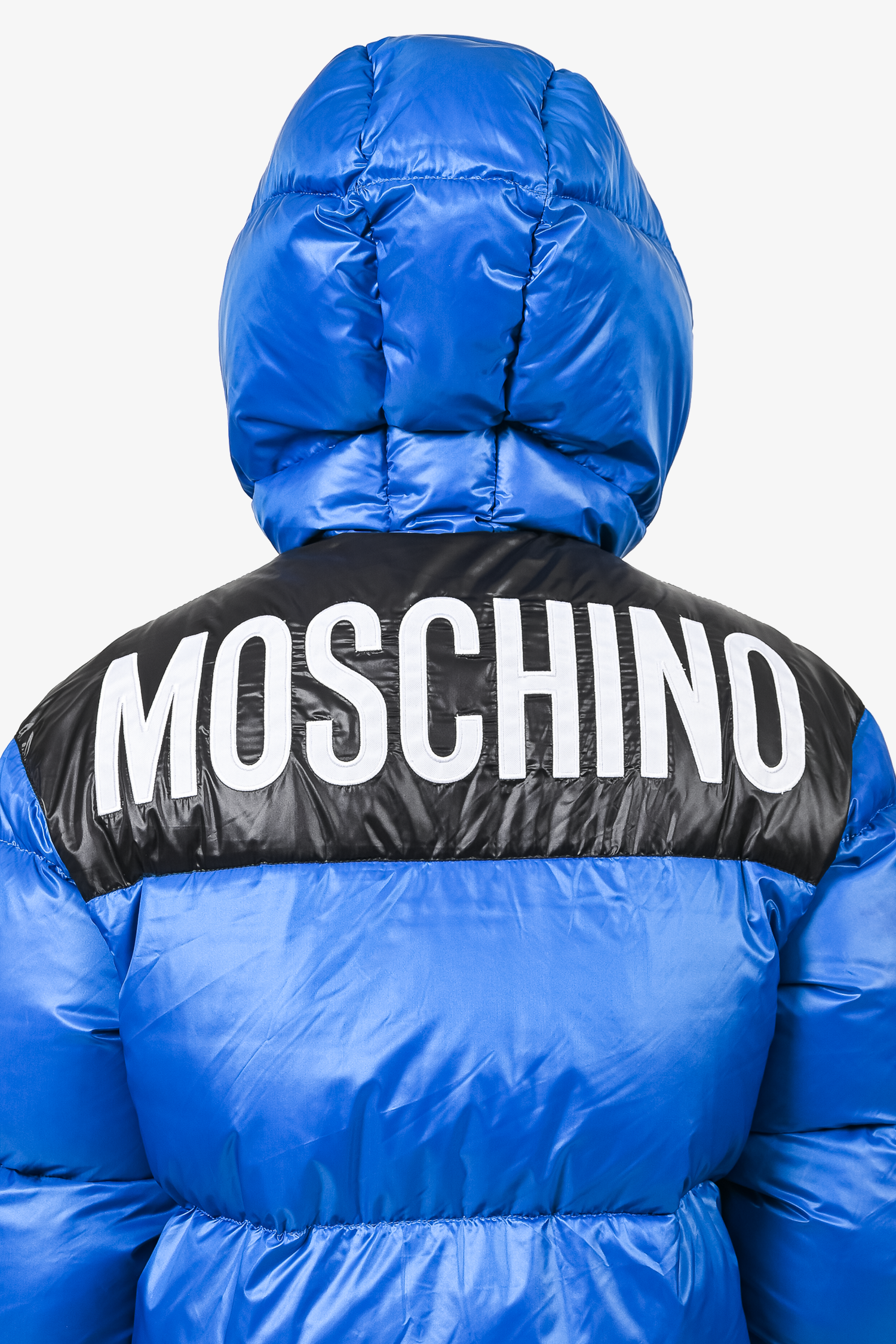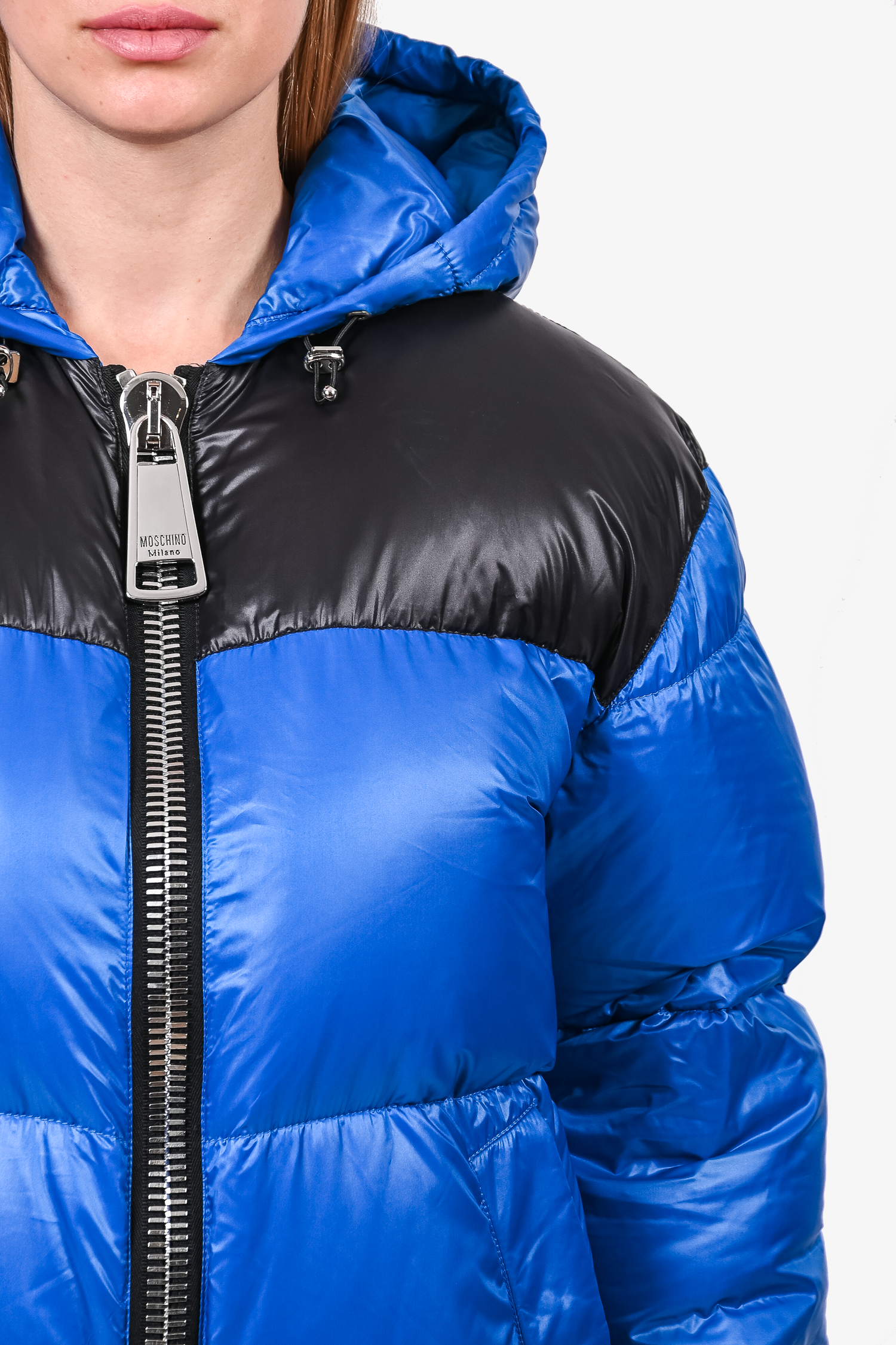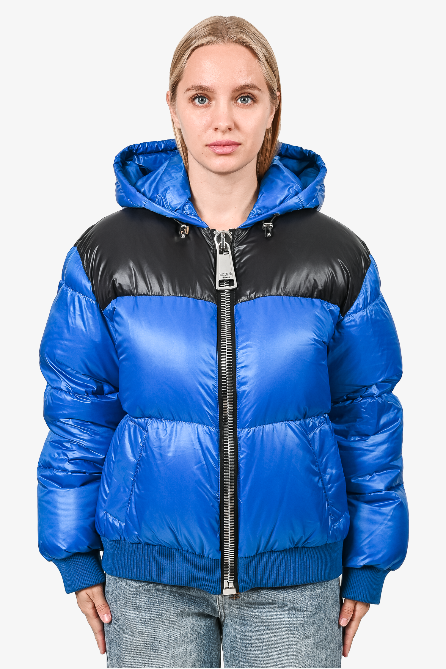 Refresh availabilityMoschino Cobalt Blue/Black Logo Down Puffer Jacket. Drawstring hood. Chunky metal zip closure. Silver-tone hardware. Two front slash pockets with snap closures. Tonal stitching.