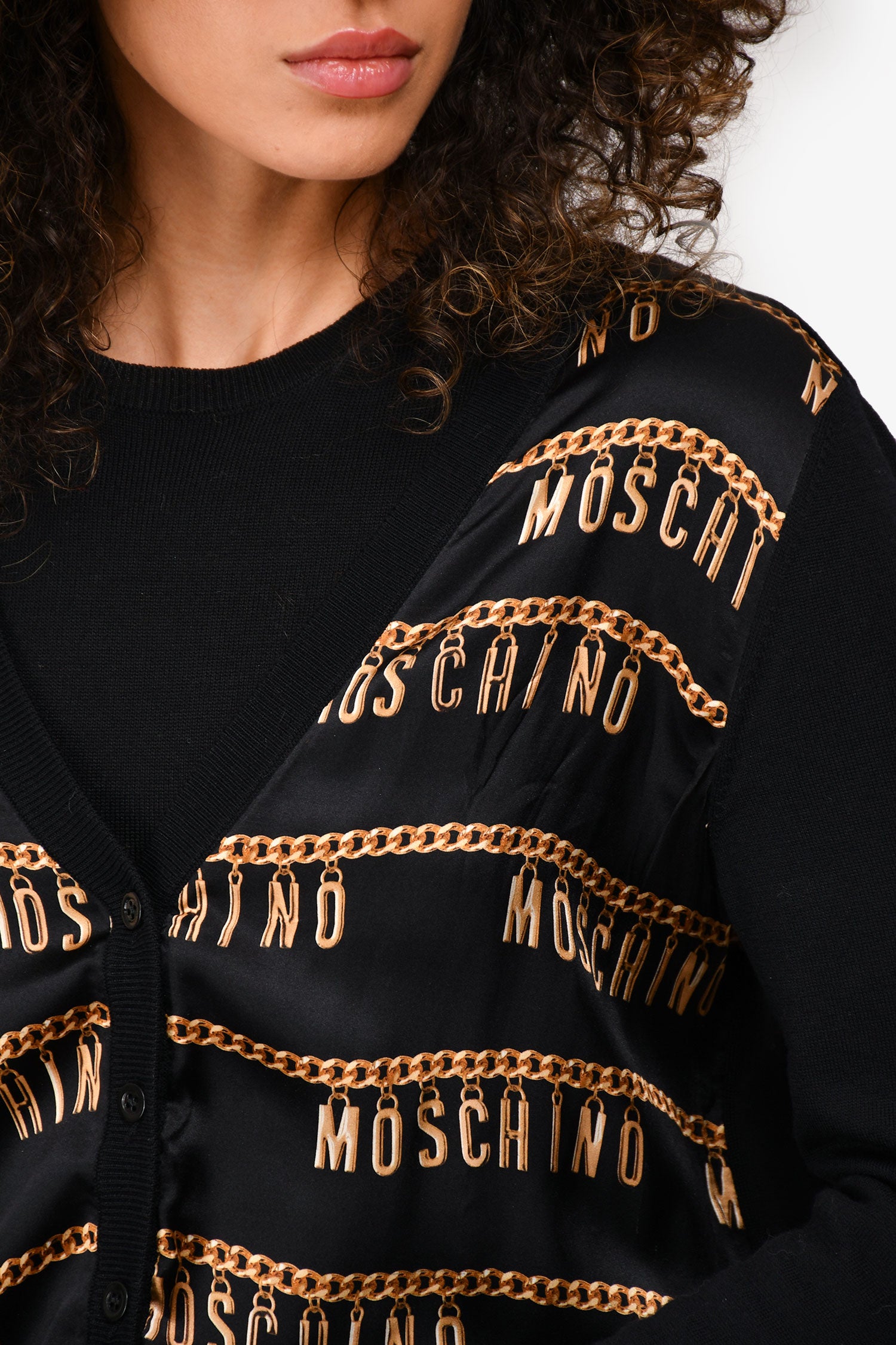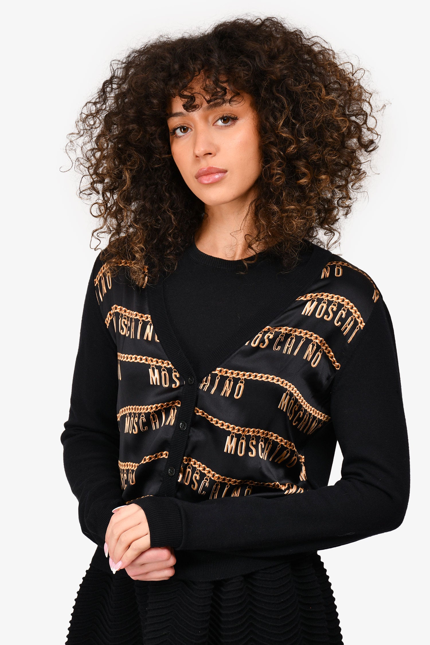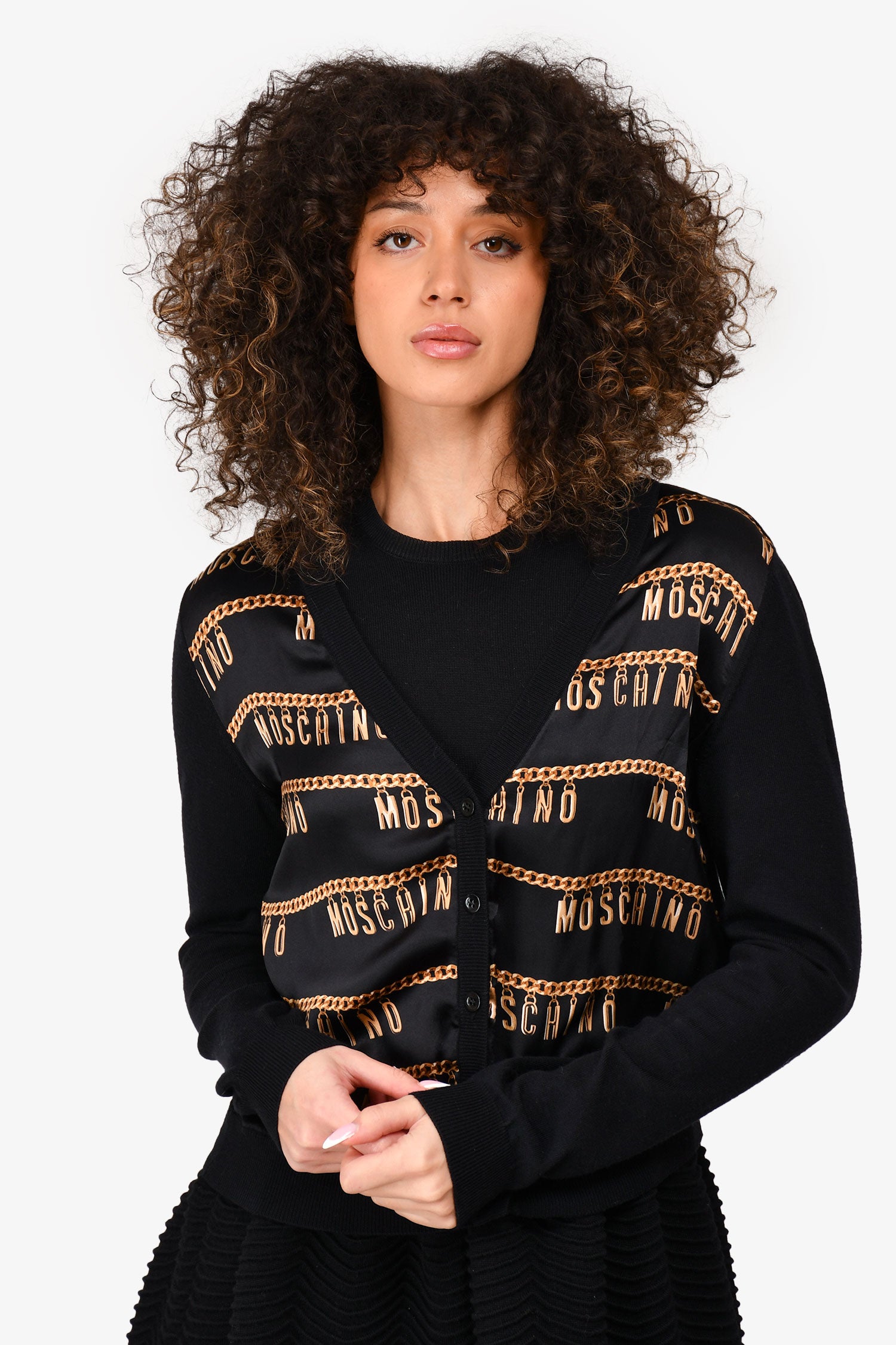 Refresh availabilityMoschino Couture Black/Yellow Wool/Silk Cardigan. Front button placket. Ribbed trimming. Silk front with 'Moschino' motif. Tonal stitching.