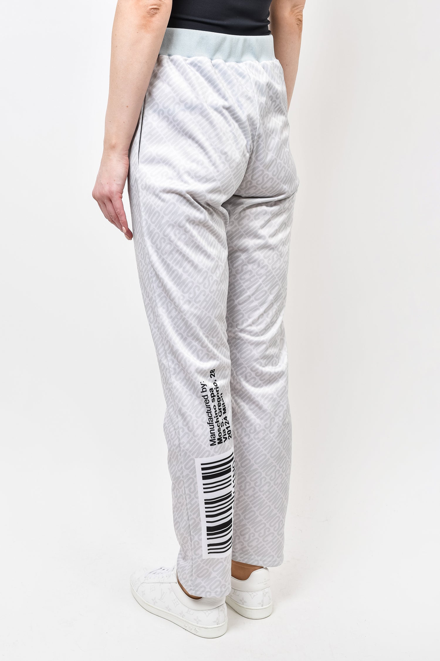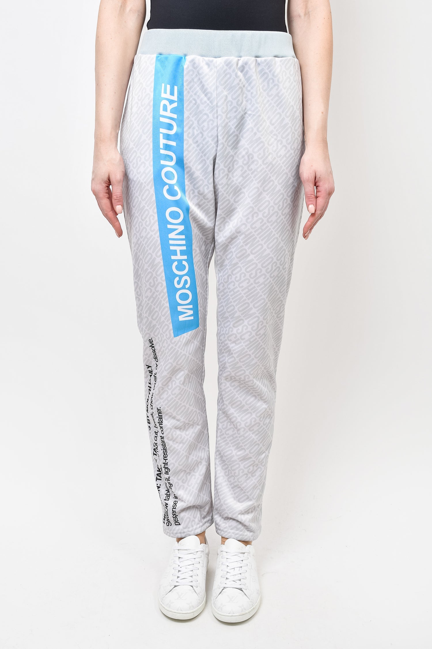 Moschino Couture Grey/White Logo Track Pants. Graphic detail on right leg. Slip pockets at waist. Elastic waistband. Tonal stitching.