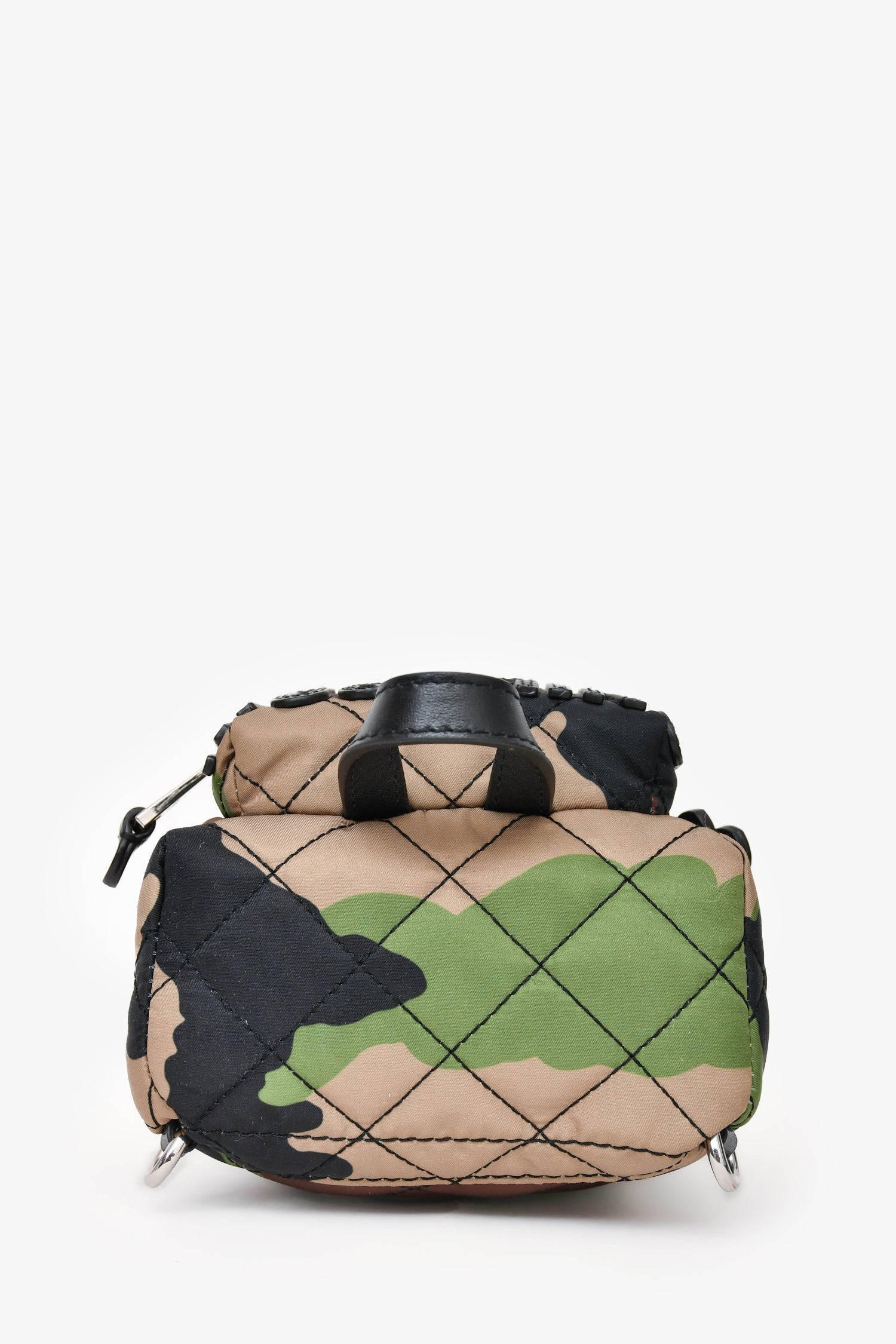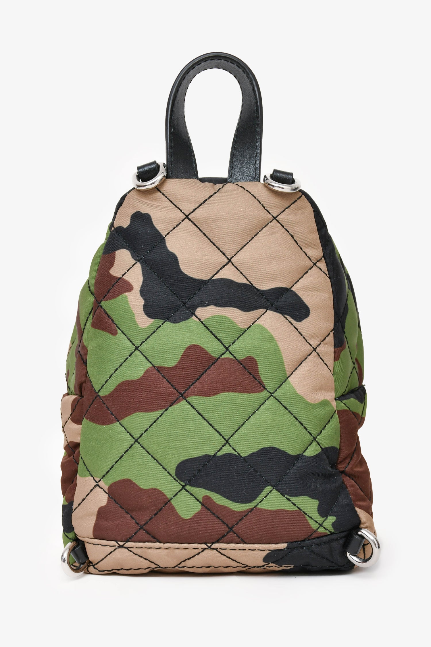 Refresh availabilityMoschino Green Cloth Quilted Logo Patched Mini Backpack. Top zip-closure. Single slip pocket on the main compartment. Front exterior zipped pocket. Single top handle. Leather detachable and adjustable straps. Silver-tone hardware. Contrast stitching.