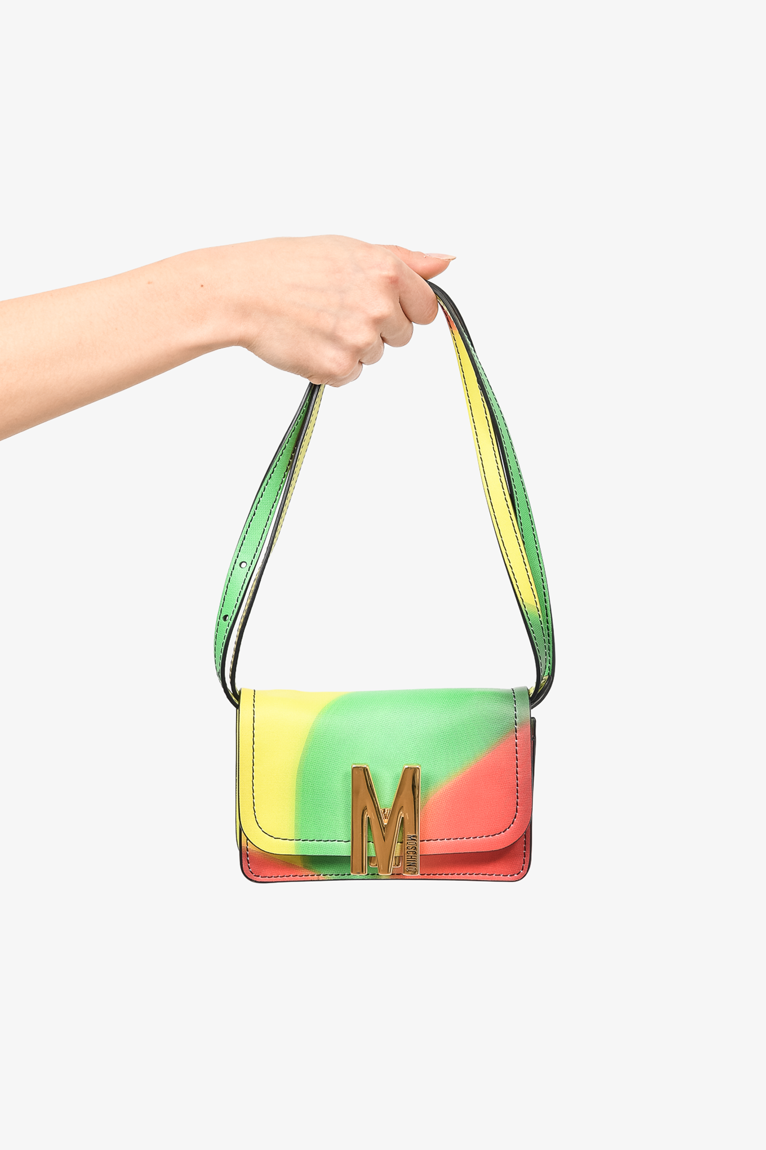Refresh availabilityMoschino Green/Yellow M Logo Patchwork Crossbody Bag. Top flap with flip lock closure. Removable adjustable crossbody strap. Black interior lining. Single interior clip pocket. Front "M" logo detail. Gold-tone hardware. Contrast stitching.