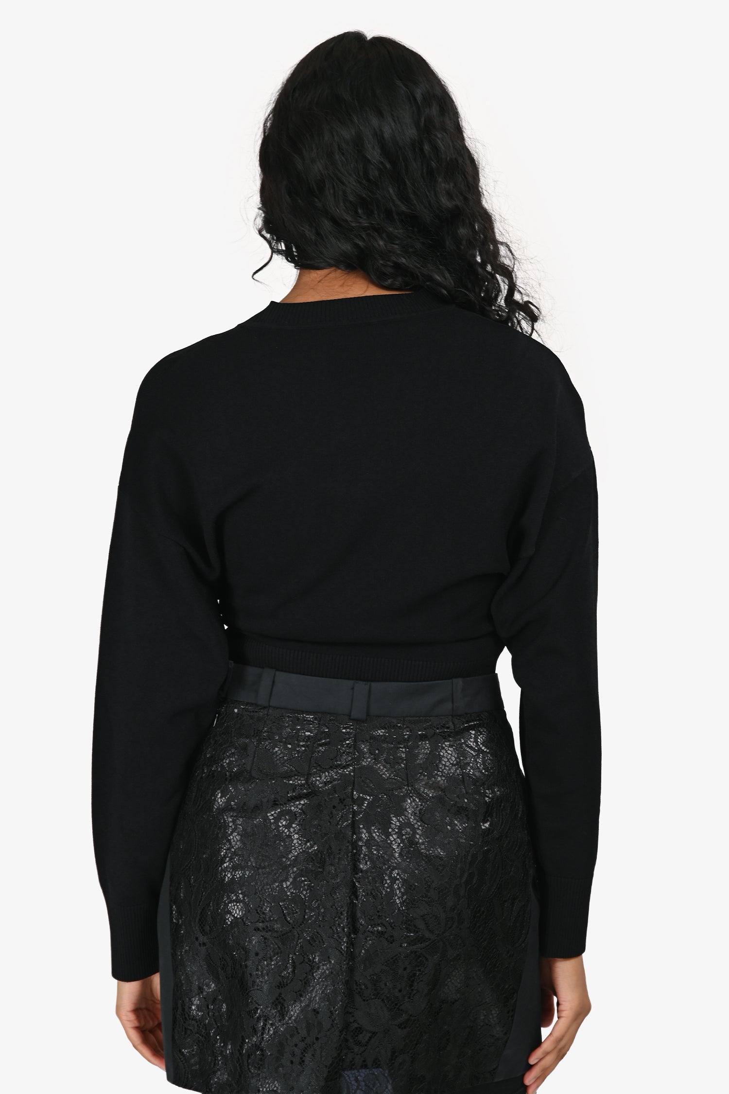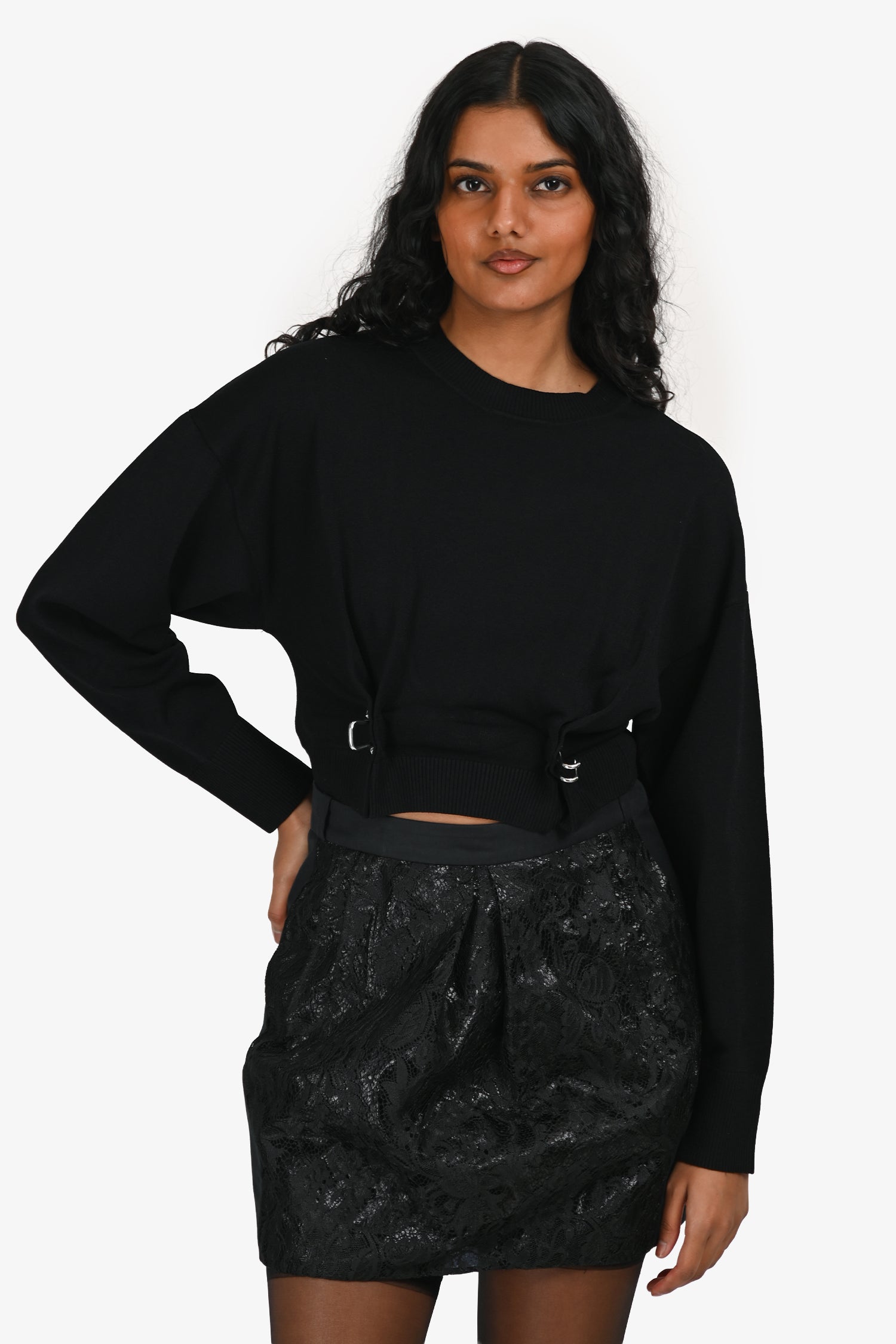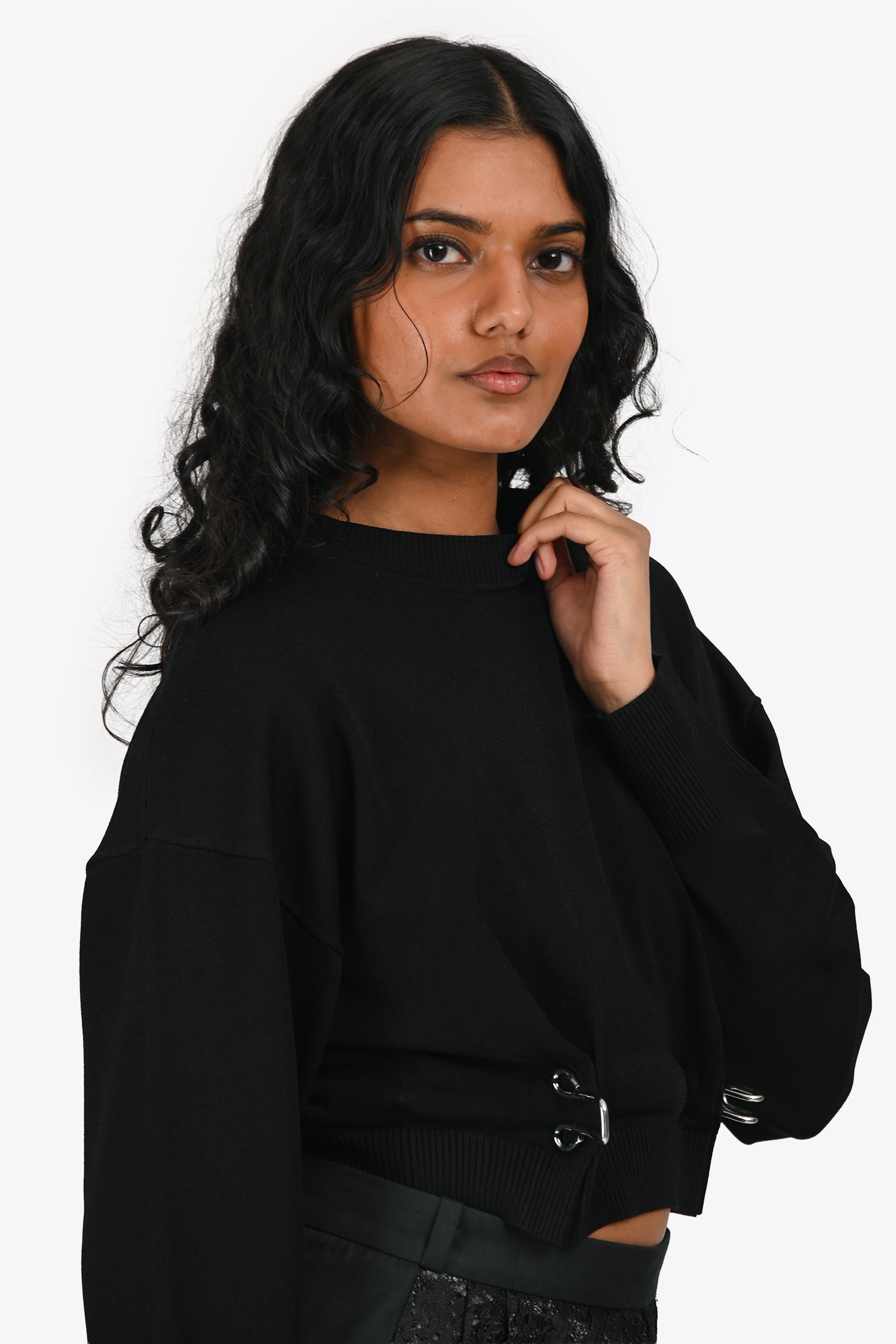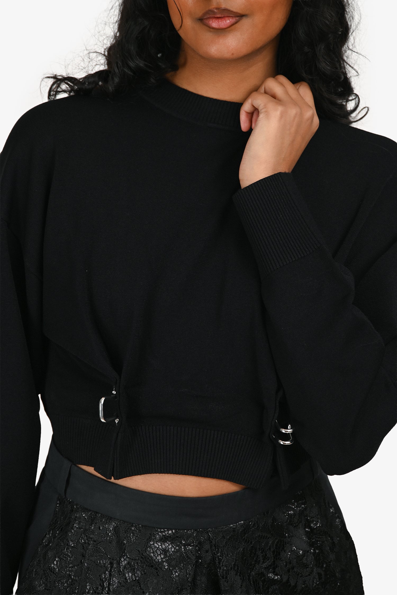 Refresh availabilityMoschino Jeans Black Knit Cropped Sweater with Silver Hook Detail. Slip-on. Crew neckline. Ribbed collar, cuffs, and hem. Silver-tone hardware. Tonal stitching.