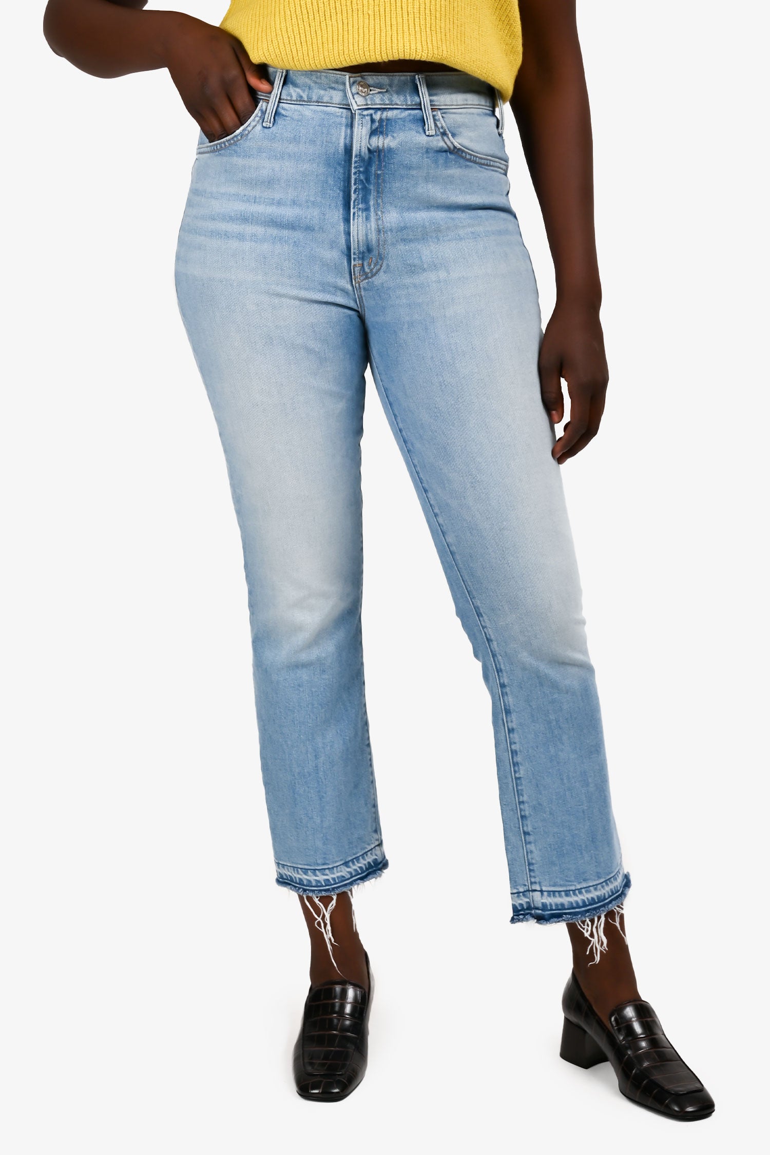 Refresh availabilityMother Superior Light Wash Fringe Hem Jeans. Mid rise. Front button and zip closure. Front and back pockets. Fringe raw hem. Contrast stitching.