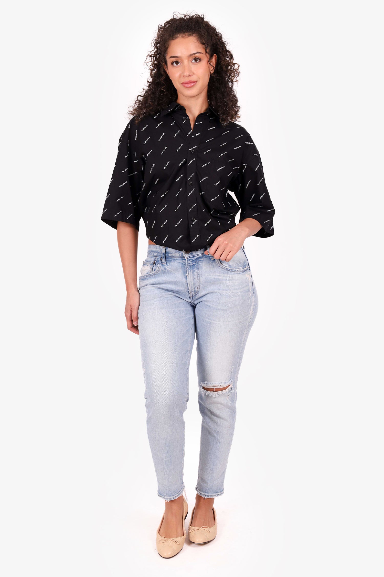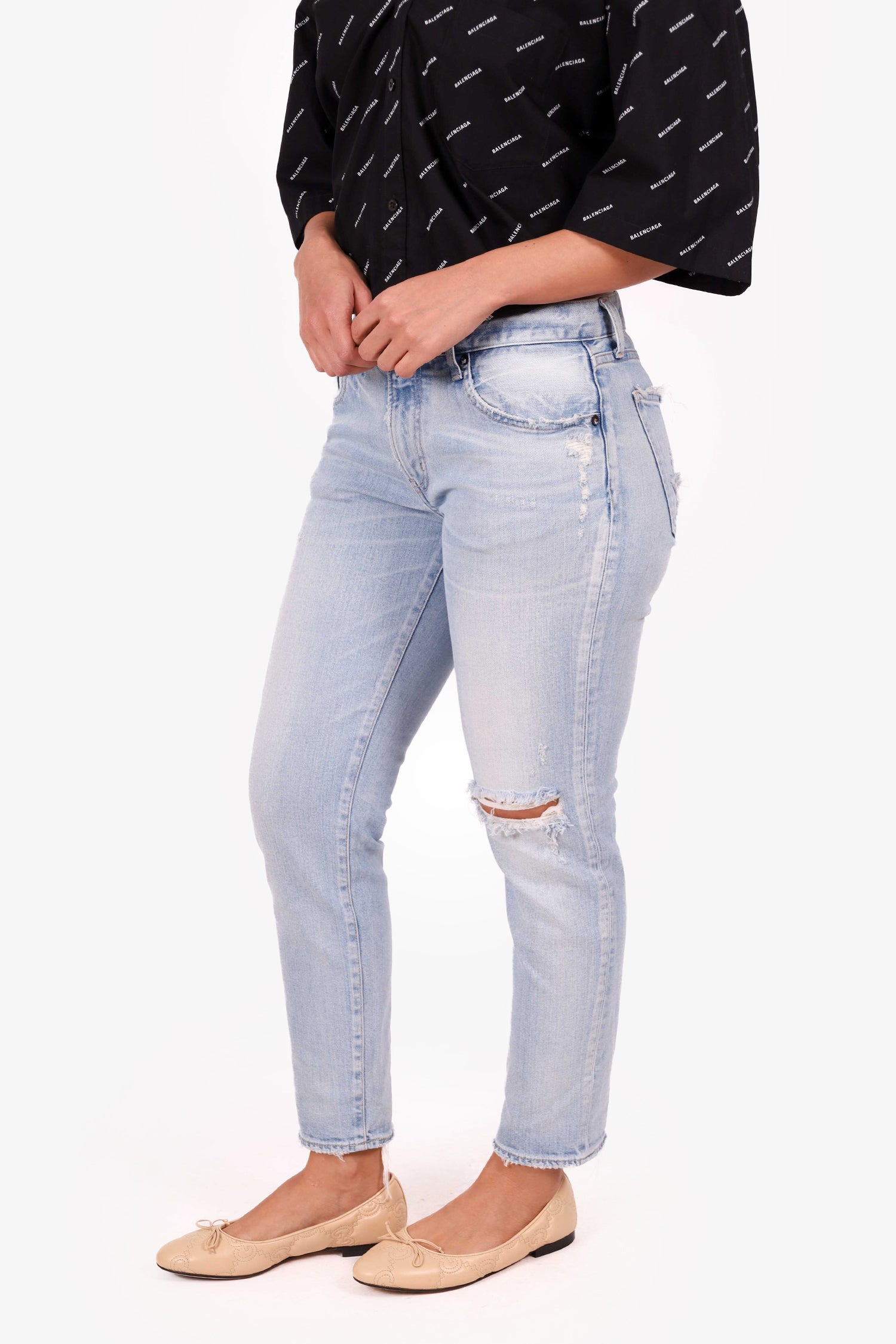 Refresh availabilityMoussy Straight Leg Jeans. Slip-on. Front zip with button closure. Waistband belt loops. 5 exterior pockets; 2 front side slip and 1 mini compartment, 2 rear slip. Intentional distressing and rips throughout. Silver and bronze-tone hardware. Contrast stitching.