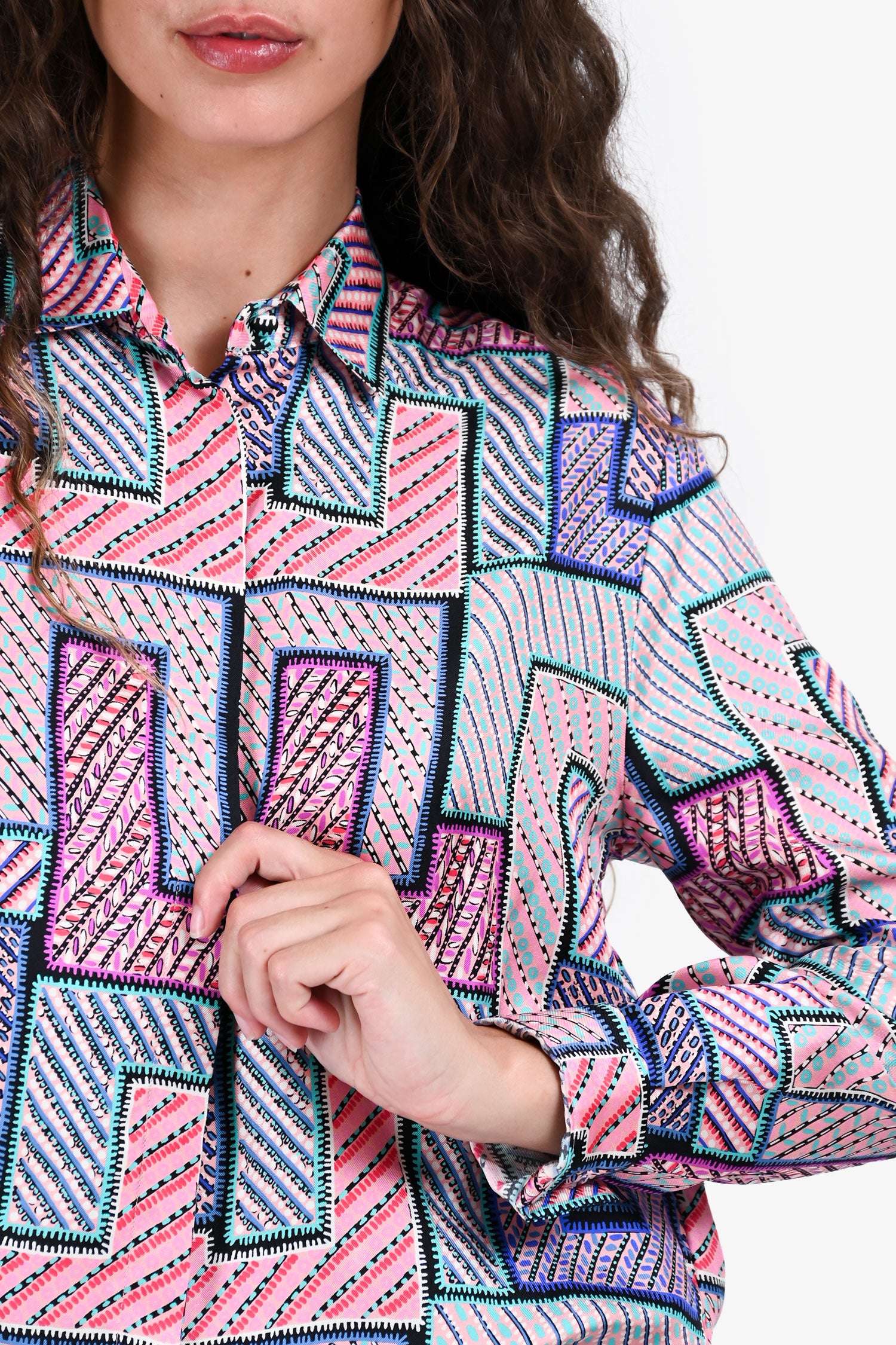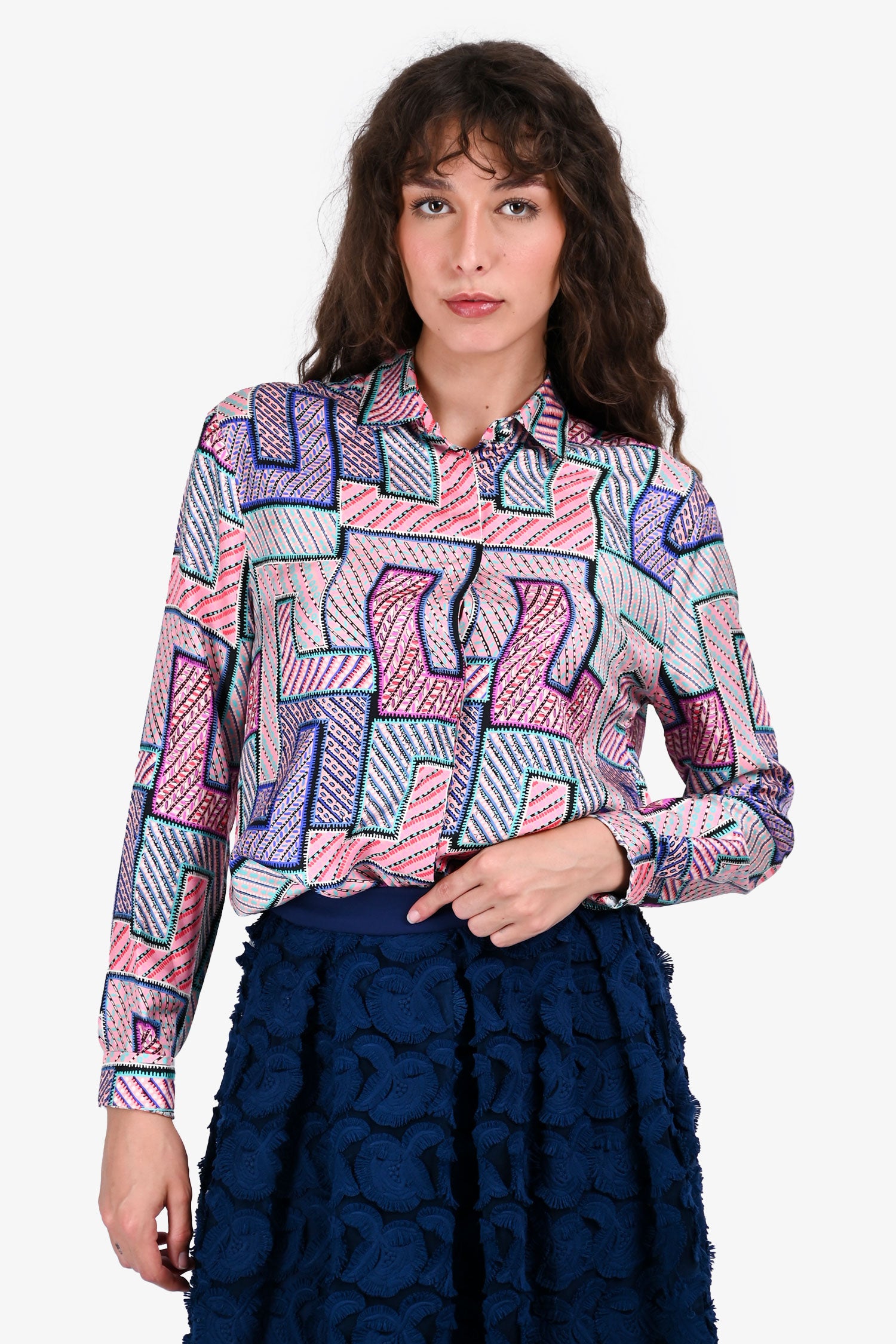 Refresh availabilityMSGM Pink Multicolour Printed Silk Button Down Blouse. Classic pointed collar. Button front closure. Long sleeves with button cuffs. Lightweight silk construction. Tonal stitching.