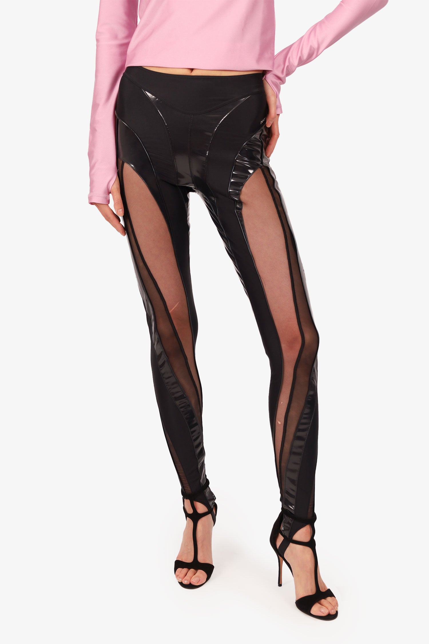 Refresh availabilityMugler Black PVC/Mesh Panelled Stirup Leggings. Pull-on. Elasticated waistband. See-through mesh panels. Stirrup cuffs. Silver-tone hardware. Tonal stitching.