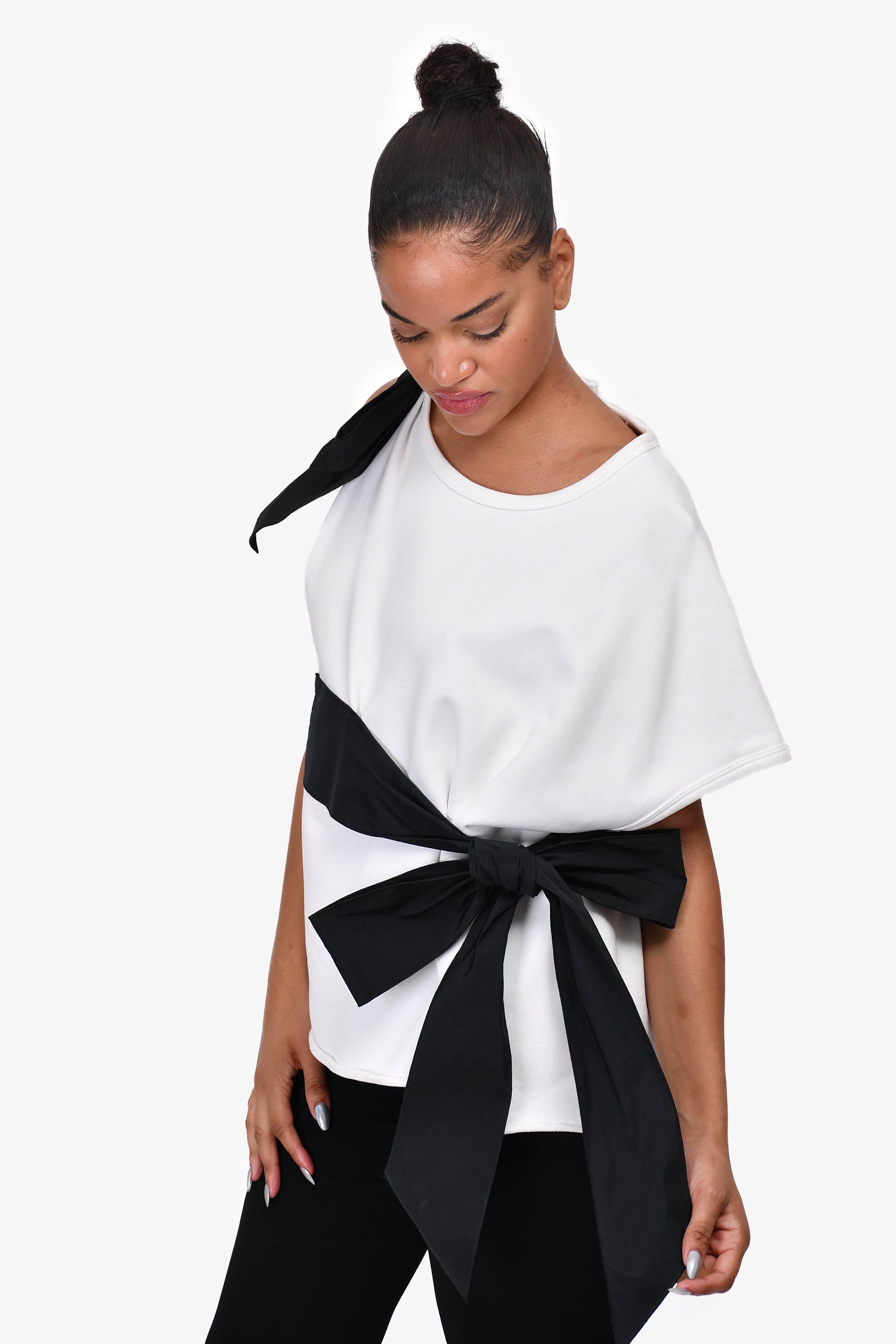 Refresh availabilityN.21 White Cotton Bow Top. Uneven sleeves. Side bow tie detail. Oversized. Back keyhole closure. Tonal stitching.