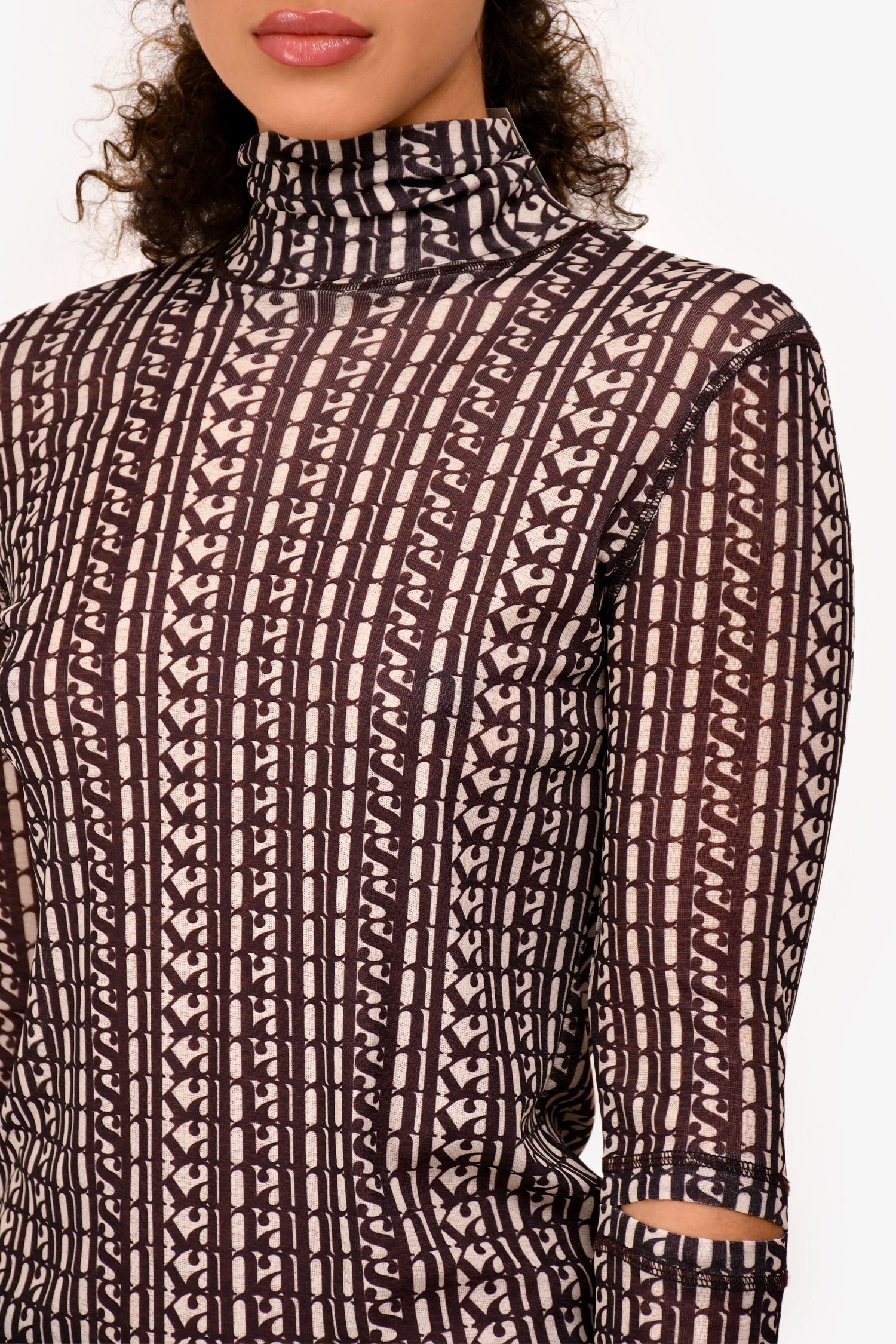 Refresh availabilityNanushka Black/White Logo Sheer Turtleneck Top. Long sleeves with arm cut-outs. Logo motif. Tonal and contrast stitching.