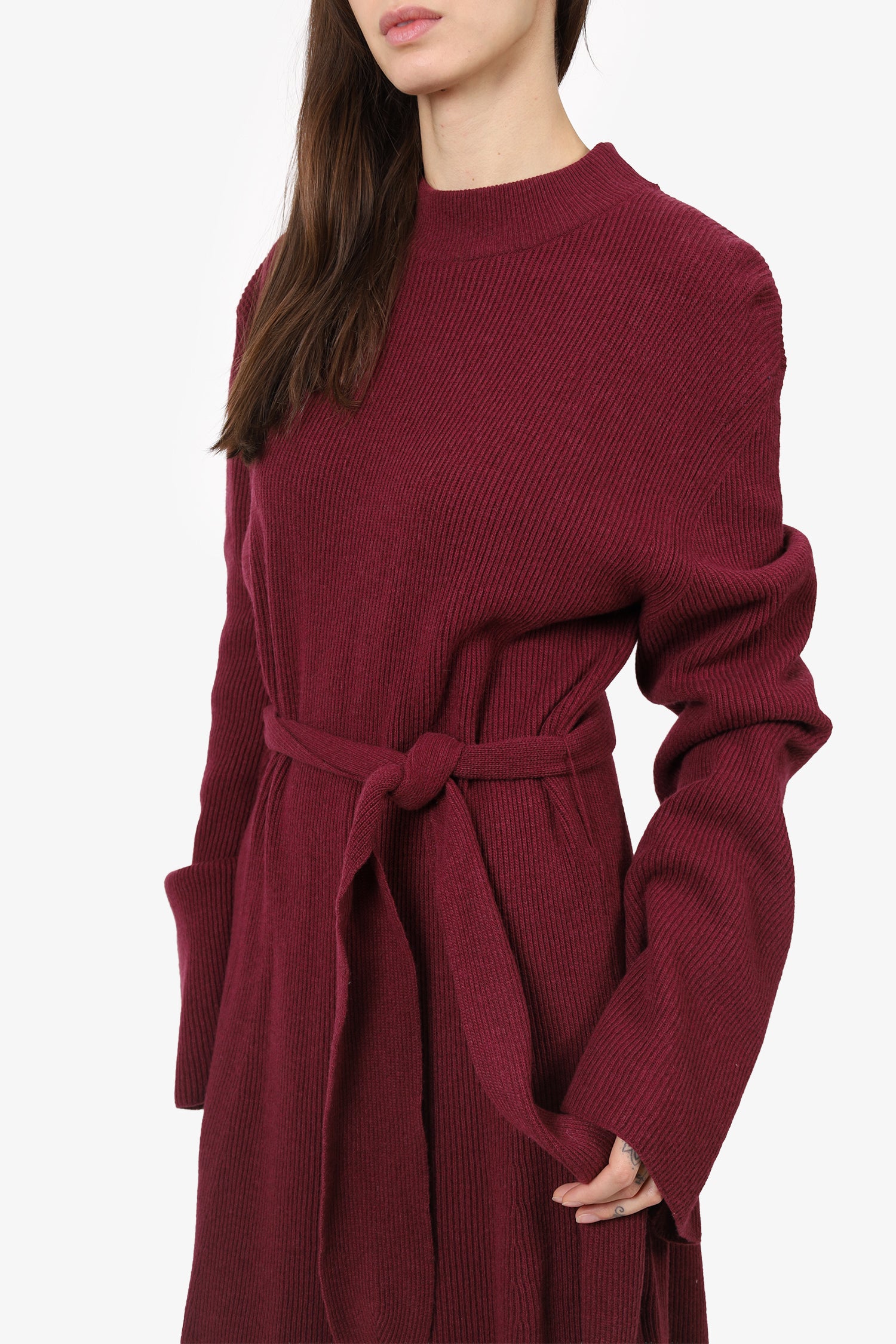 Refresh availabilityNanushka Burgundy Wool Knit Dress. Pull-on. Round neckline. Removable belt at waistline. Tonal stitching.