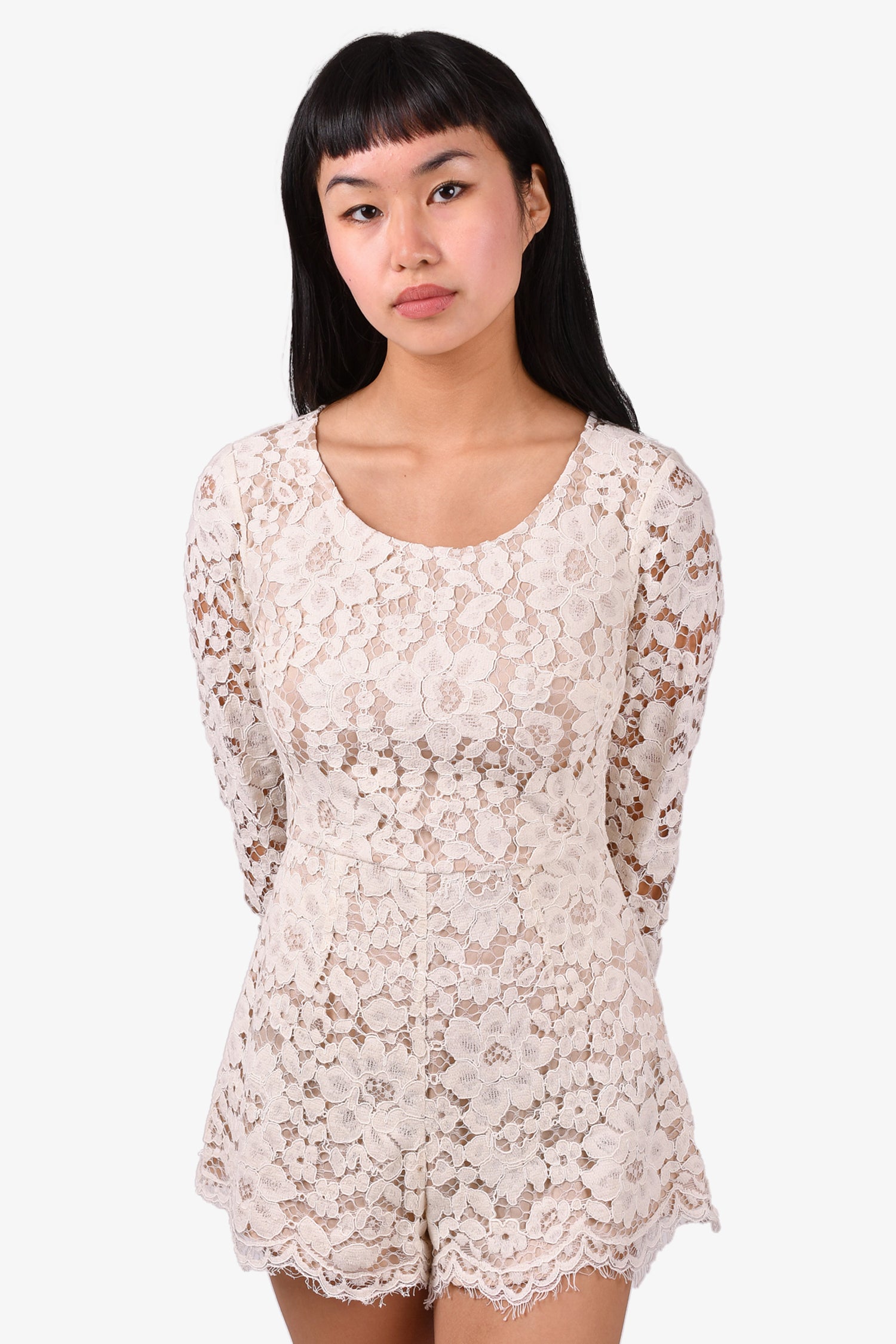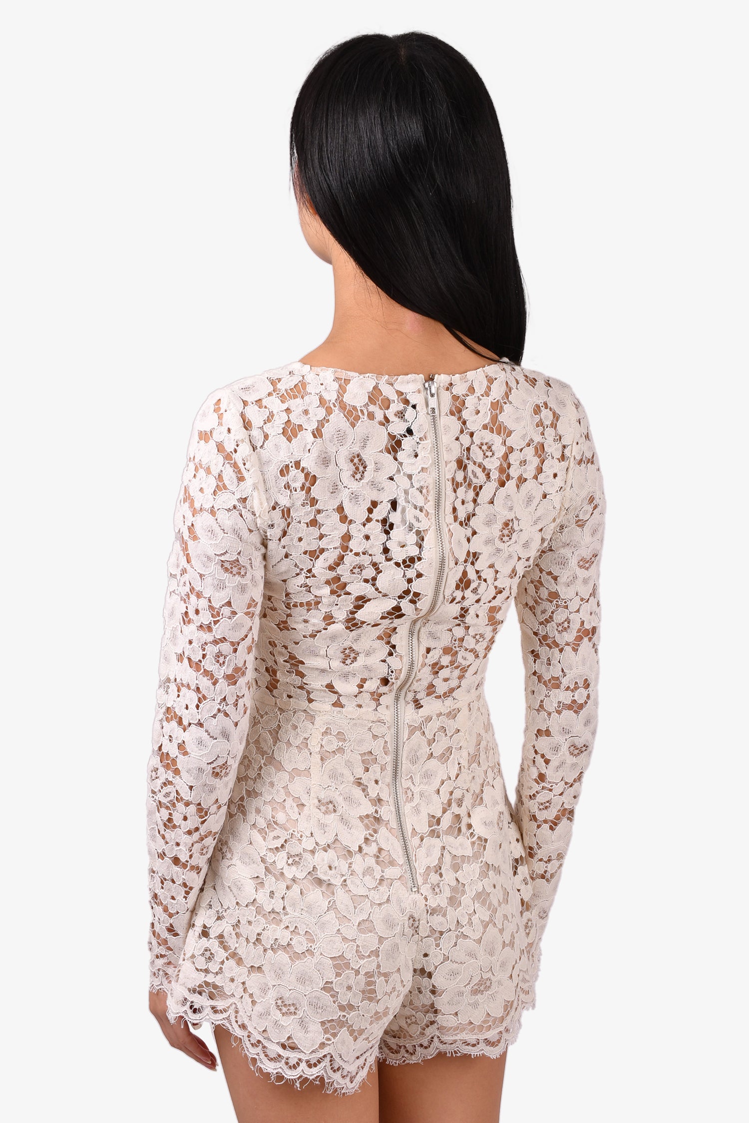 Refresh availabilityNBD White Lace Romper. Round neck. Rear zip and hook closure. Lined. Tonal stitching.