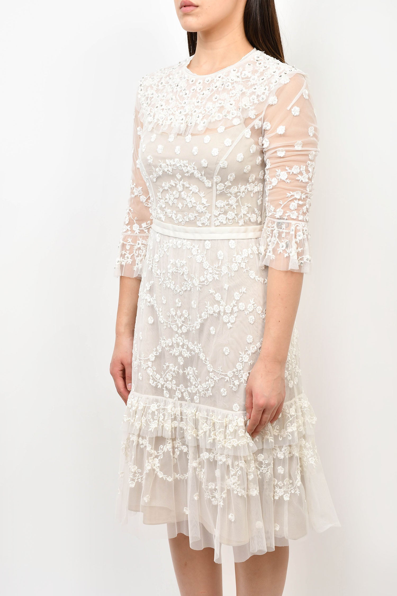 Refresh availabilityNeedle & Thread White Long Sleeve Dress. Back zip closure. Round neckline. Waistband detail. Beige interior lining. Flared detail on sleeves. Tonal stitching.
