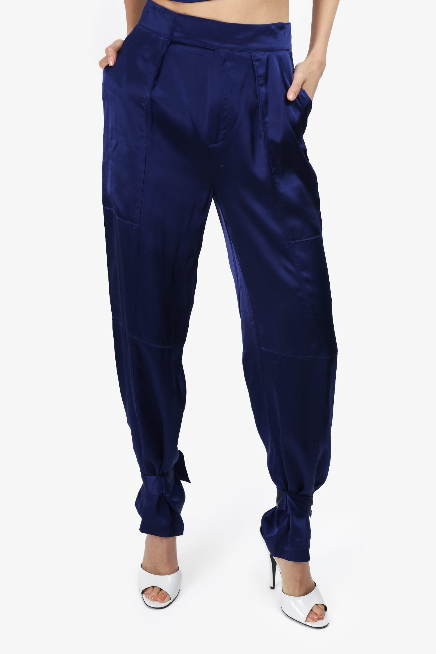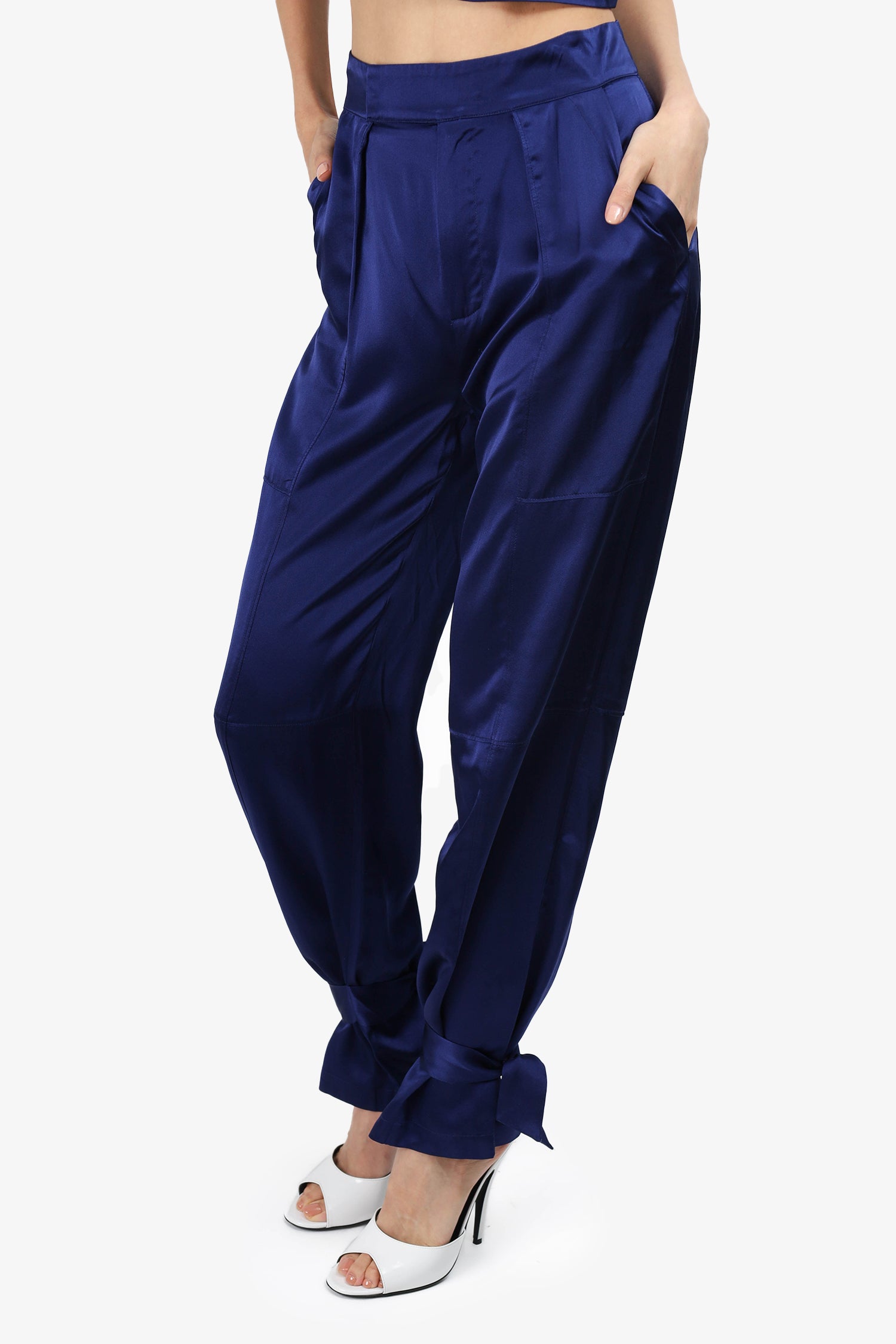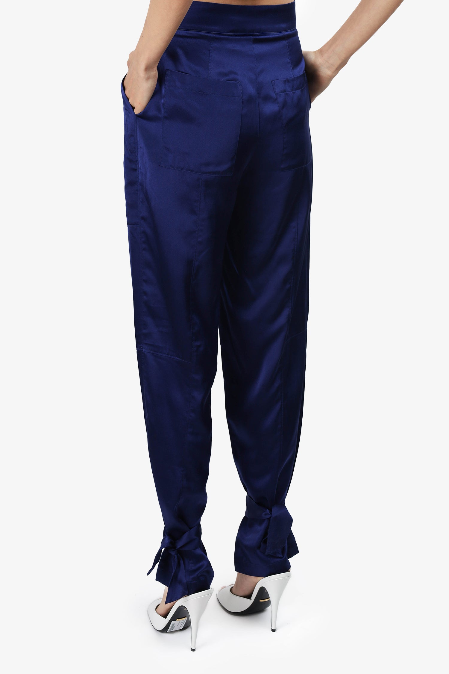 Refresh availabilityNicholas Navy Blue Silk Tie up Hem Pants Size 0. Zip and hook closure. Front and rear slip pockets. Tie-up detail on pant cuffs. Unlined. Tonal Stitching.