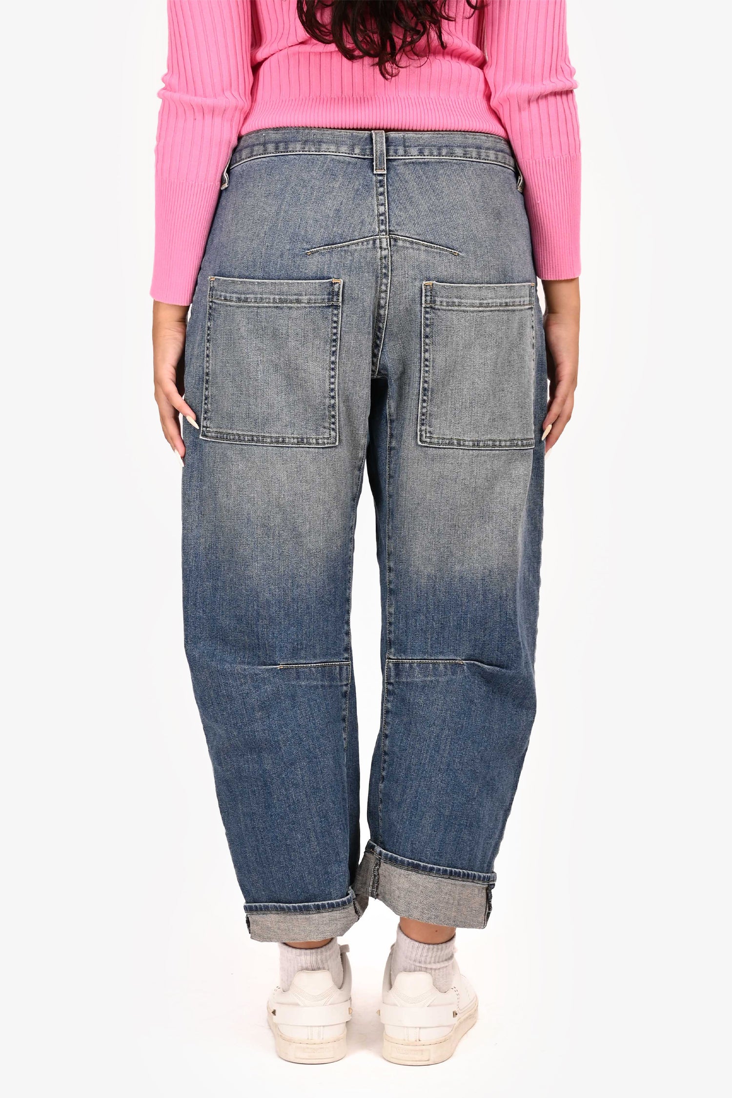 Refresh availabilityNili Lotan Navy Denim Shon Jeans. Zipper fly with button closure. Two front patch pockets with one slip pocket. Four symmetrical pleat details on the leg, front, and back. Two back pockets. Gold-tone hardware. Contrast stitching.