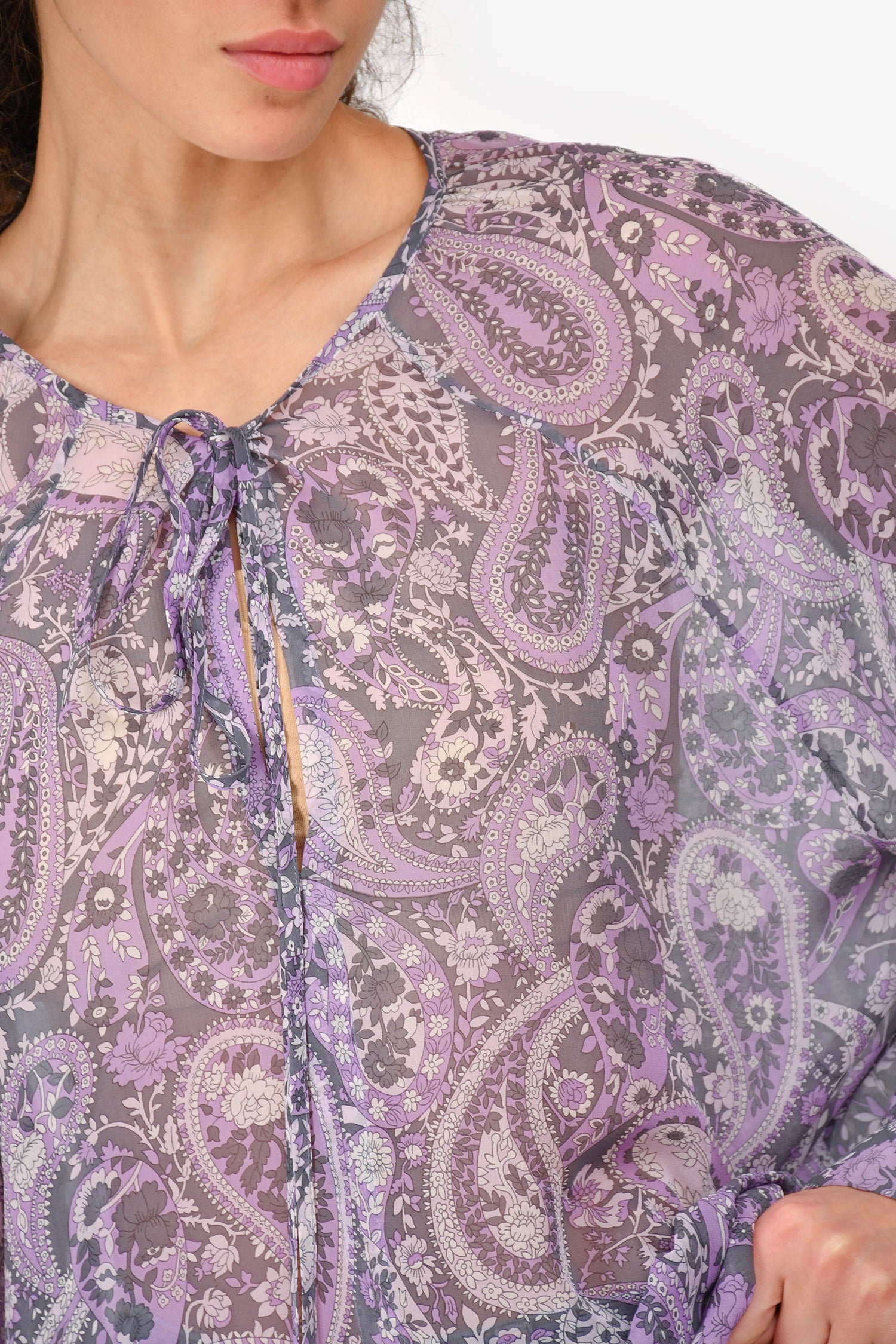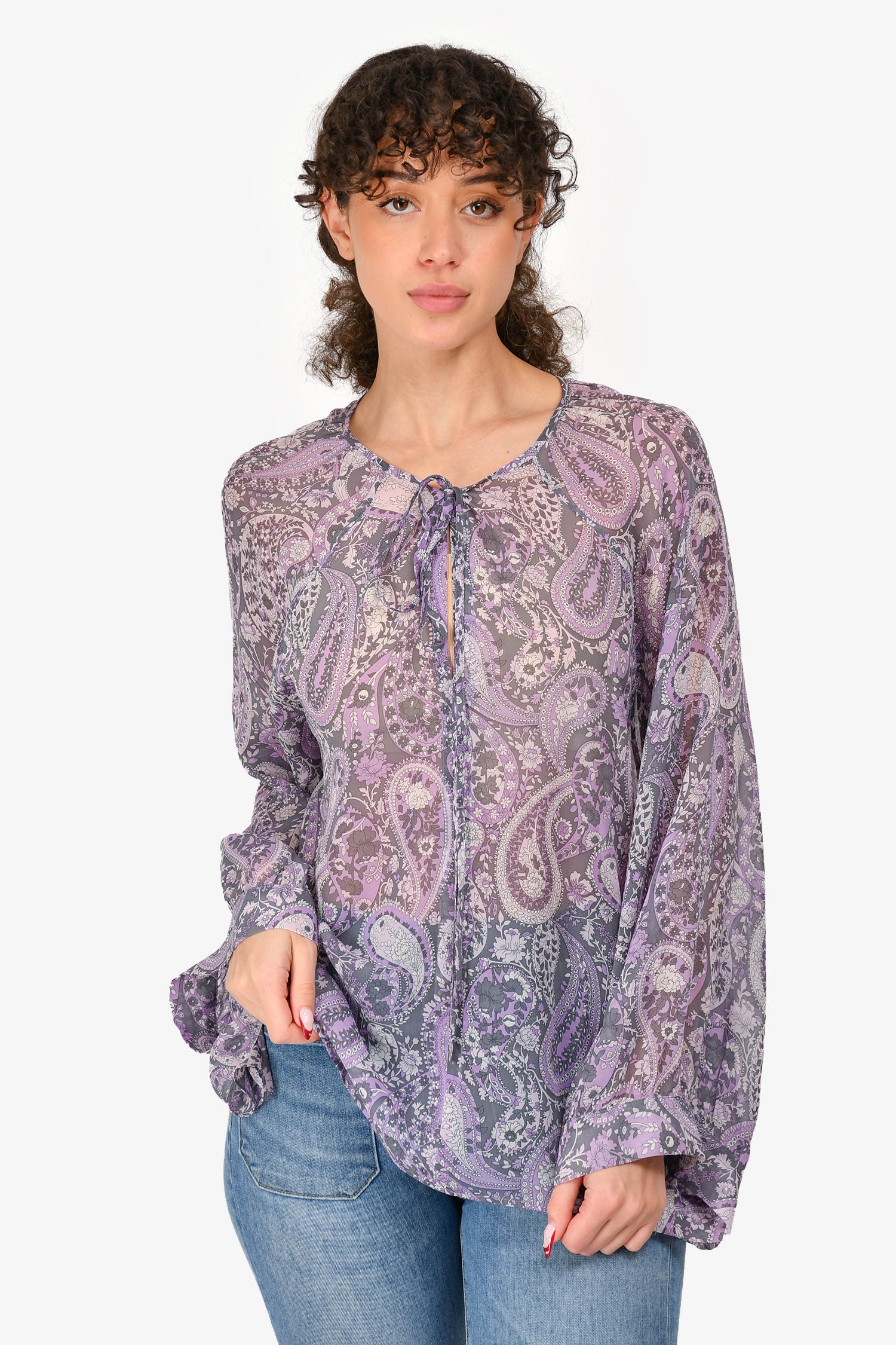 Refresh availabilityNili Lotan Purple Paisley Silk Blouse. Front tie closure. Sheer. Tonal stitching.