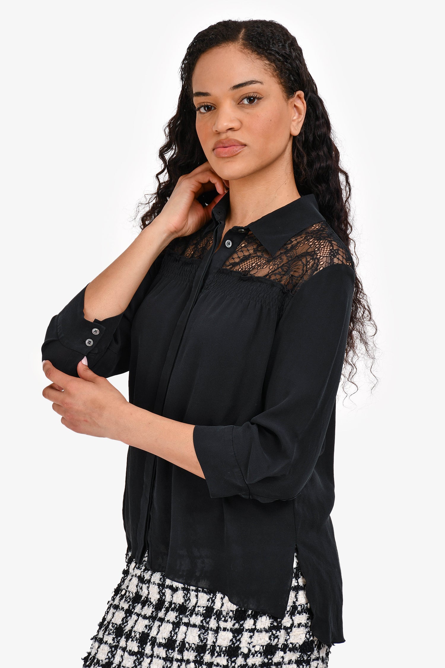 Refresh availabilityNina Ricci Black Silk Lace Blouse. Buttoned cuffs. Lace panel detailing at shoulders. Front button closure. Tonal stitching.