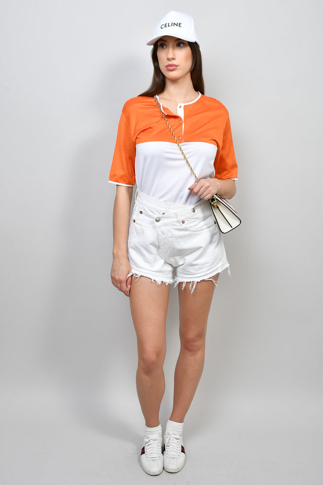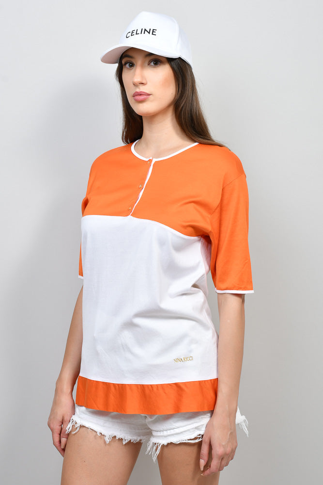 Refresh availabilityNina Ricci White/ Orange Colour Blocked T-Shirt. Round neckline. Front button closure. White trim. Unlined. Tonal stitching.