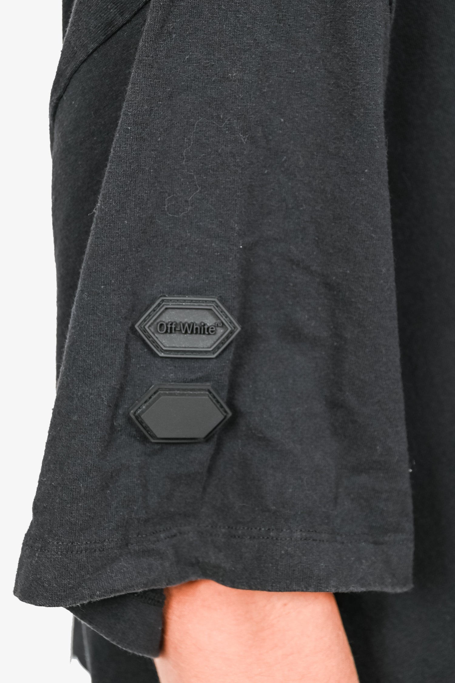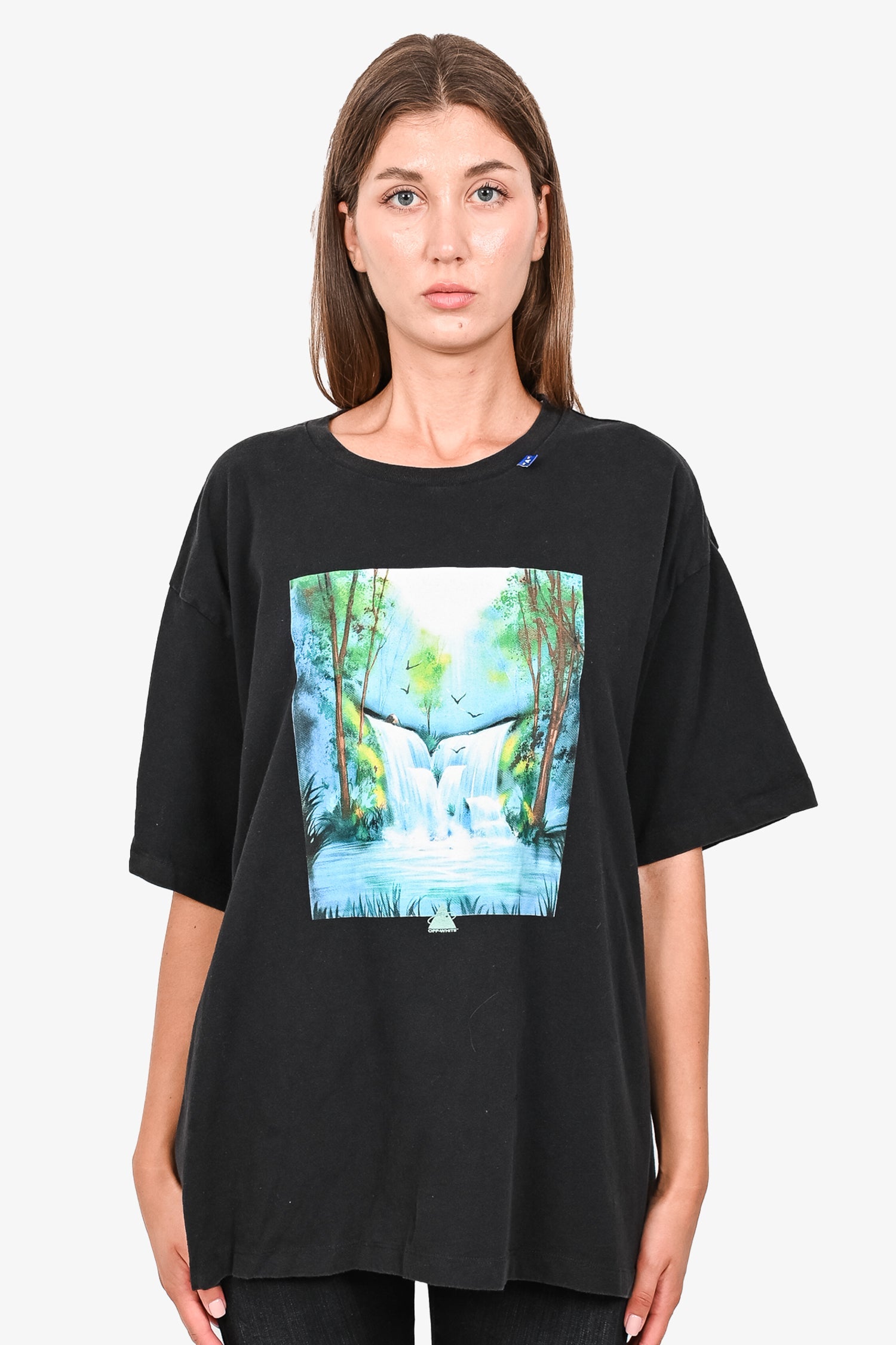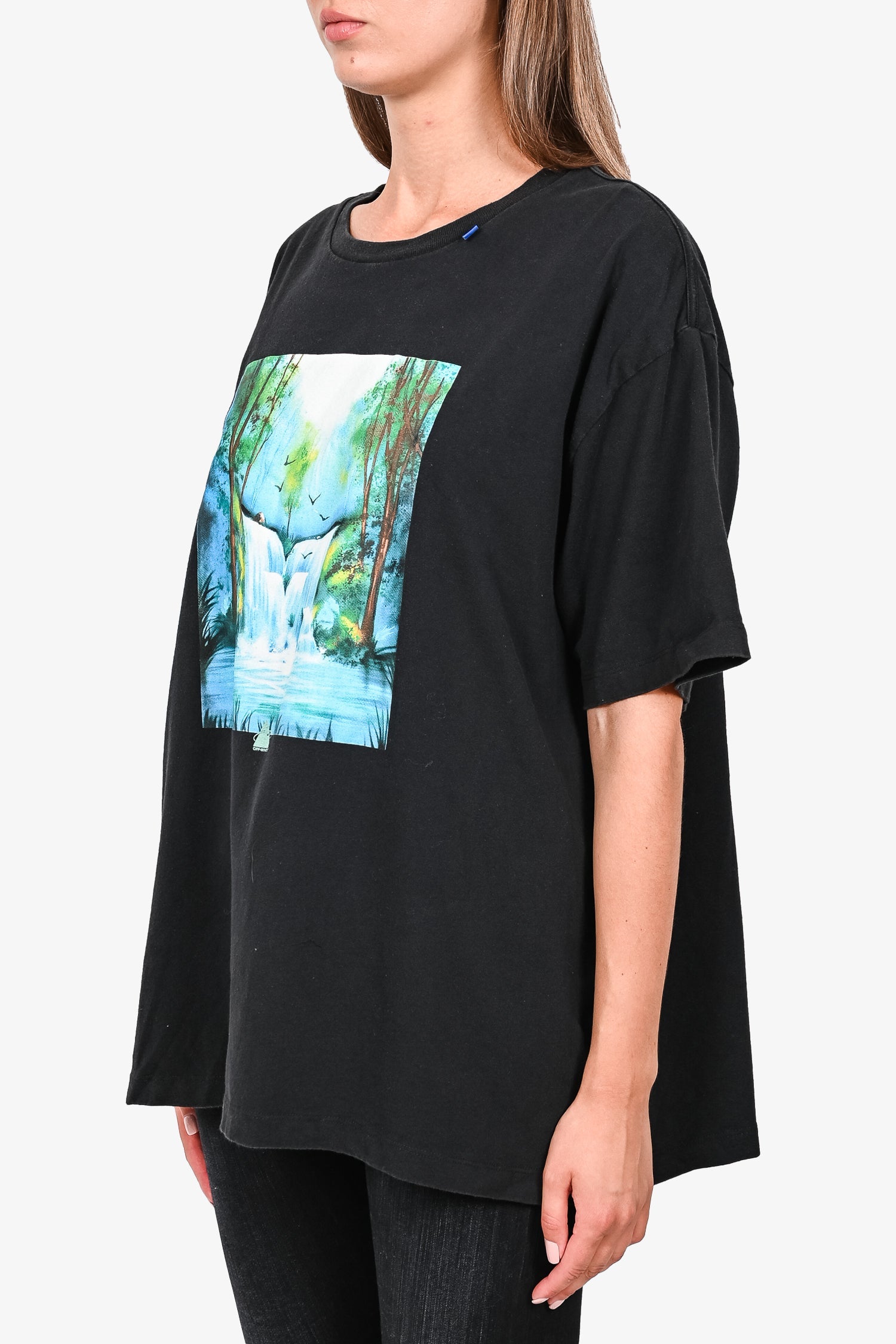 Refresh availabilityOff-White Black Cotton Blue/Yellow Graphic T-Shirt. Tonal stitching.