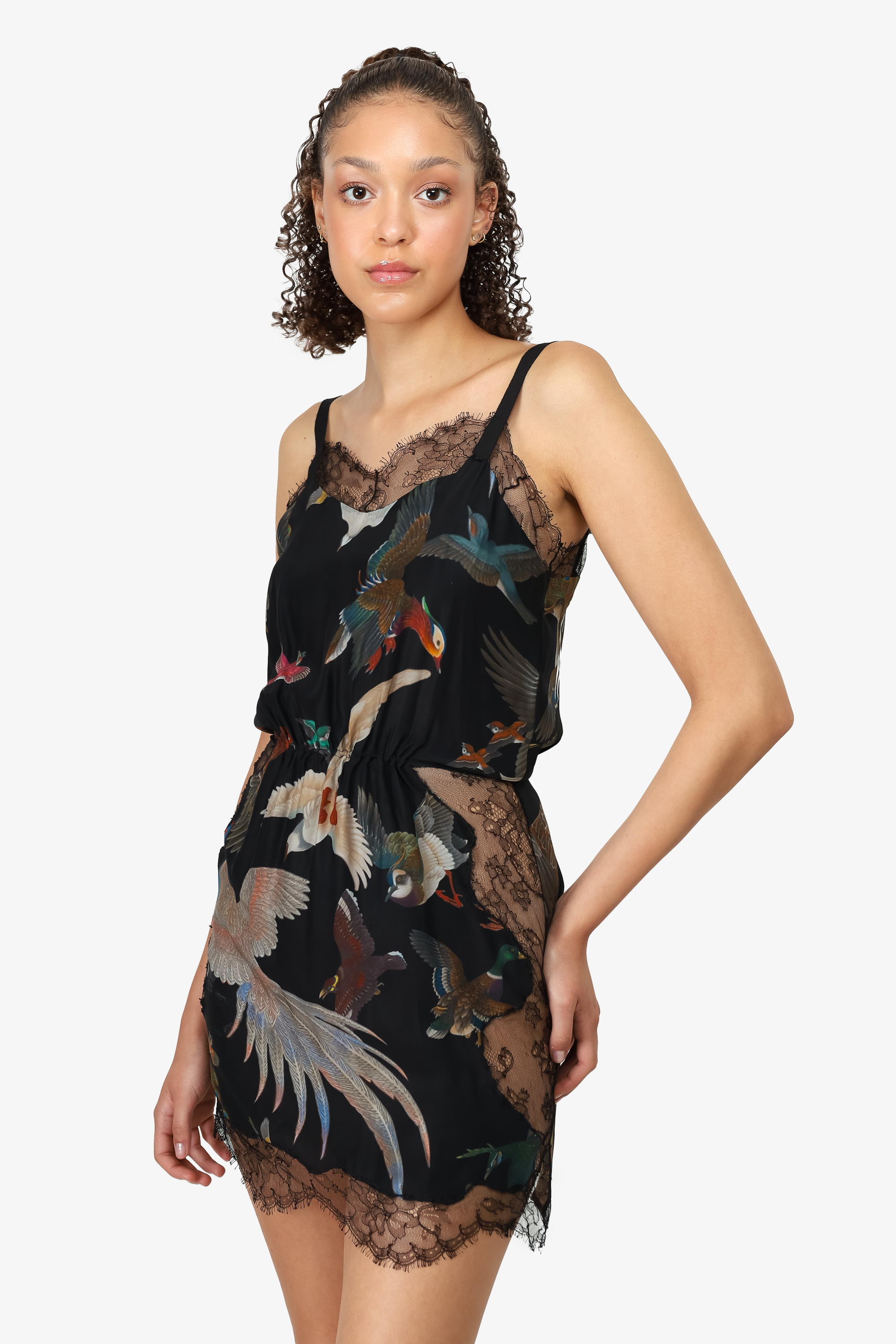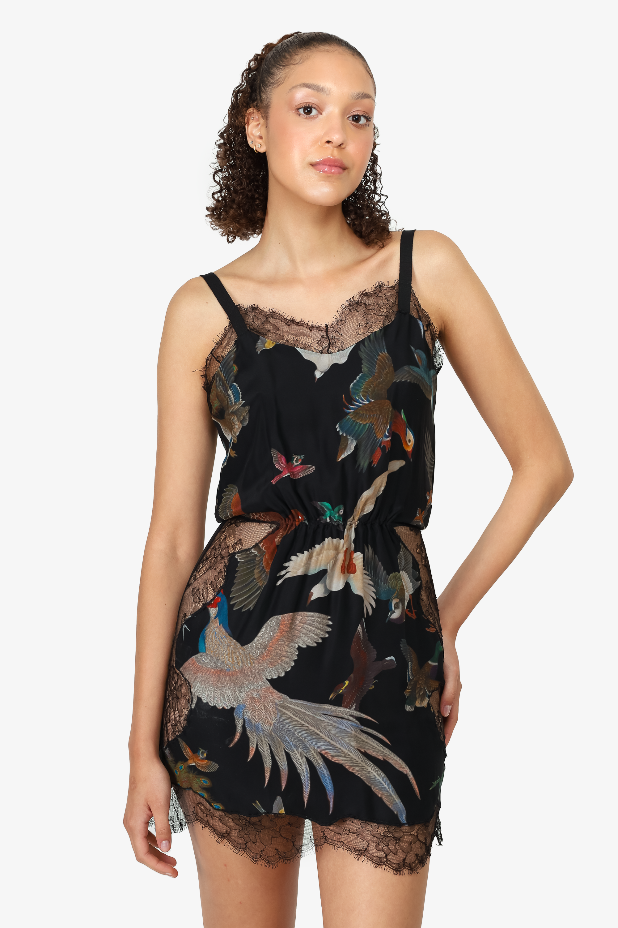 Refresh availabilityOff-White Black Silk Lace Bird Print Mini Dress. Unlined. V-neckline. Pull-on. Cinched waist. "Woman" font on back. Tonal stitching.