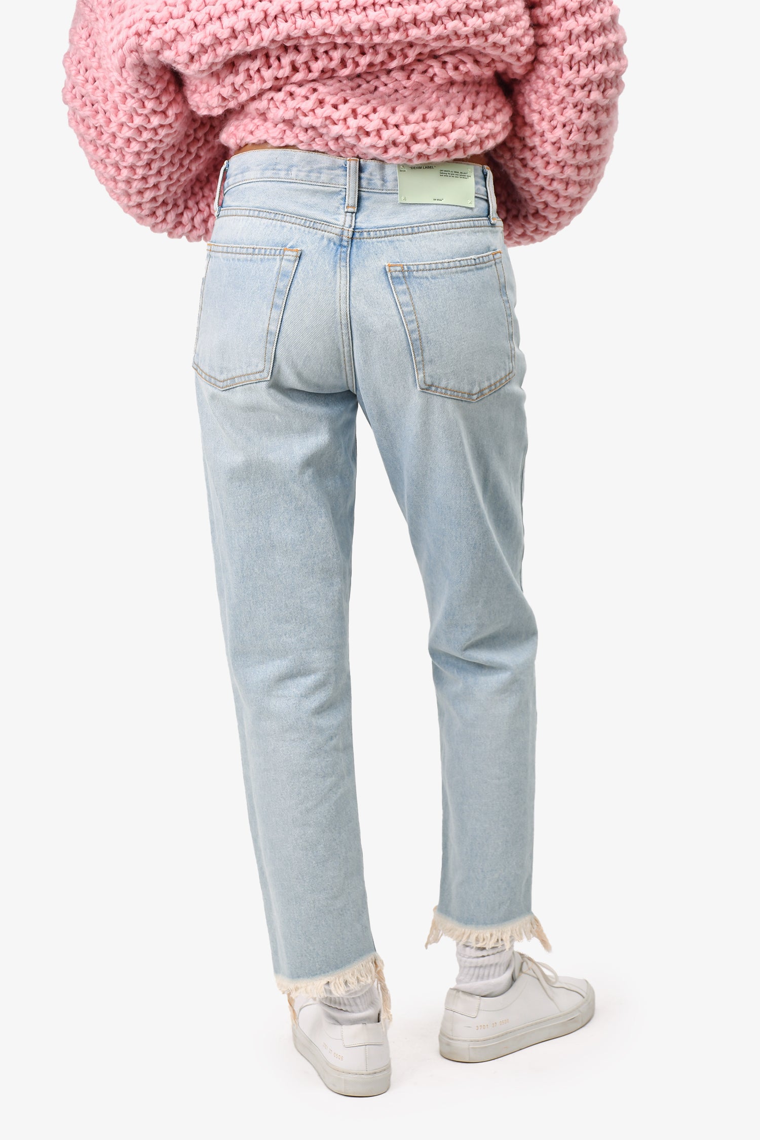 Refresh availabilityOff-White Blue Denim Distressed Cuff Jeans. Light wash. Four button-up closure. Silver-tone hardware. Two front and back pockets. Distressed at the cuff. Tonal stitching.