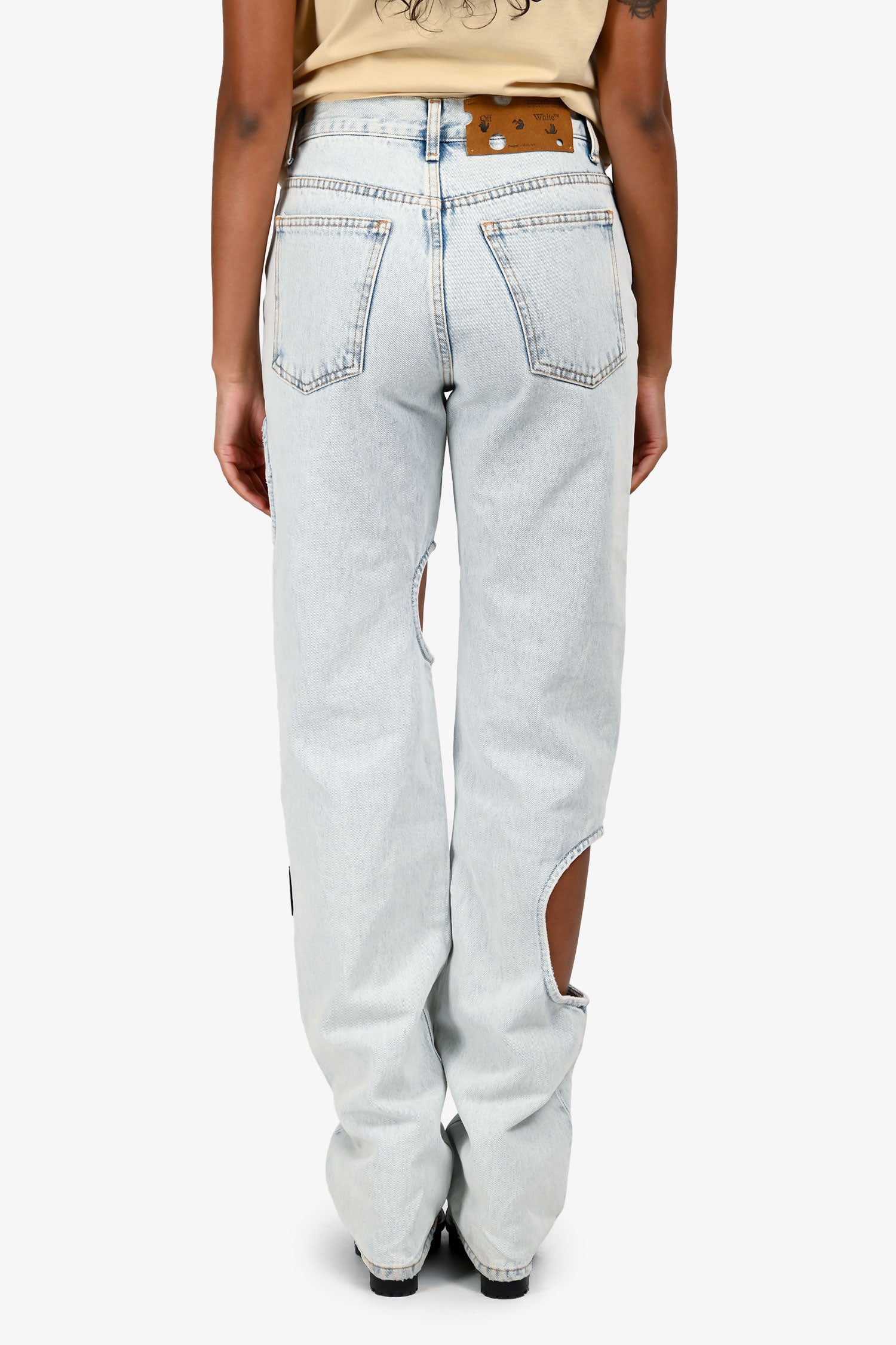 Refresh availabilityOff-White Light Blue Denim Paper Clip Cut Out Jeans. Pull-on. Zipper and button closure in the front. Belt loops at the waist. Classic 5-pocket style. Silver-tone hardware. Tonal stitching.