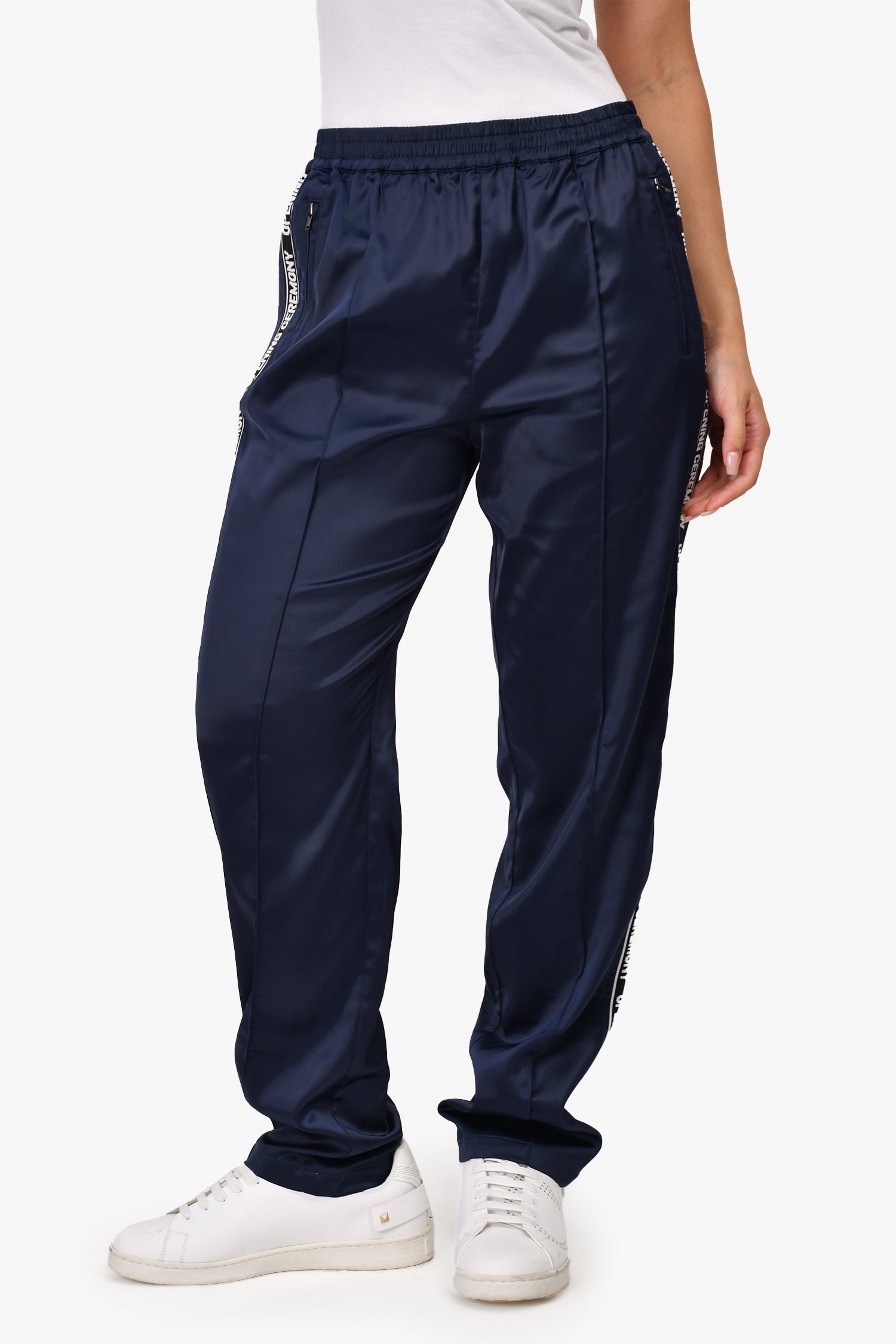 Refresh availabilityOpening Ceremony Navy Logo Side Detailed Pants. Elasticized waist. Front zip pockets.