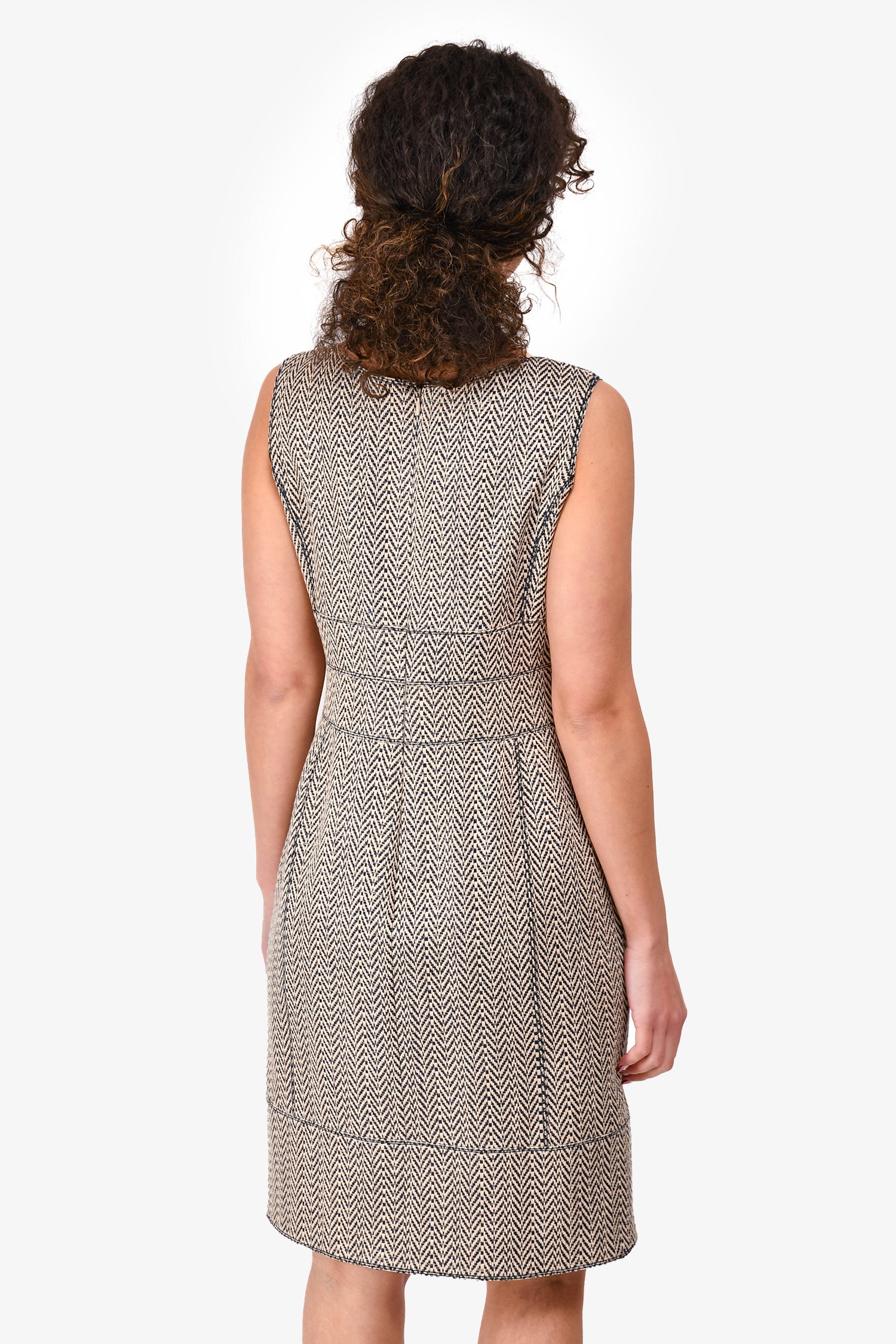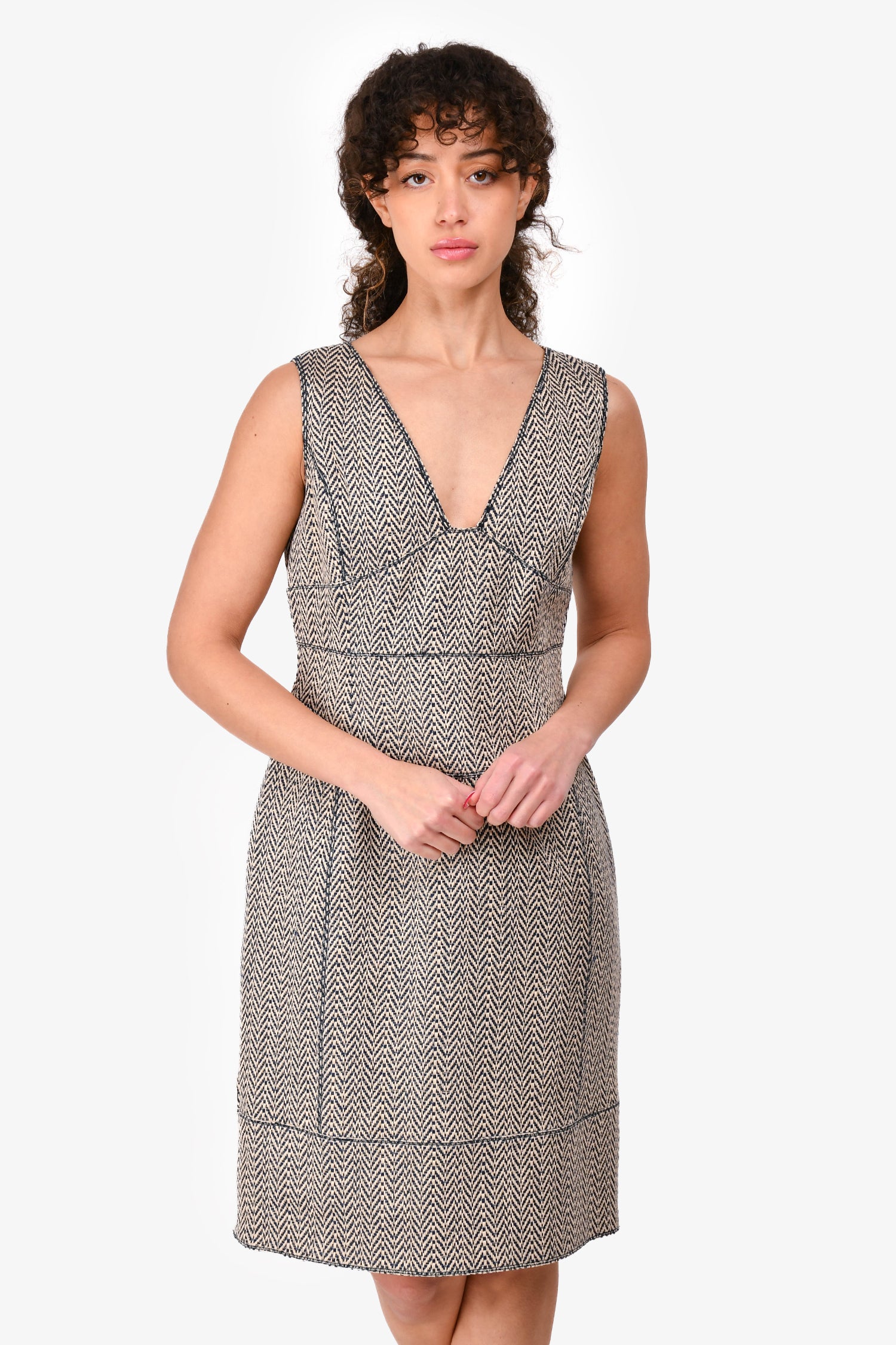 Refresh availabilityOscar de la Renta Beige Tweed Sleeveless Dress. V-neck. Rear zip and hook closure. Lined. Tonal stitching.
