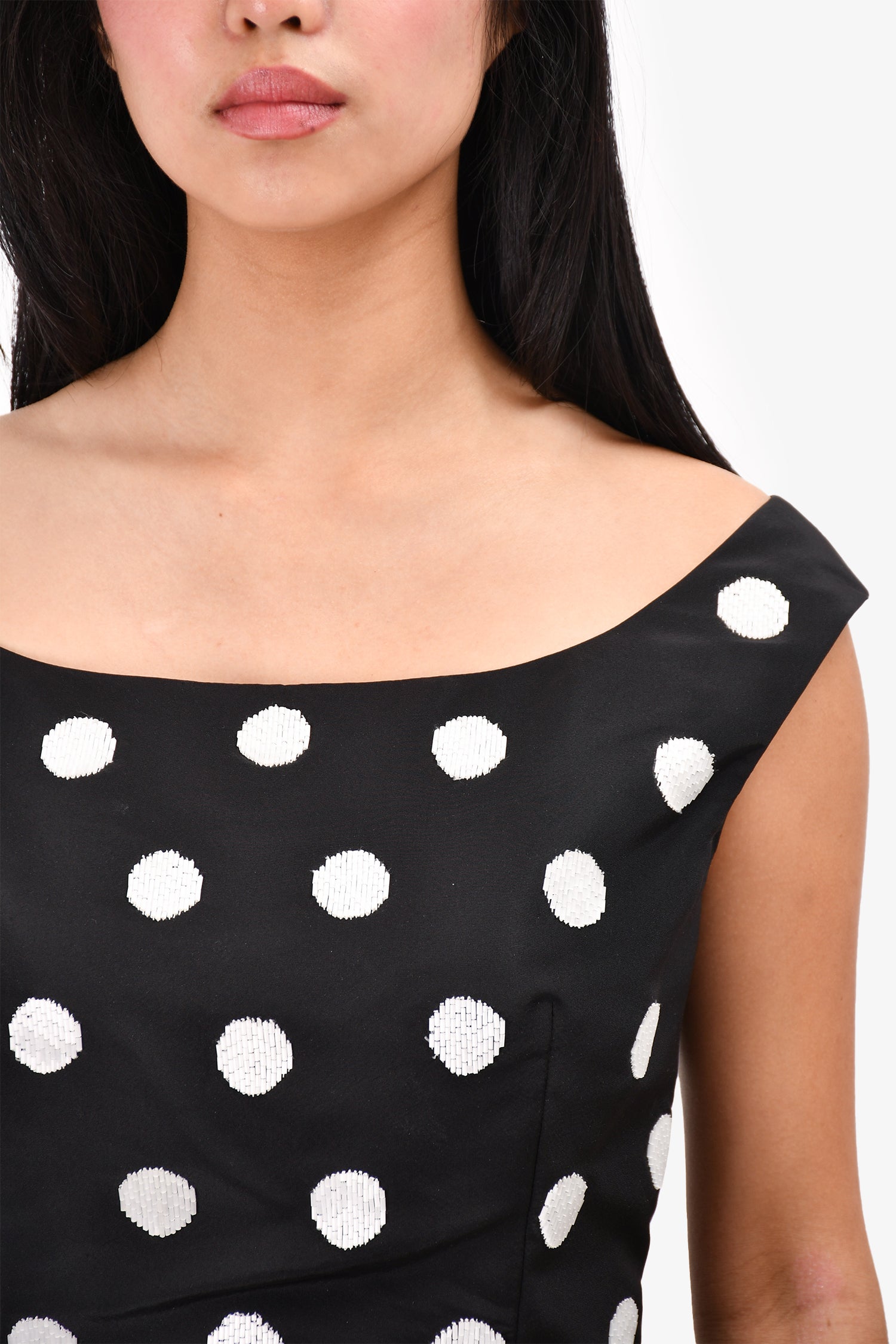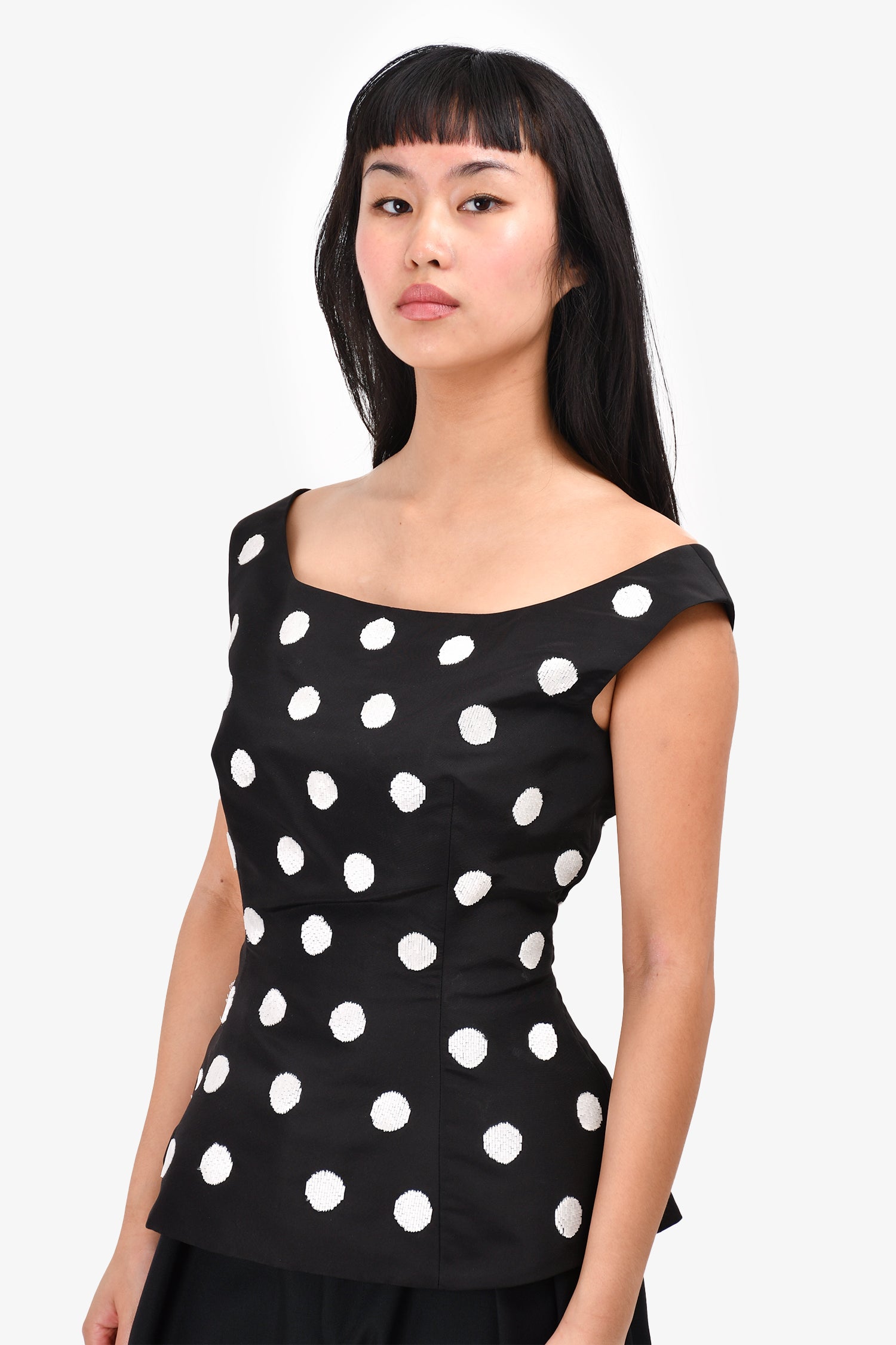 Refresh availabilityOscar De La Renta Black Silk Sequin Polka Dot Peplum Top. Rear zip and hook closure. Lined.