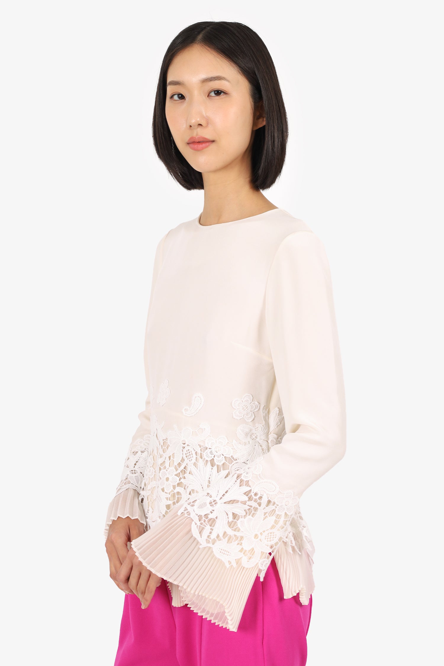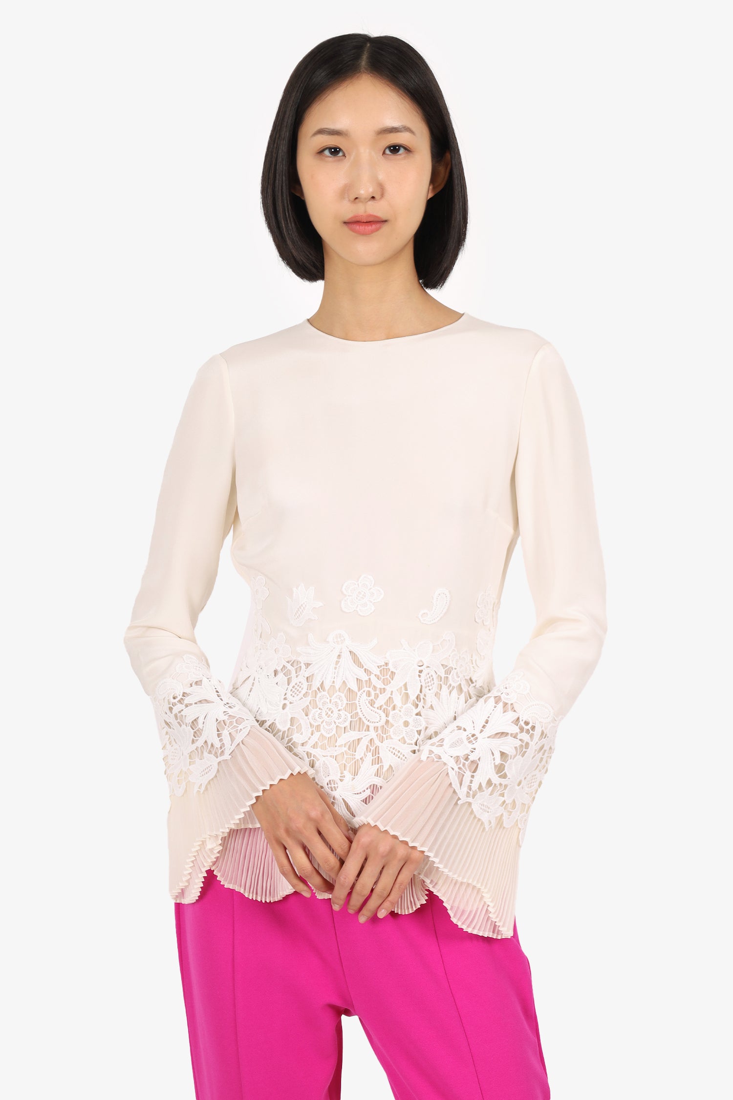 Refresh availabilityOscar De la Renta Cream Silk/Lace Pleated Detail Blouse. Pull-on. Round neckline. Rear keyhole with hook closure. Side zip closure. Pleated underlay. Tonal stitching.