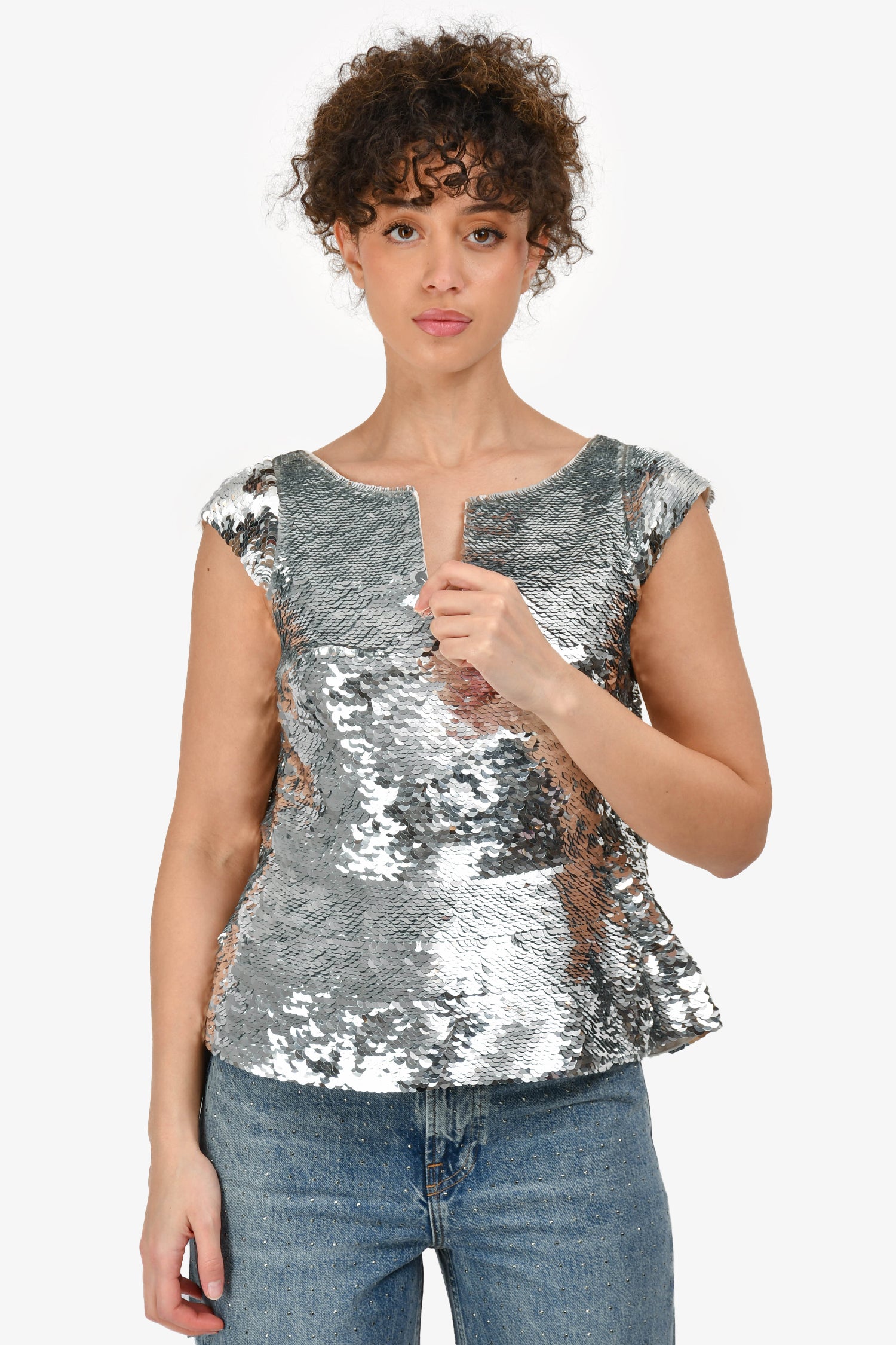 Refresh availabilityOscar de la Renta Silver Sequin V-Neck Cap Sleeve Top. Side zip closure. Lined. Tonal stitching.
