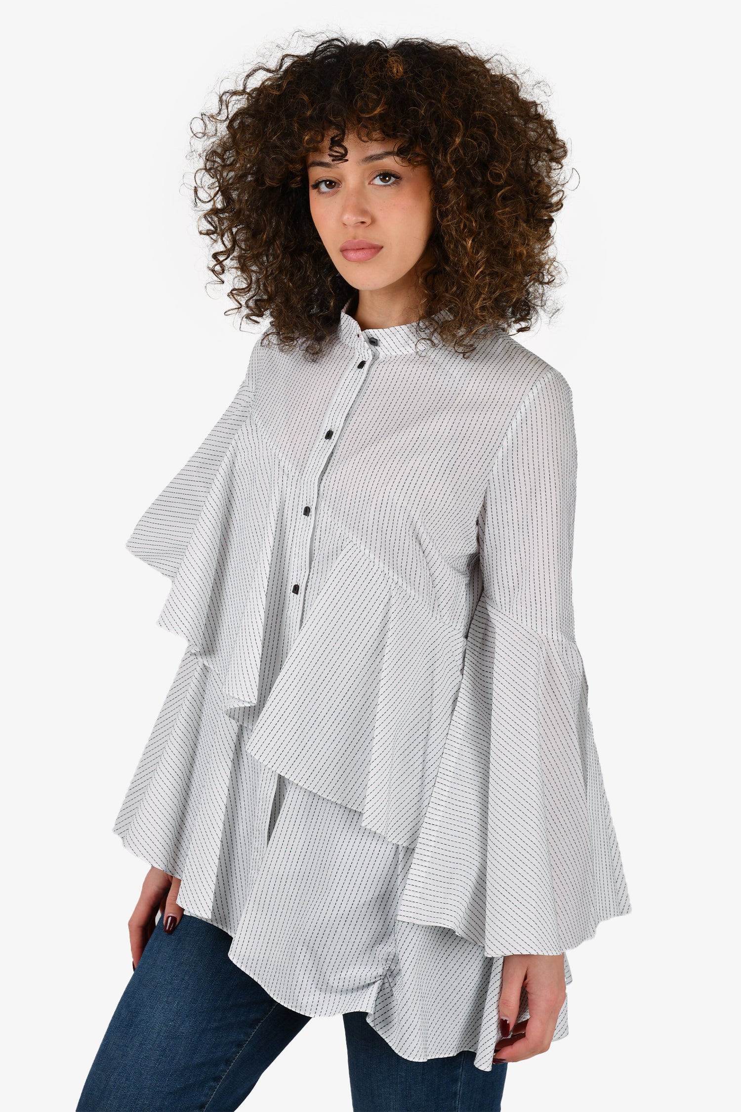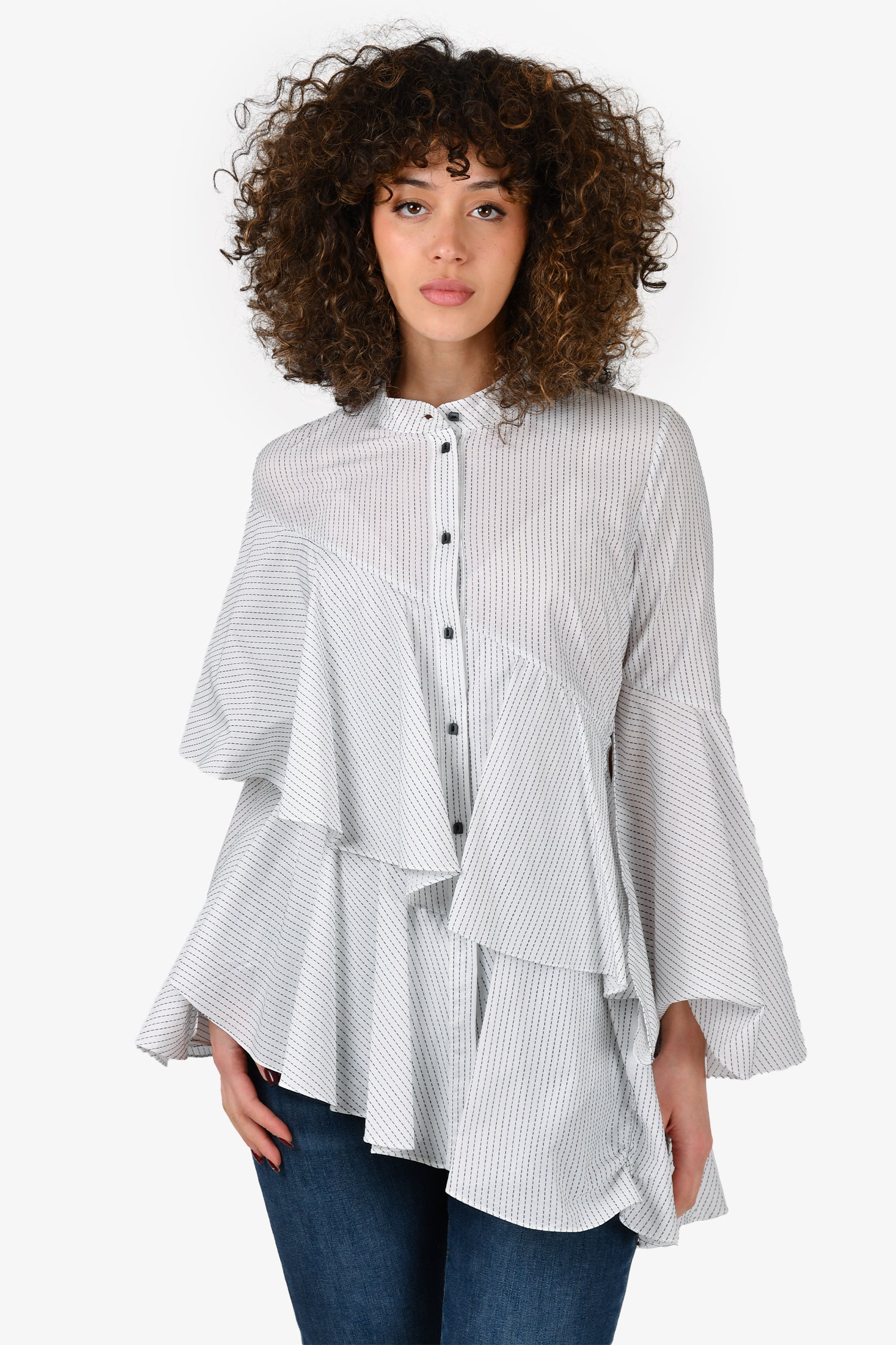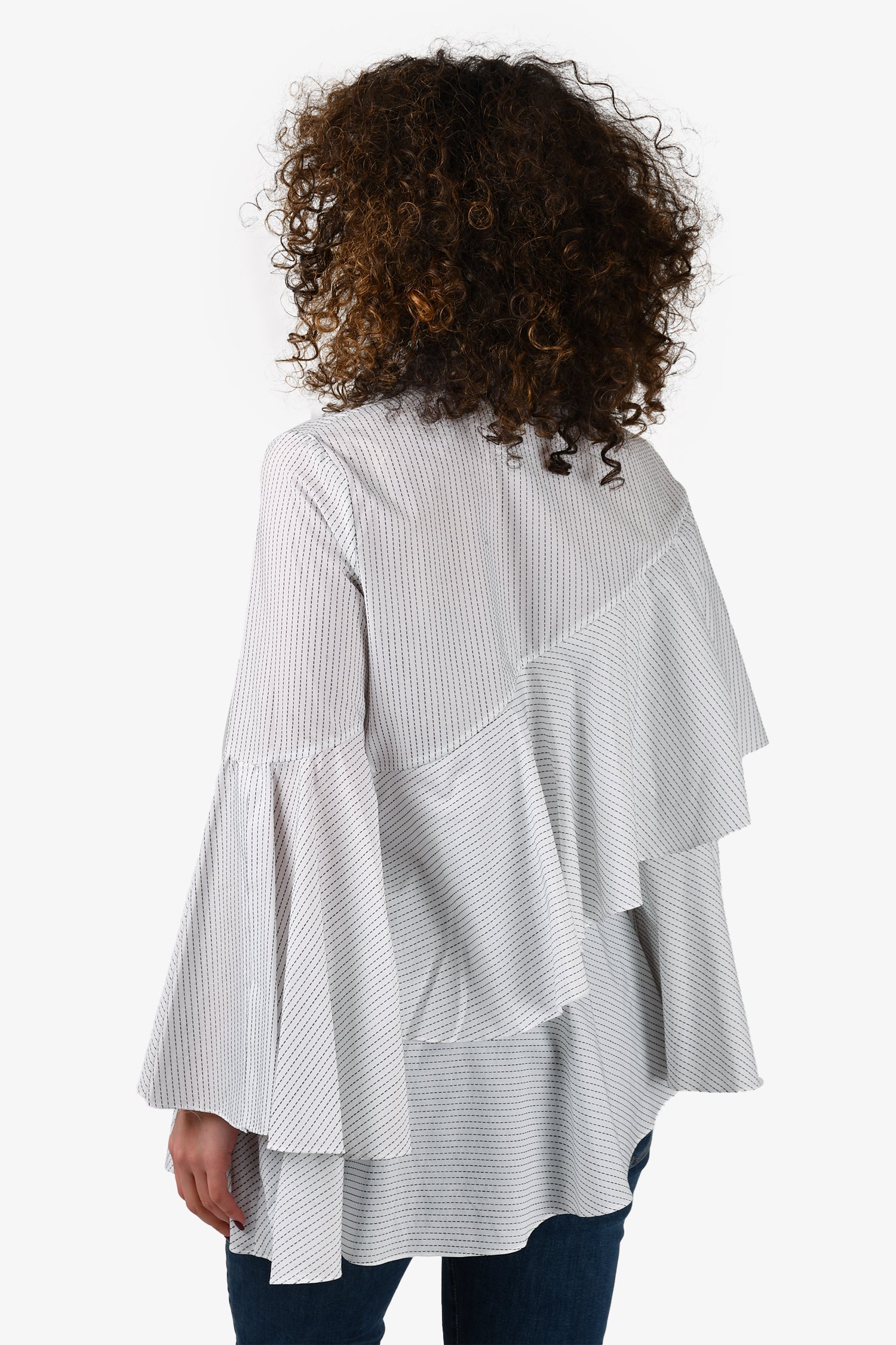 Refresh availabilityOsman White/Black Striped Ruffle Blouse. Front button-up closure. Flared cuffs. Tonal stitching.