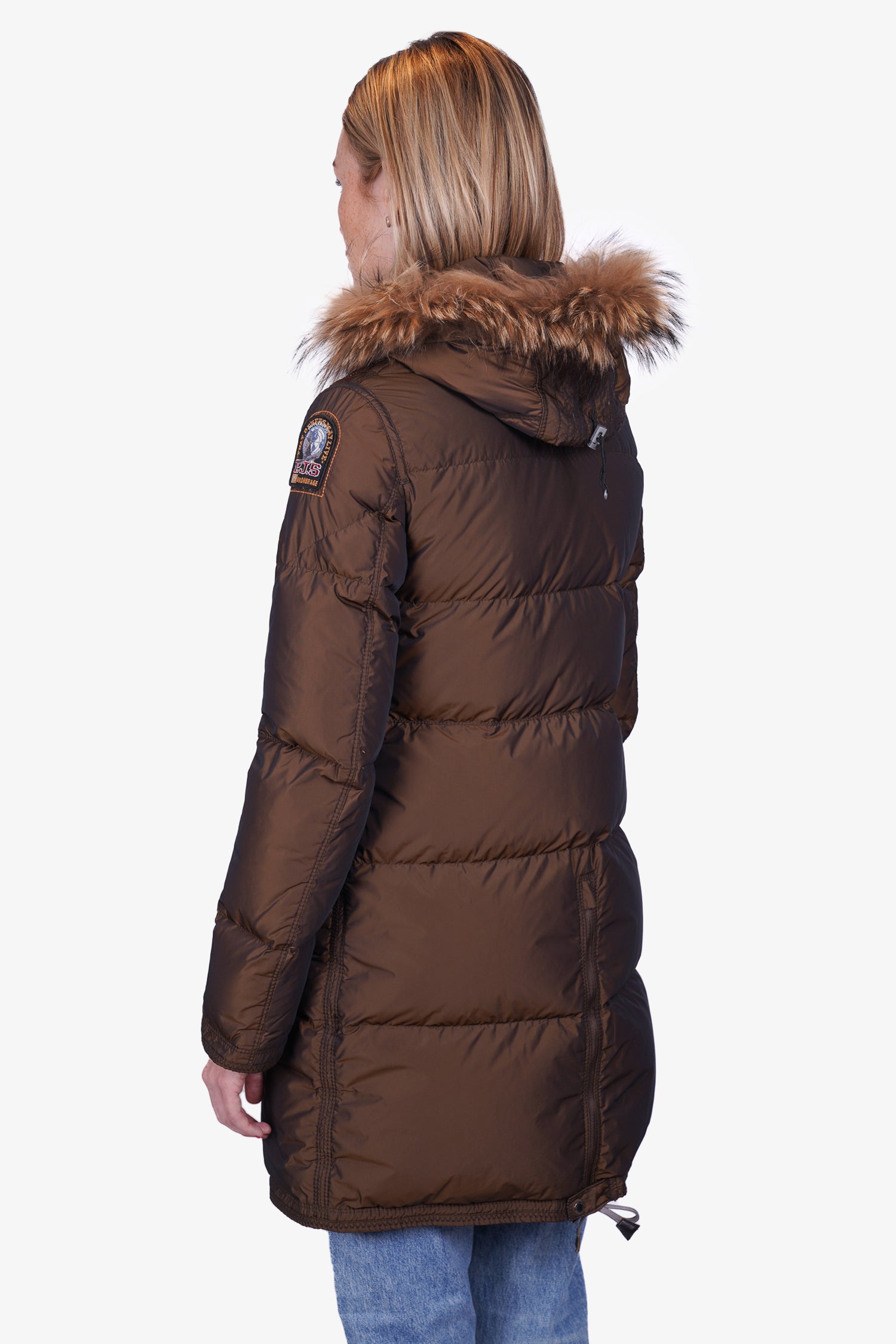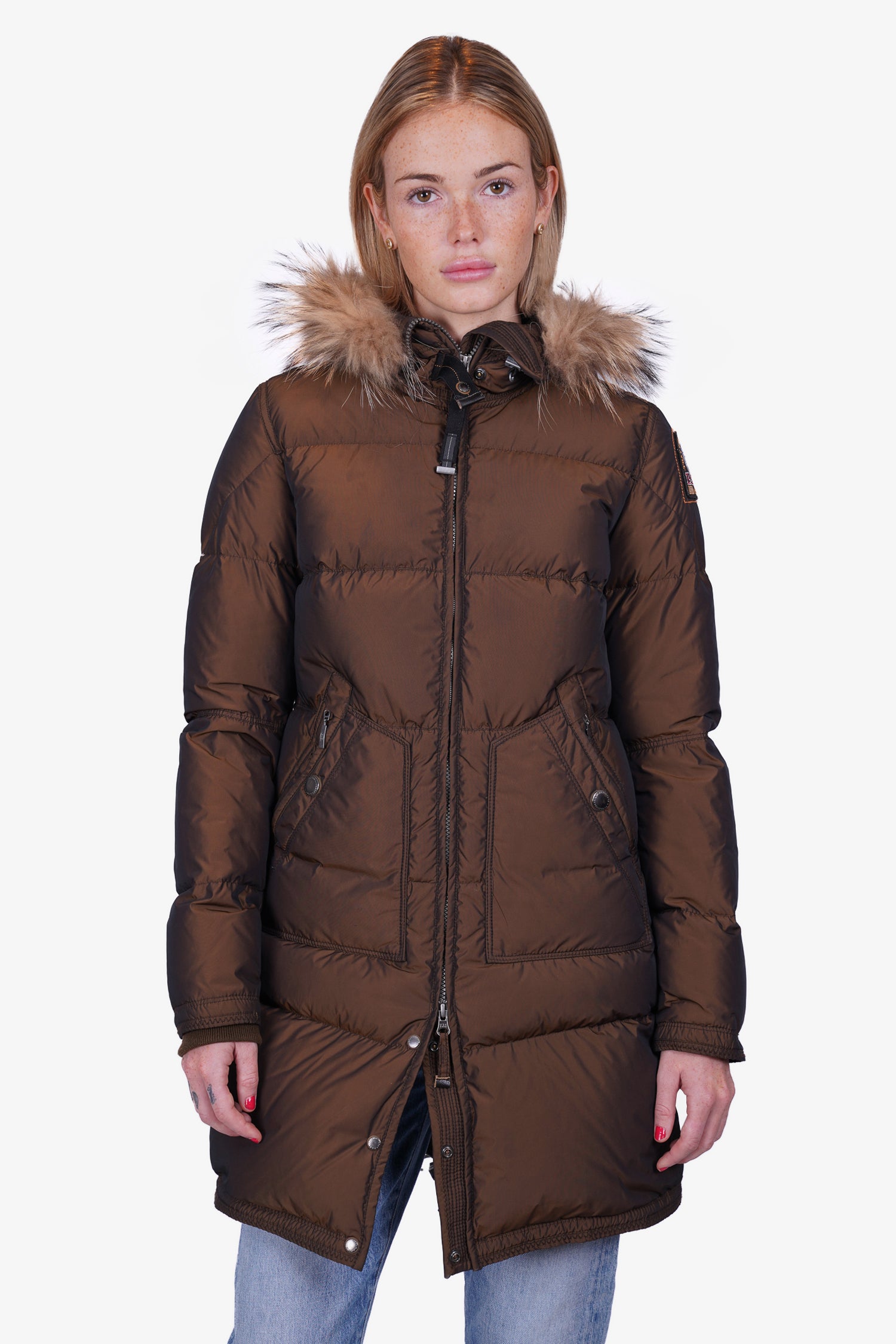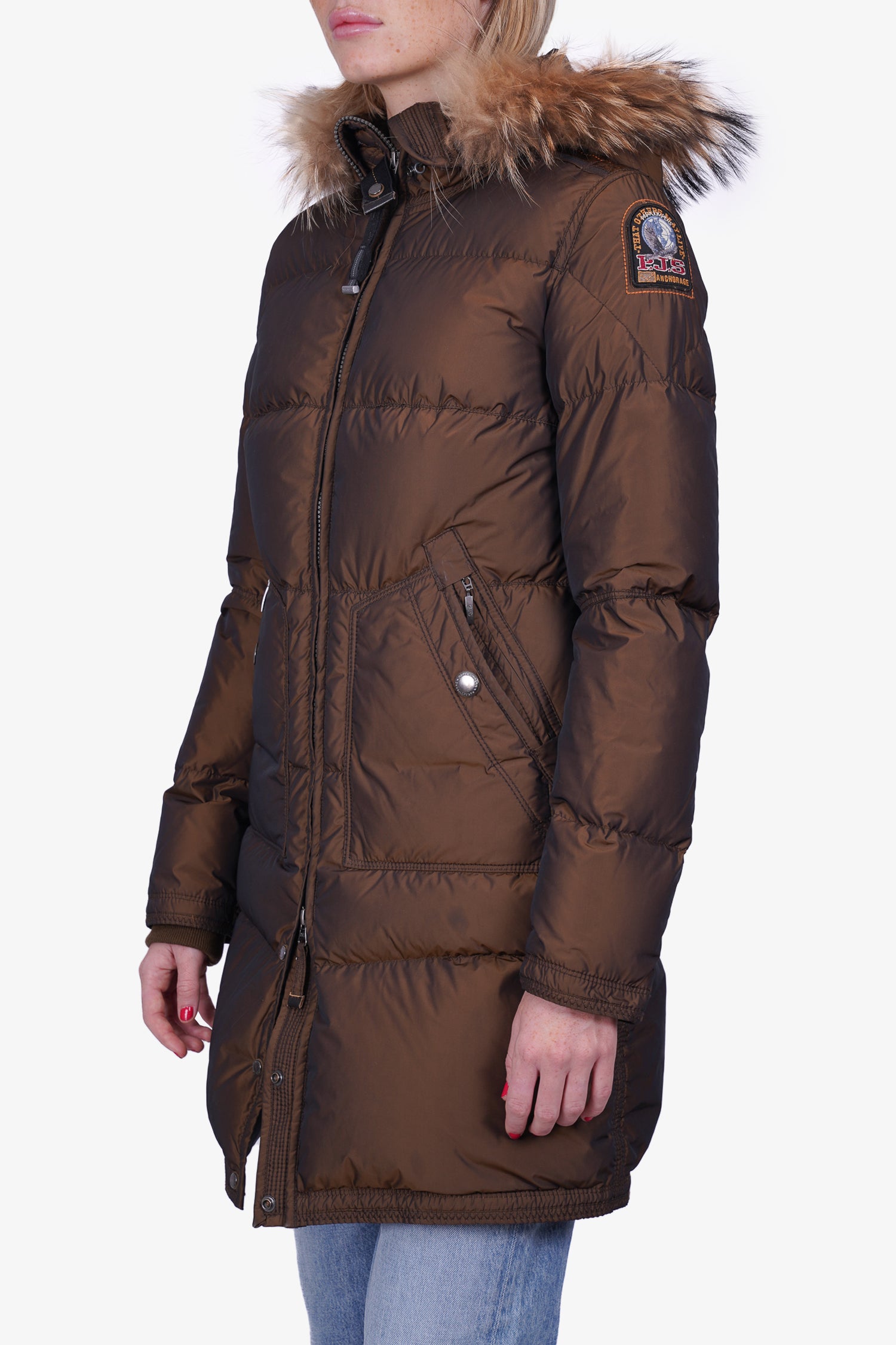 Refresh availabilityParajumpers Olive Down Ski Jacket with Fur Trim. Front zip and snap-button closure. Detachable hood. Dural slip pockets on the sides with zip and button closures. Ribbed cuffs. Gun-metal tone hardware. Tonal stitching.
