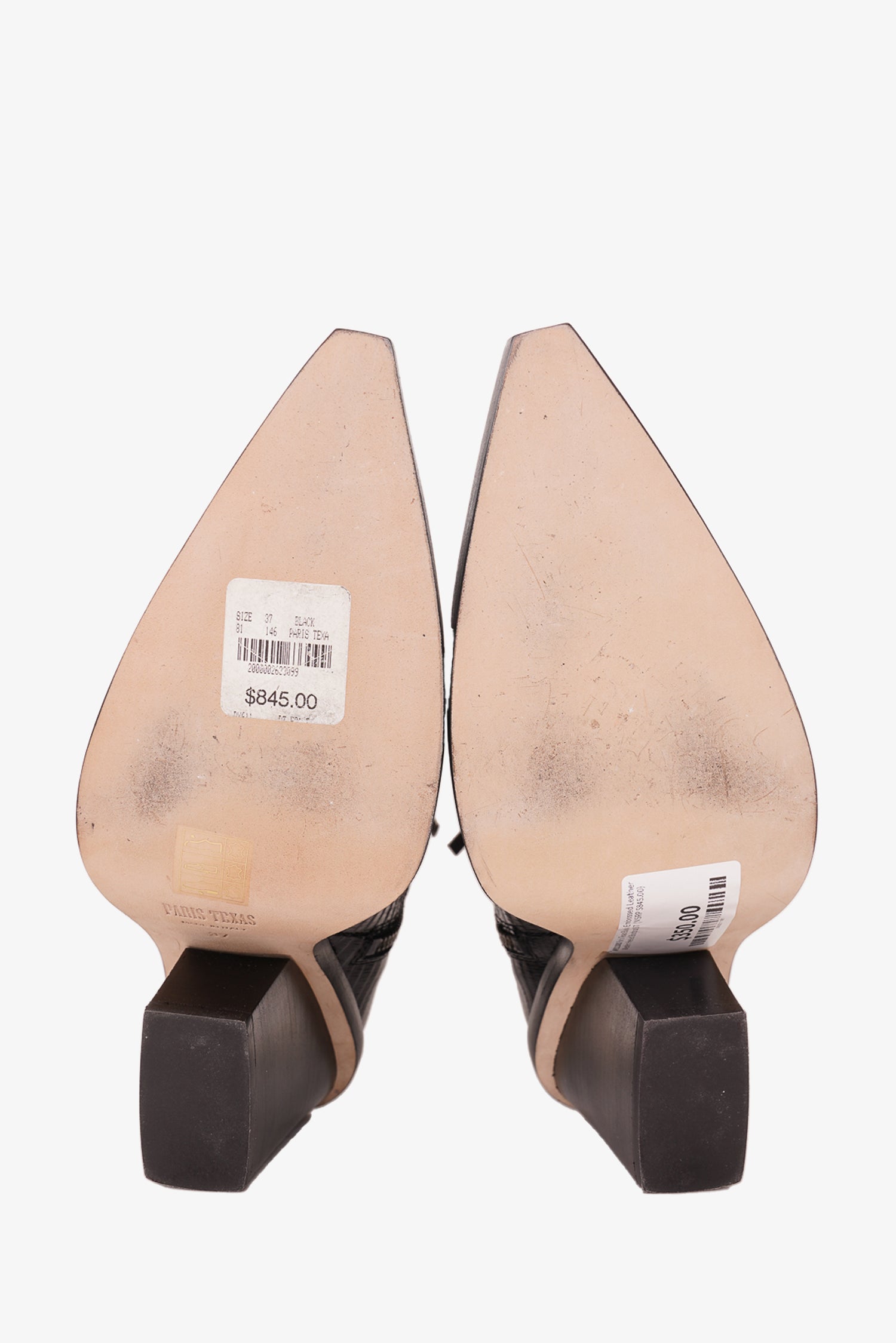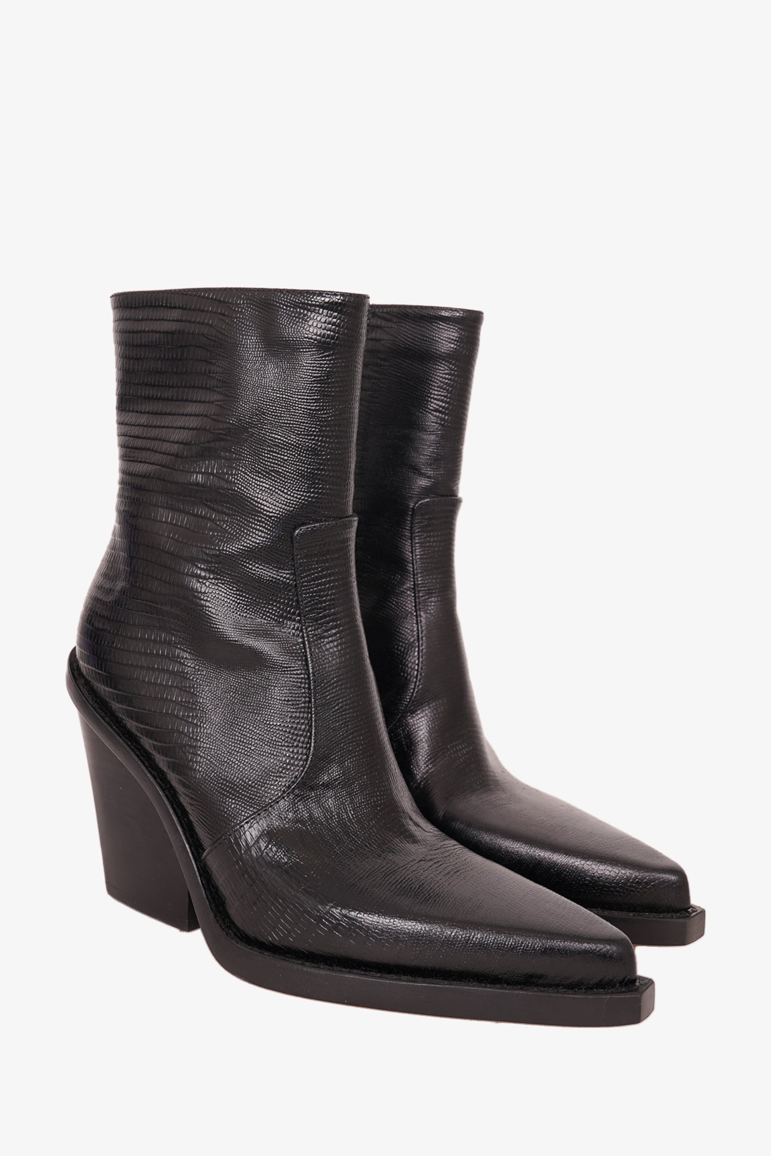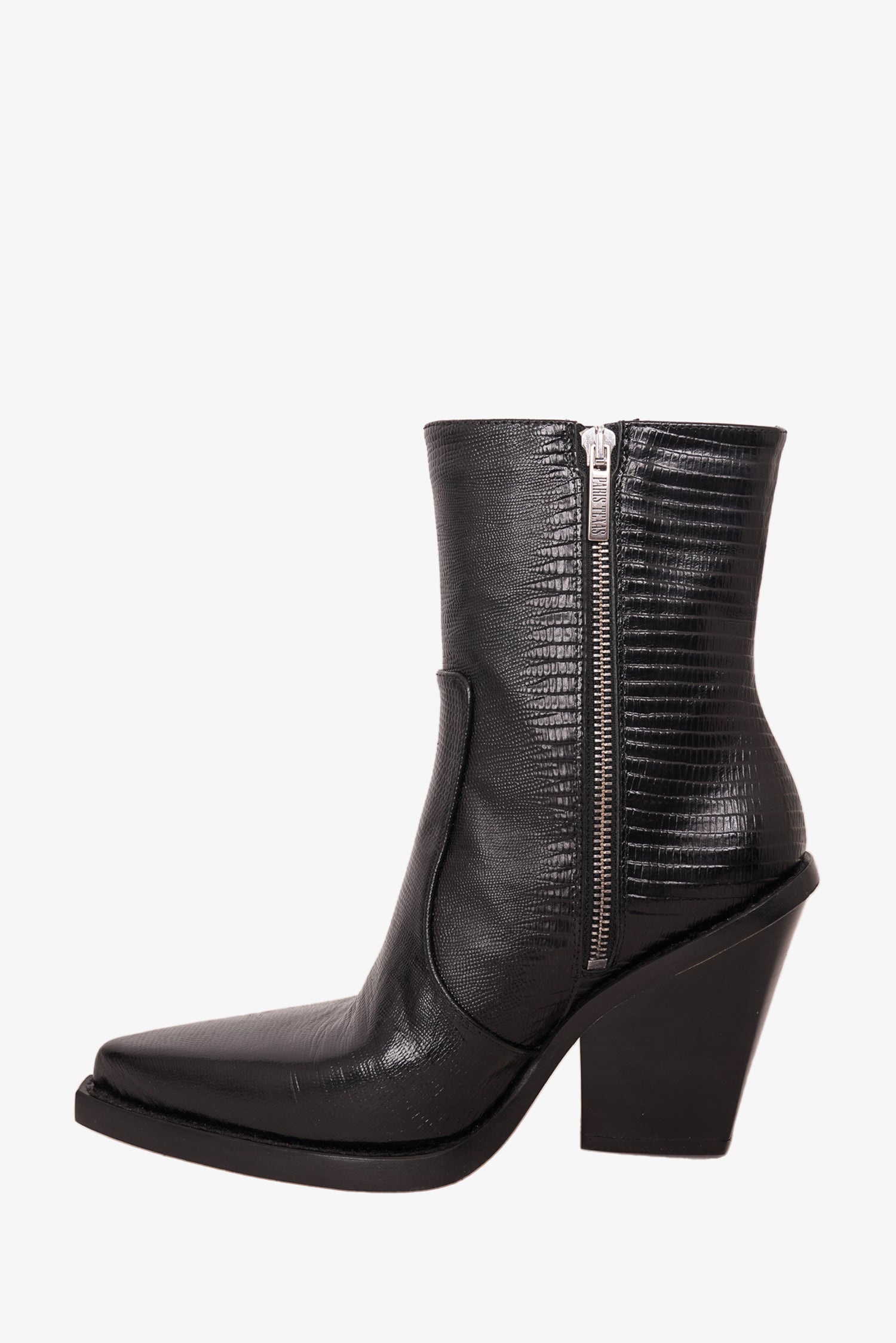 Paris Texas Black Embossed Leather Western Heeled Boots. Side zip closure. Silver hardware. Pointed toe. Block heel. Tonal stitching