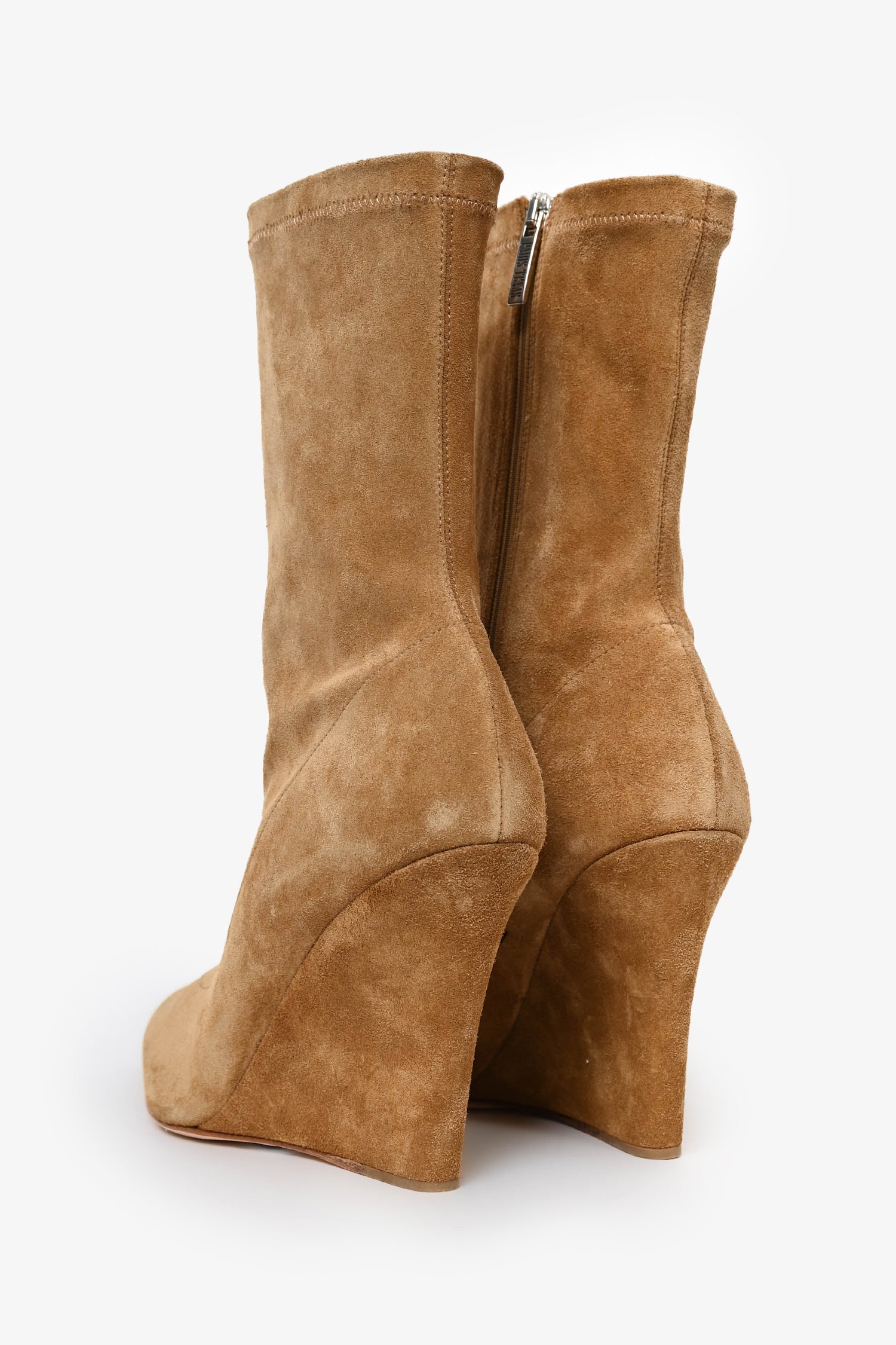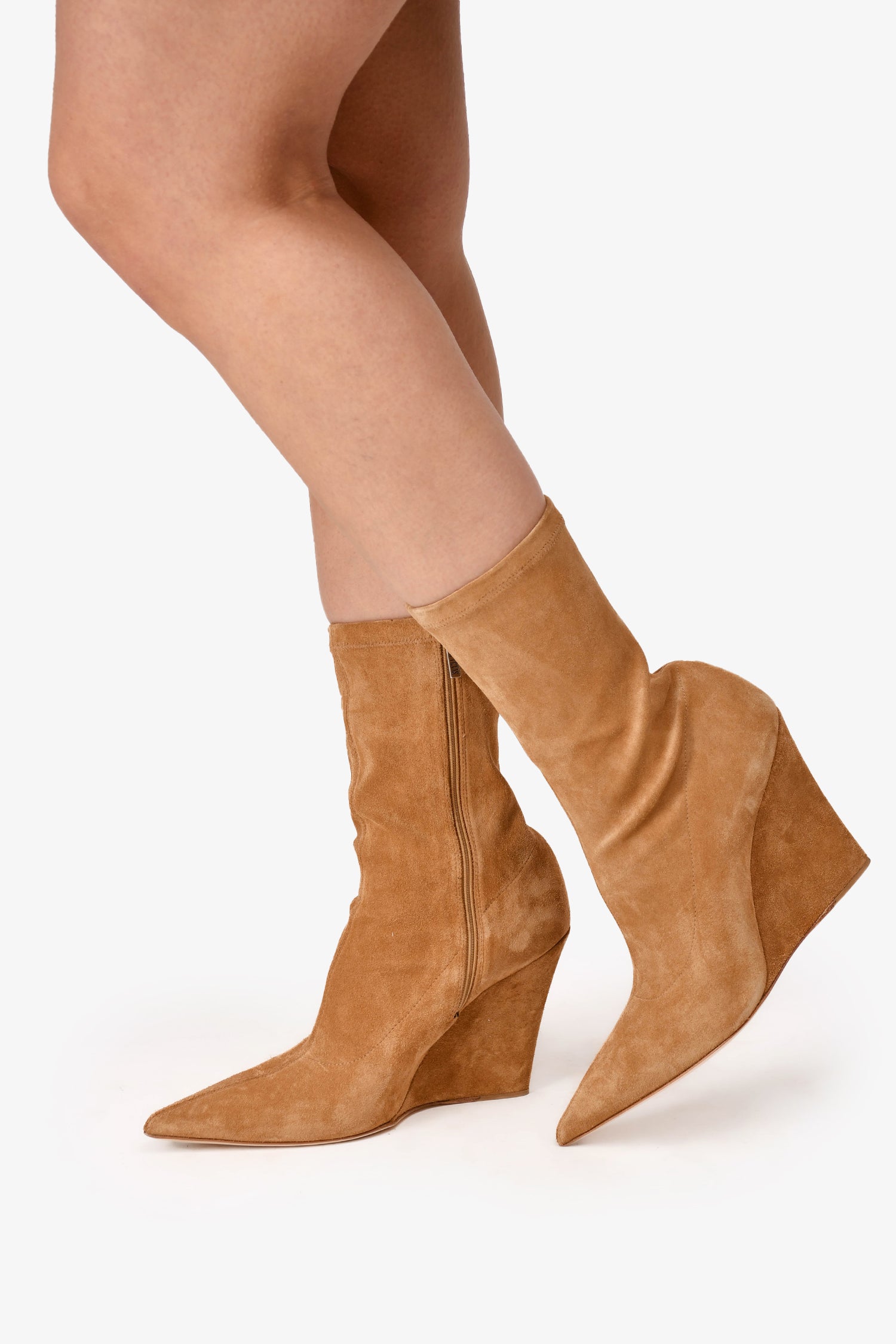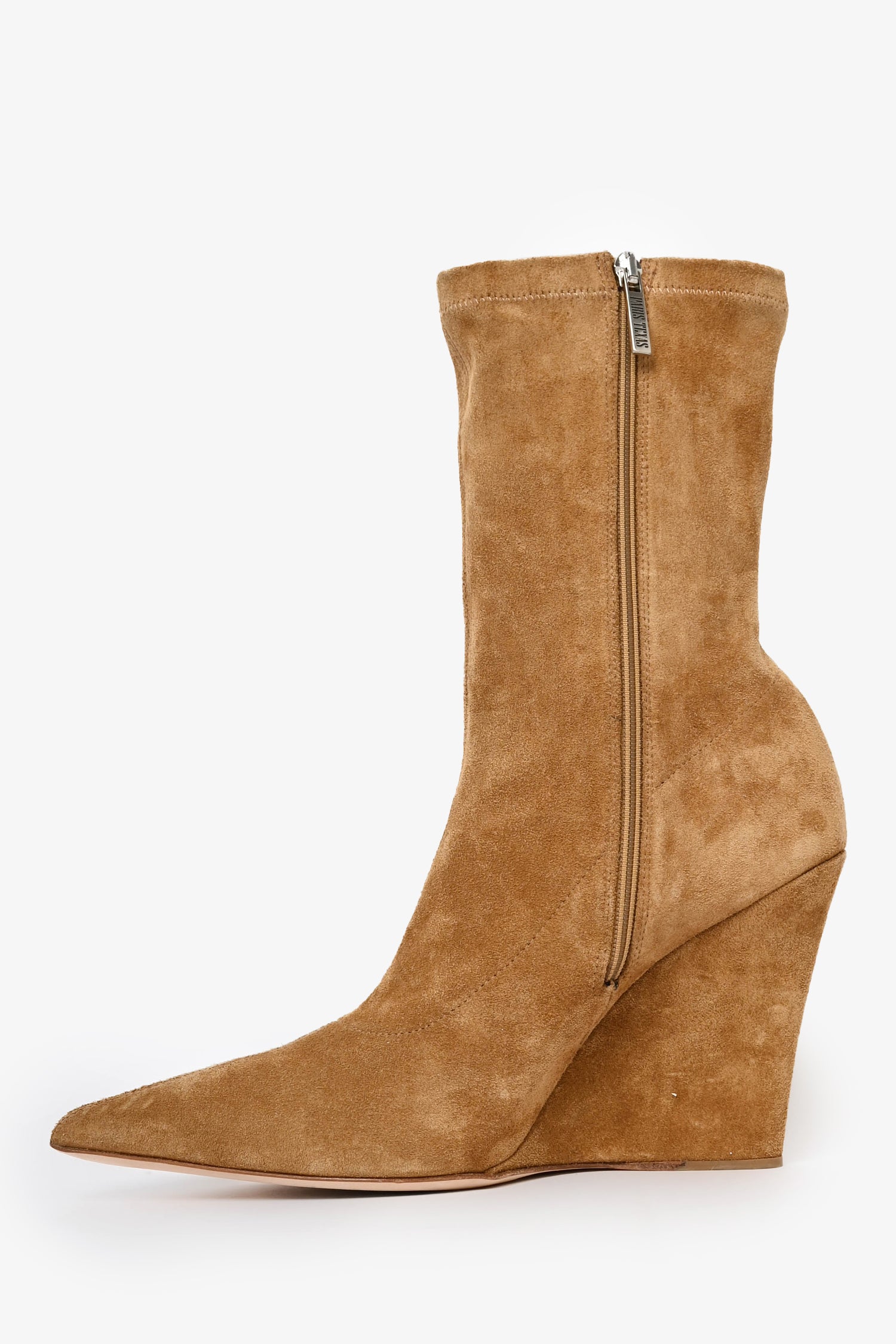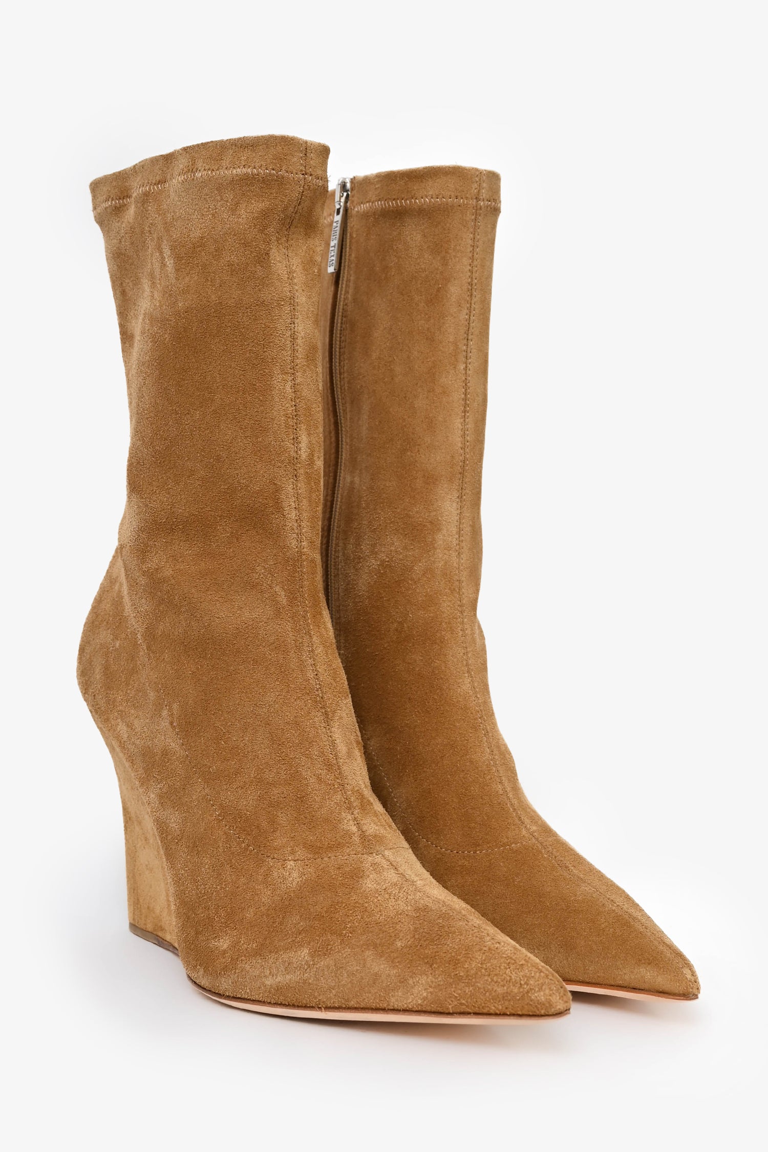 Refresh availabilityParis Texas Brown Suede Wedged Boots. Elevated wedge heel. Side zip closure. Pointed-toe design.