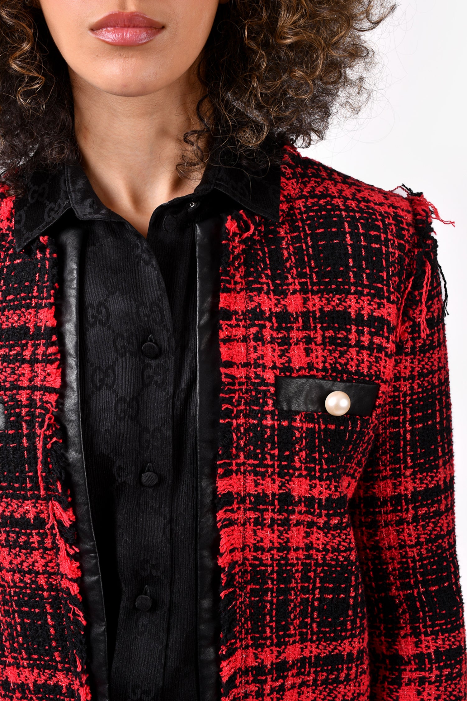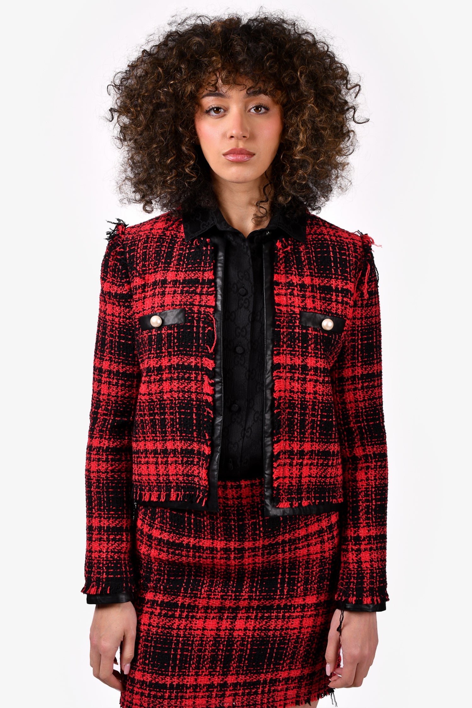 Refresh availabilityPinko Black/Red Tweed Checkered Blazer + Mini Skirt Set. Blazer: Open front. Lined. Skirt: Side zip and hook closure. Lined. Tonal stitching.