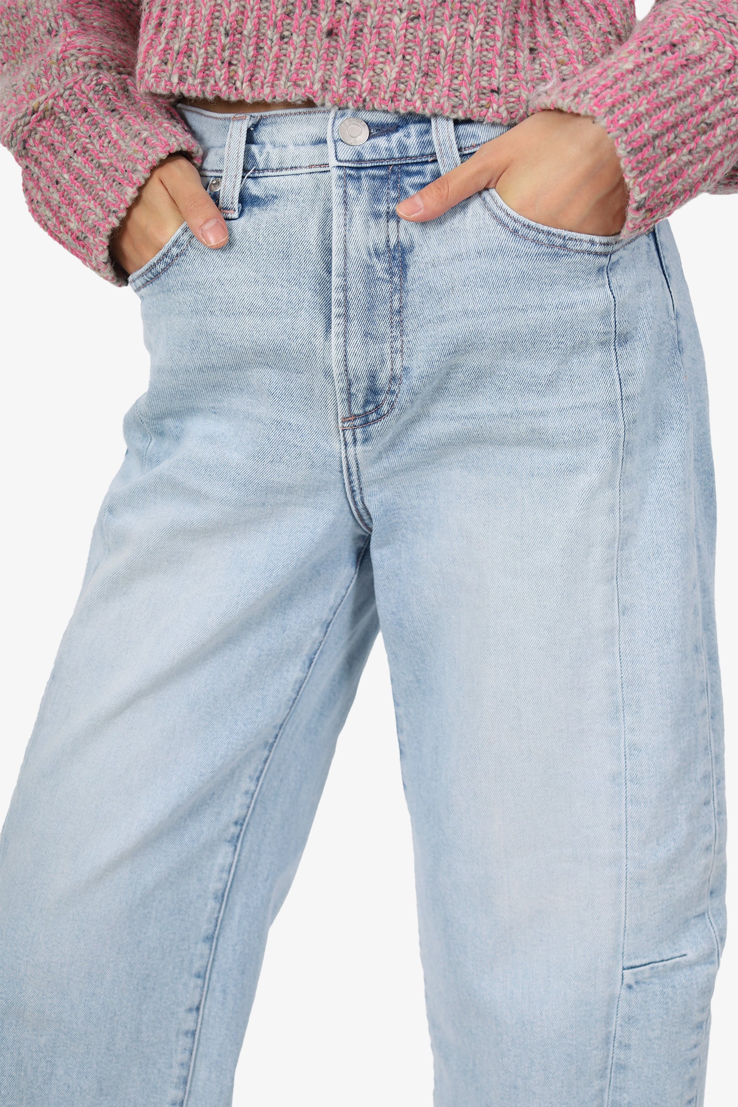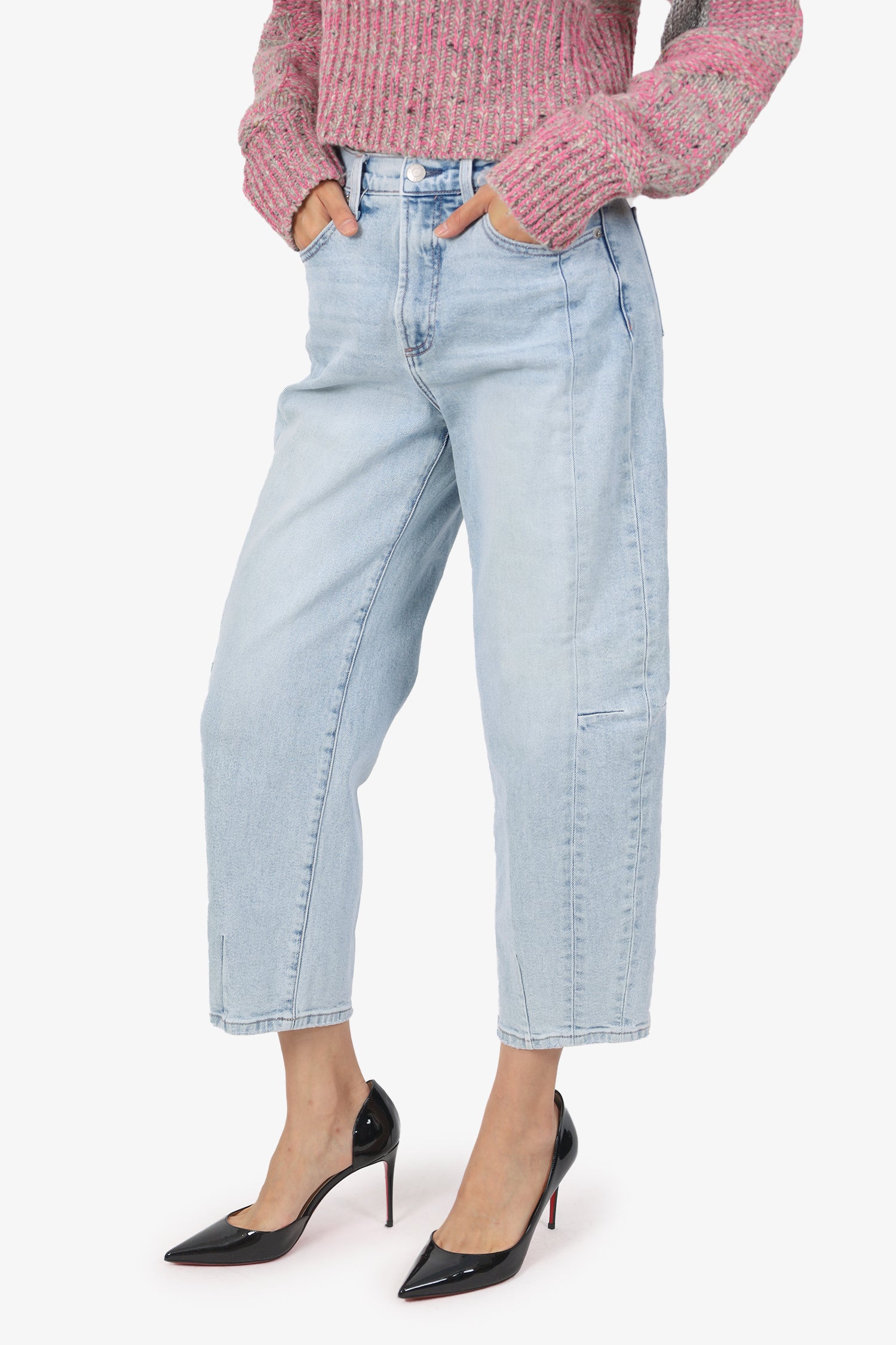 Refresh availabilityPistola Blue Denim Barrel Leg Jeans. Slip on. Front zip with button-up closure. Waistband belt-loops. 5 exterior pockets; 2 front slip, 1 mini compartment, and 2 rear slip. Brass and silver-tone hardware. Contrast stitching.