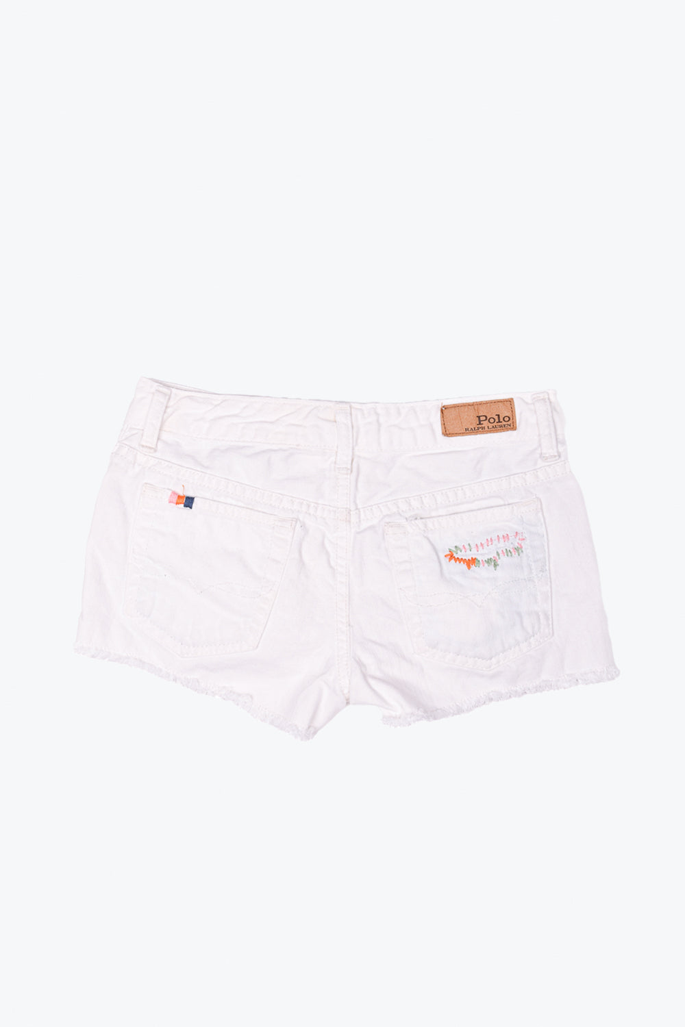 Polo Ralph Lauren White Denim Shorts with Embroidered Detail. Front zip and button closure. Front and rear pockets. Waist belt loops. Tonal stitching.