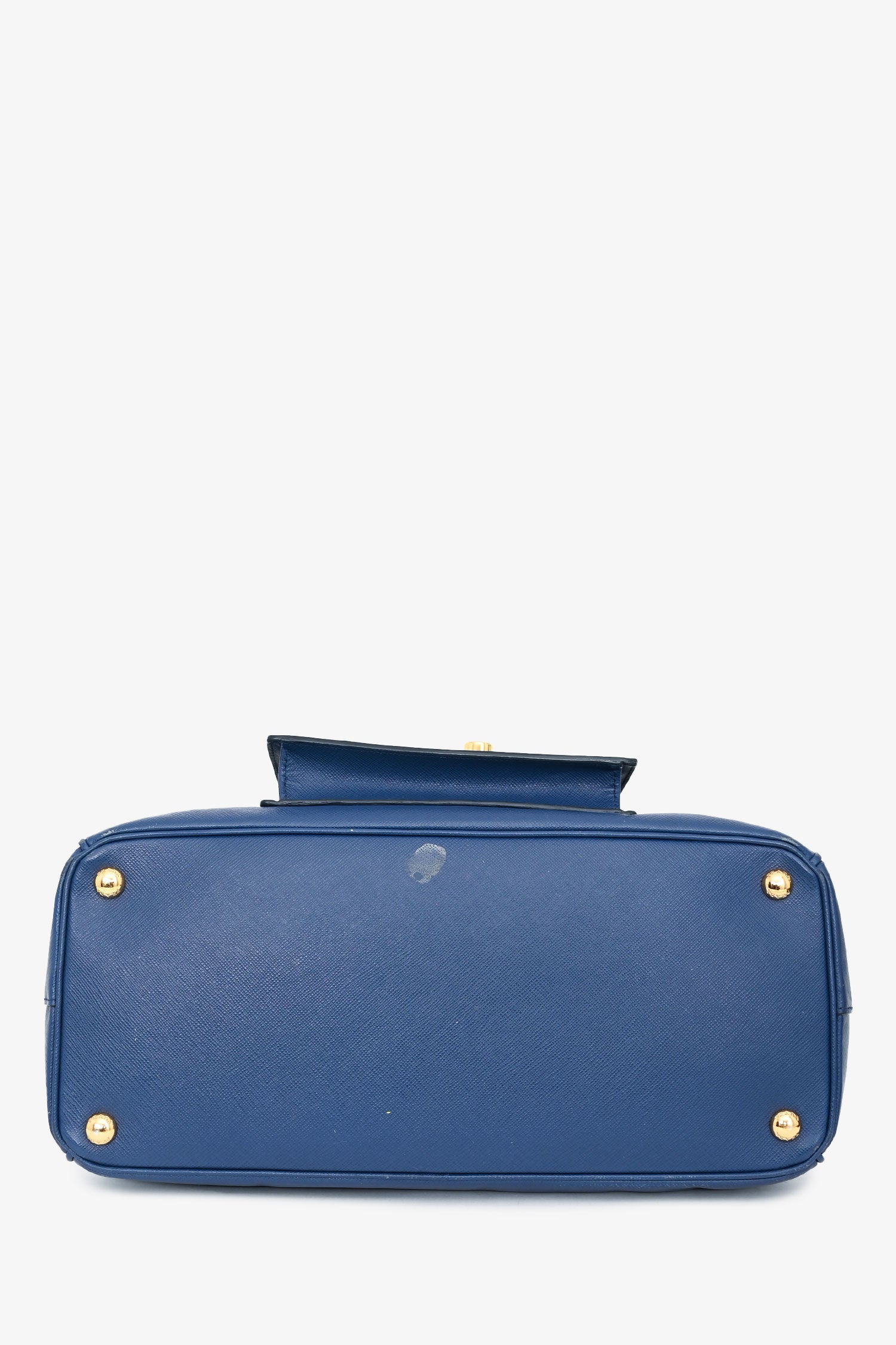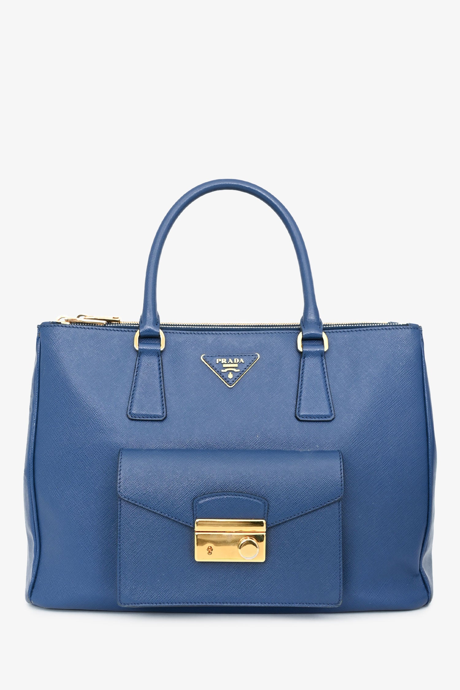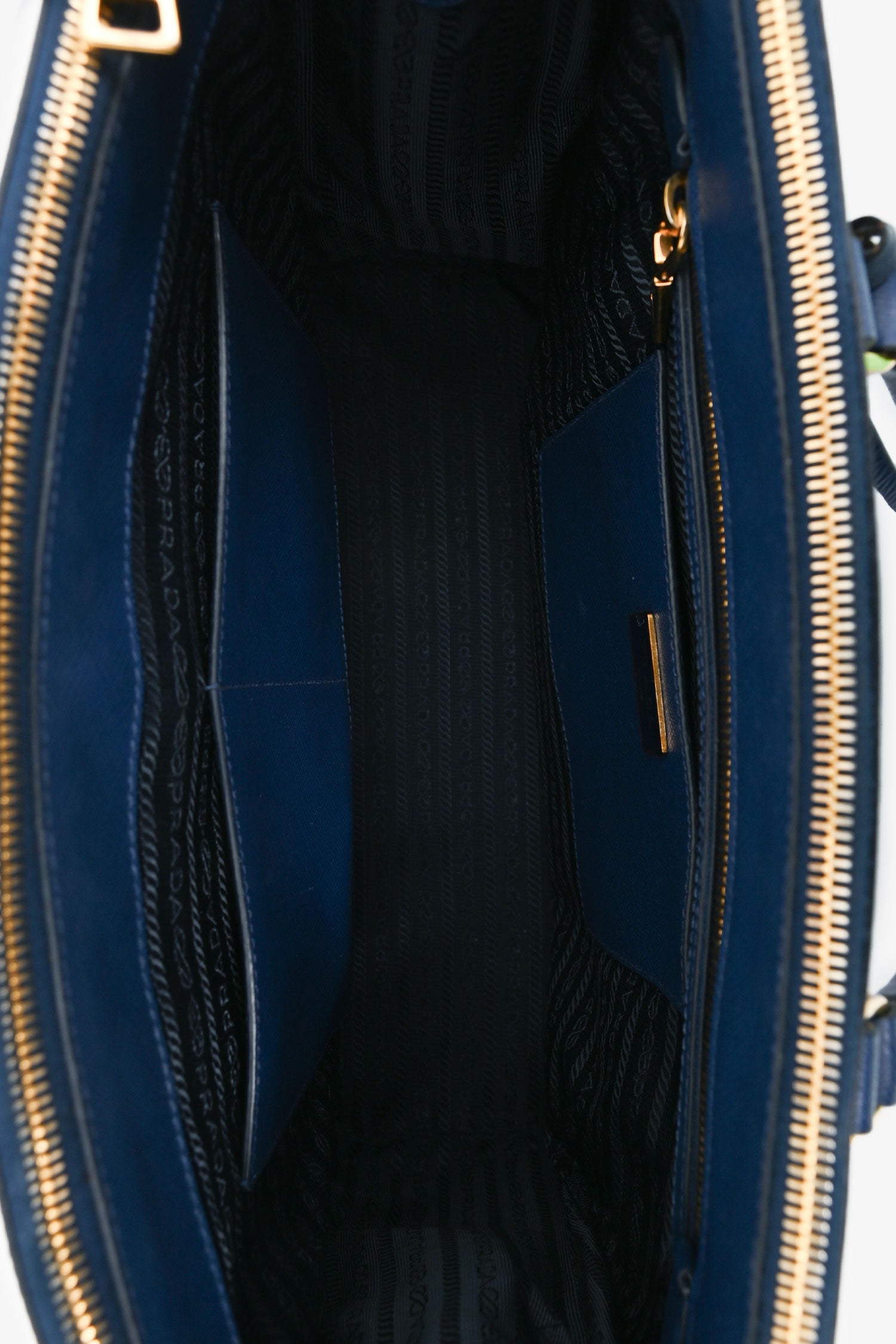 Prada 2013 Bluette Saffiano Lux Medium Enameled Metal Triangle Galleria Double Zip Tote with Strap