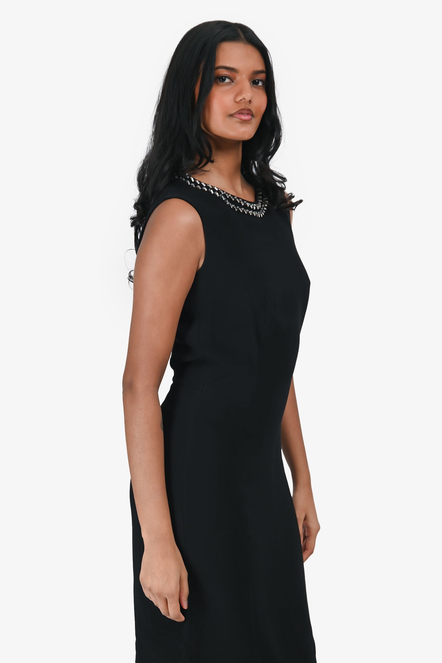 Refresh availabilityPrada 2014 Black Embellished Neckline Midi Cocktail Dress. Slip-on. Round neckline. Rear zip and hook closure. Lined interior. Tonal stitching.