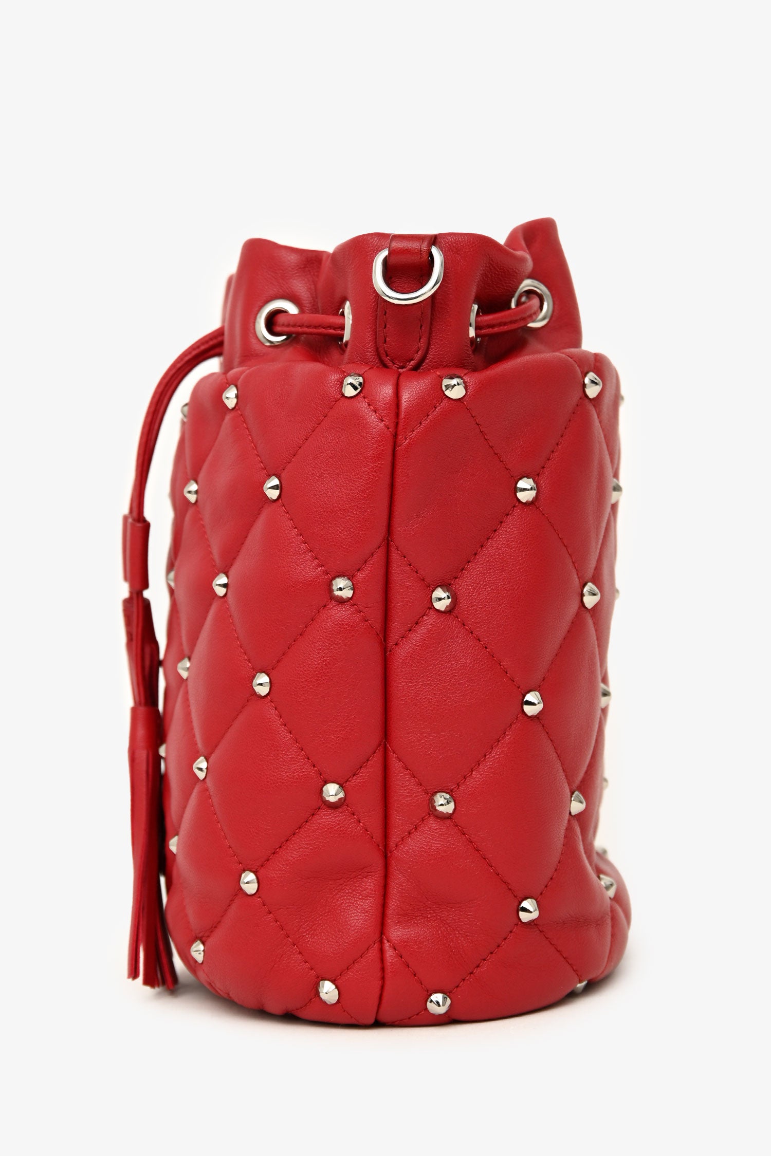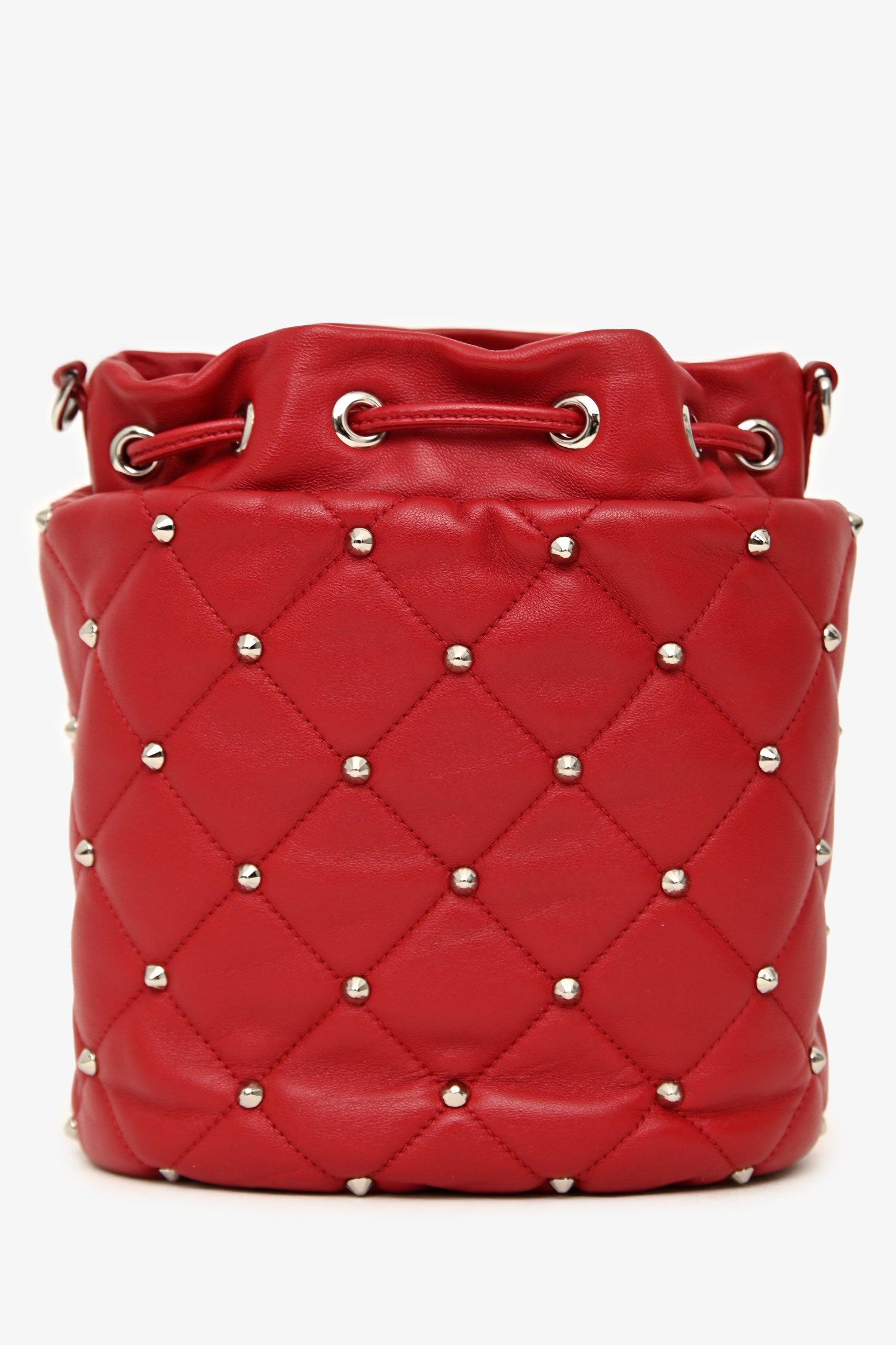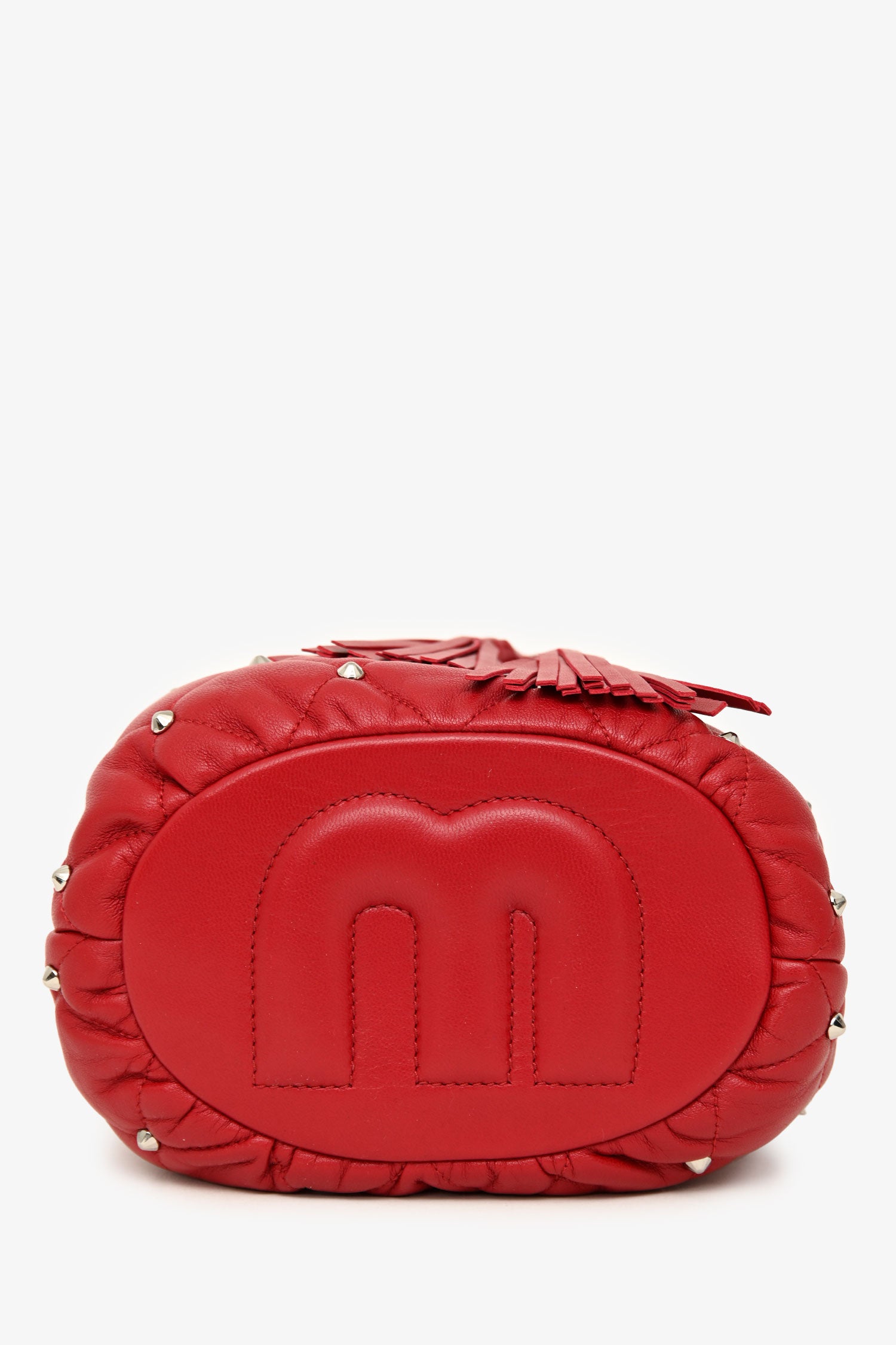Refresh availabilityMiu Miu 2020 Red Nappa 'Borchie' Studded Quilted Shoulder Bag. Open top with cinch closure. Adjustable shoulder strap. Open-lined interior with a card slot. Silver-tone hardware. Tonal stitching.