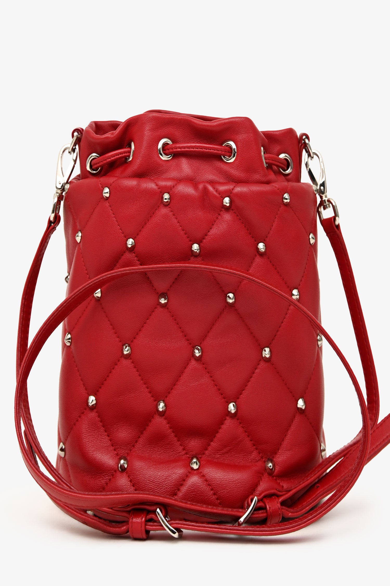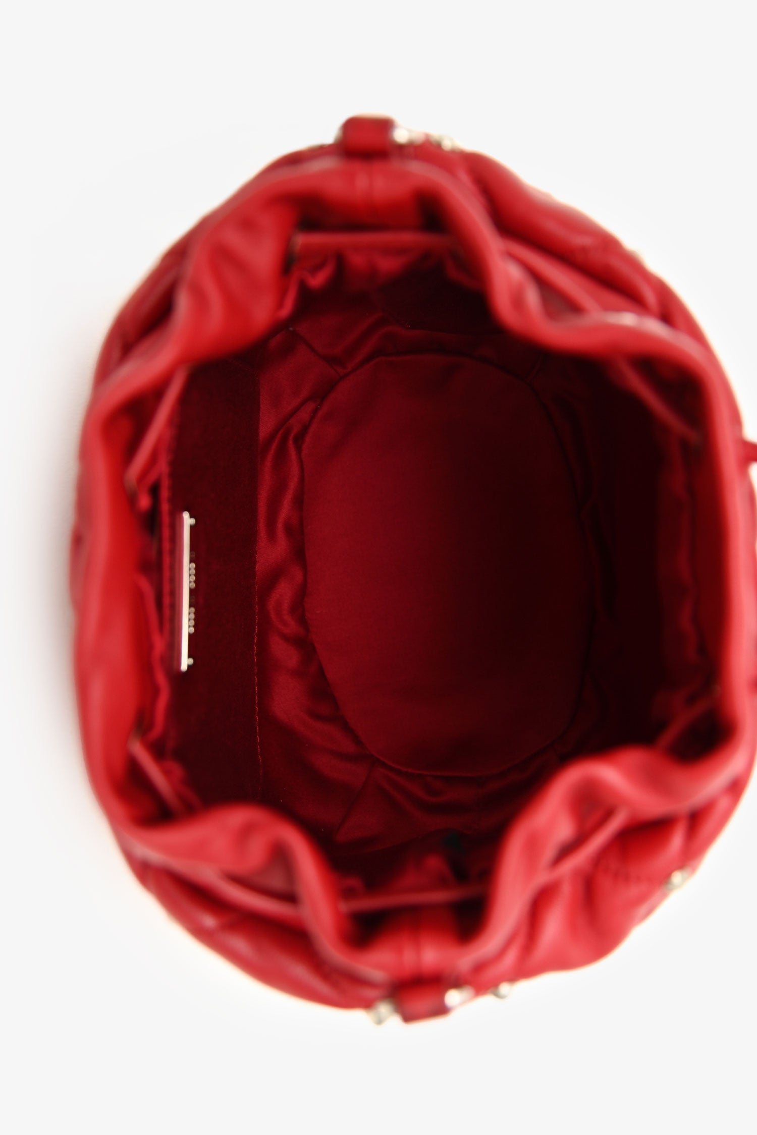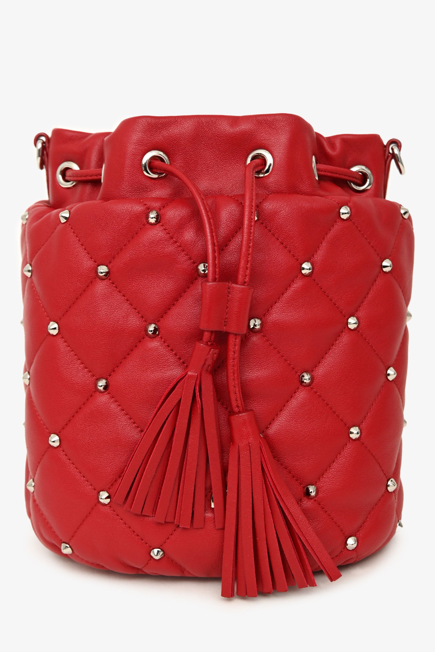 Refresh availabilityMiu Miu 2020 Red Nappa 'Borchie' Studded Quilted Shoulder Bag. Open top with cinch closure. Adjustable shoulder strap. Open-lined interior with a card slot. Silver-tone hardware. Tonal stitching.