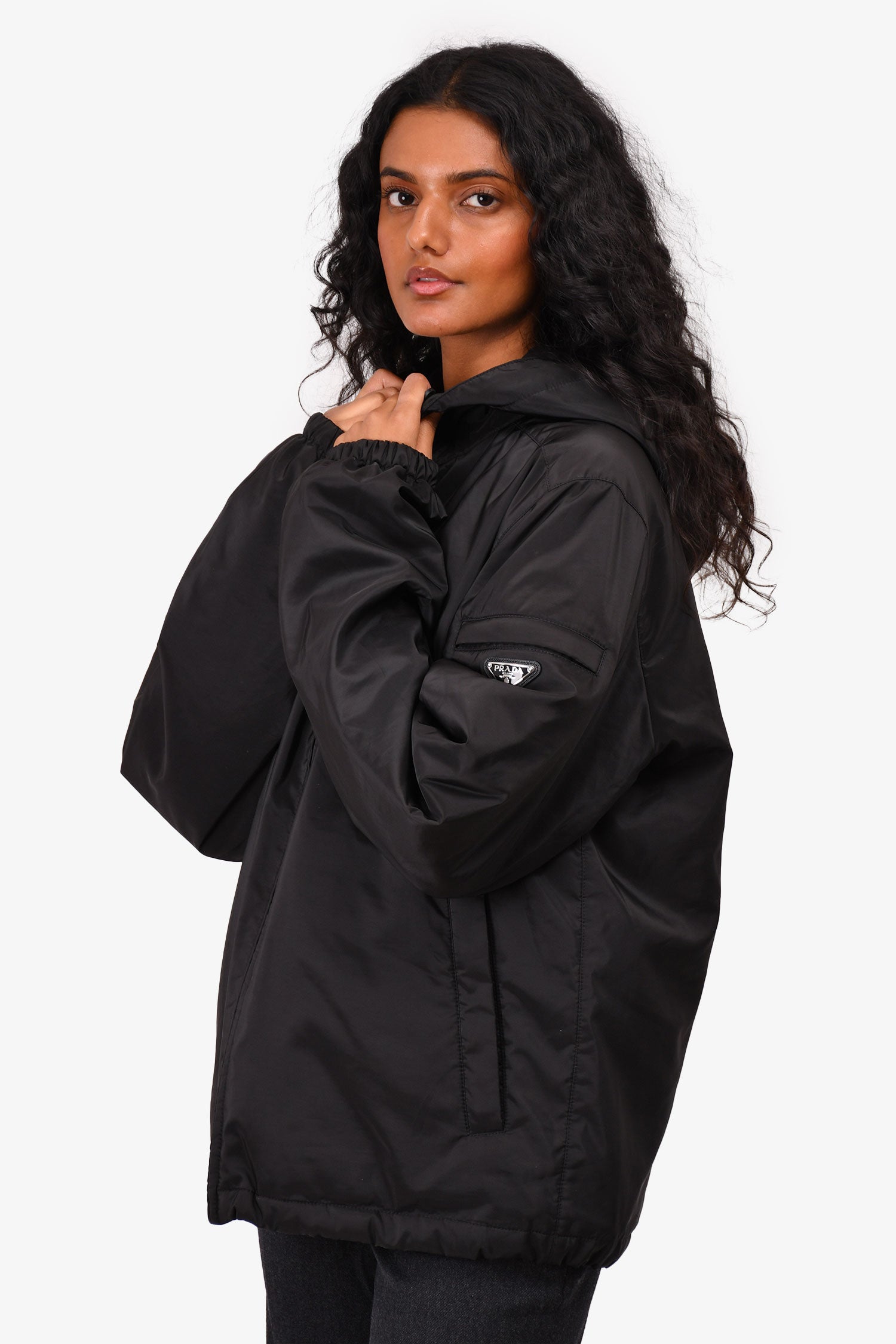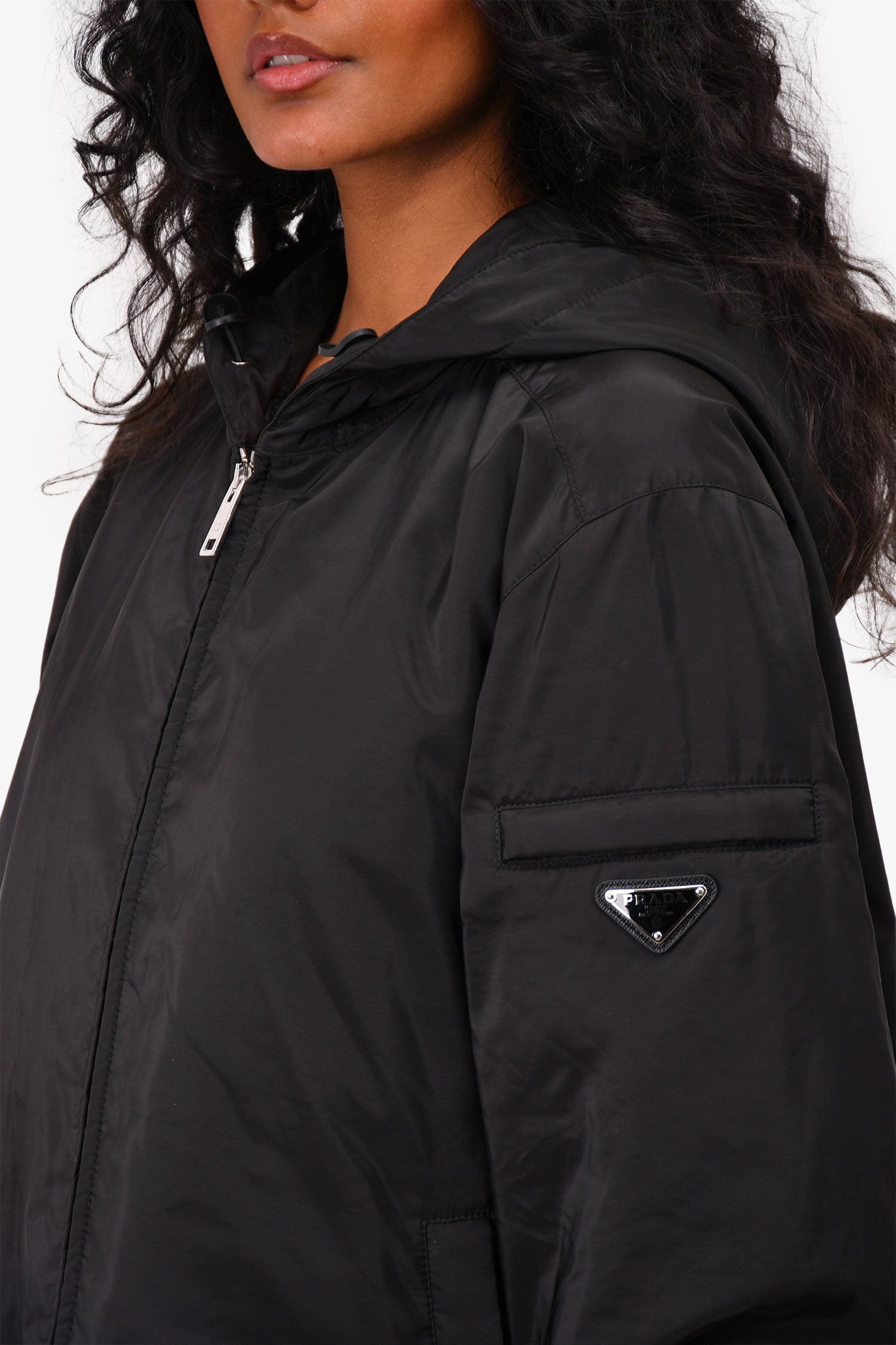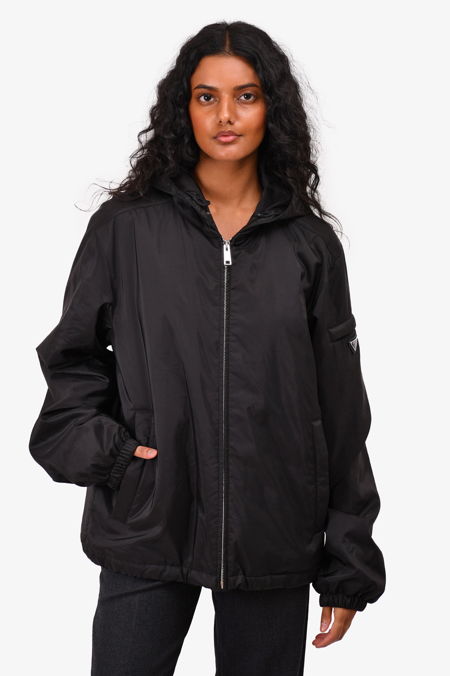 Refresh availabilityPrada 2022 Black Triangle Logo Hooded Zip-Up Jacket. Front zip-up closure. Two front pockets with zipper closure. Silver-tone hardware. Tonal stitching.