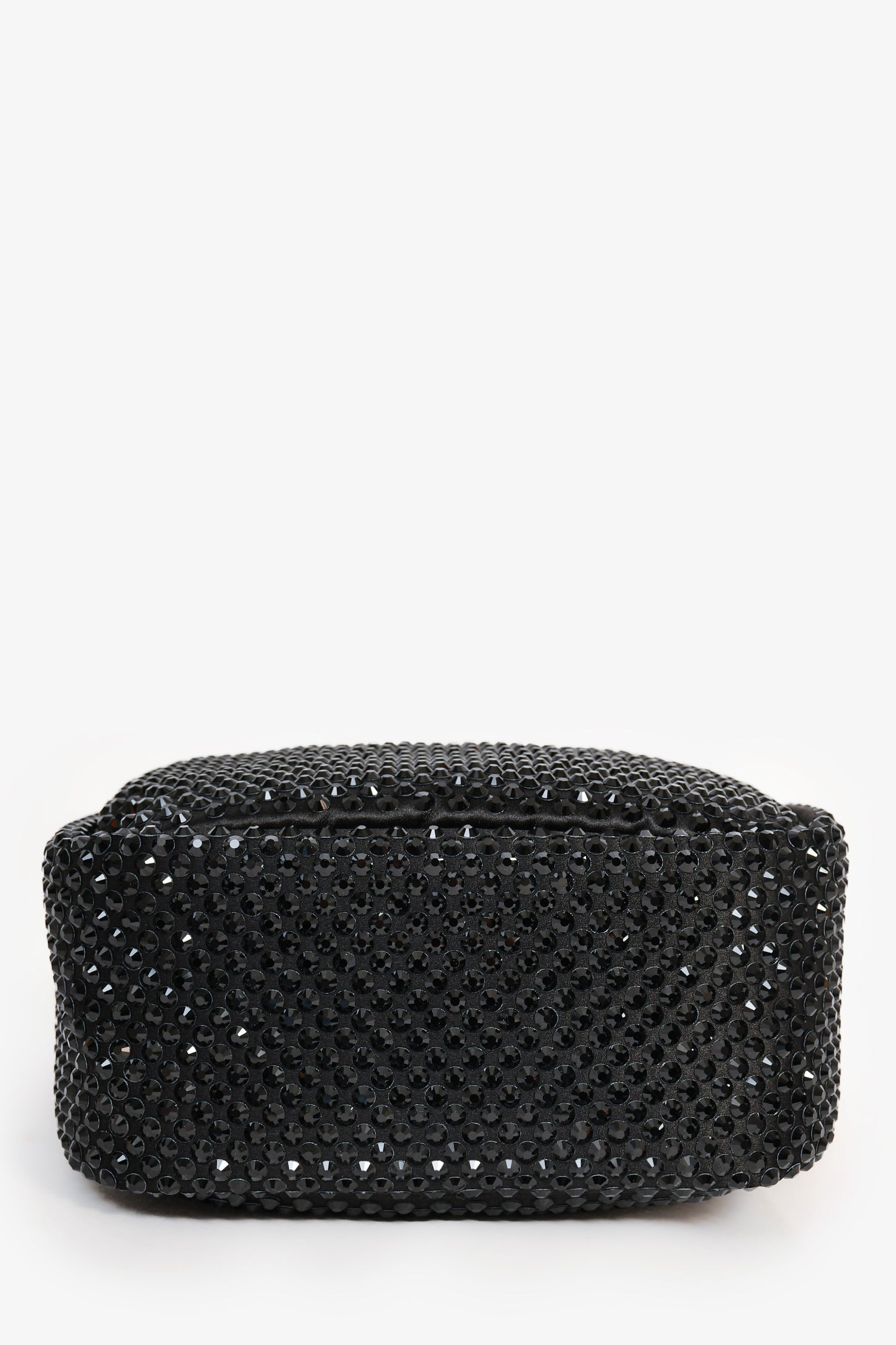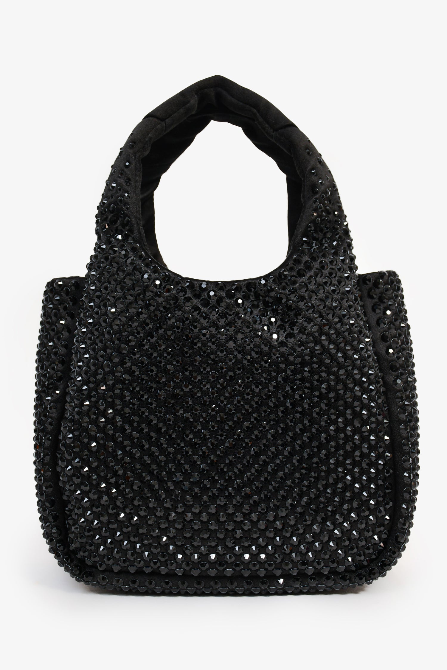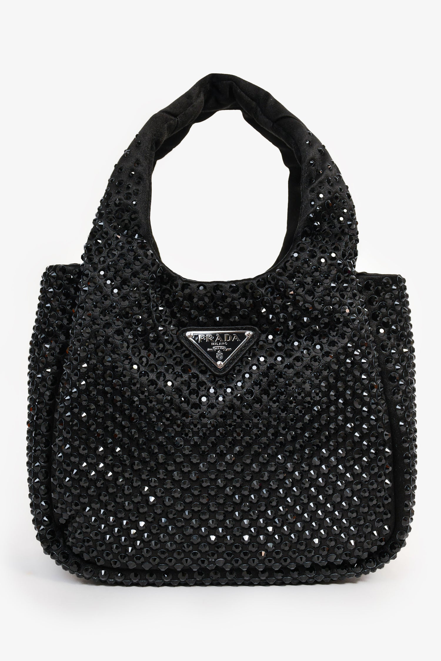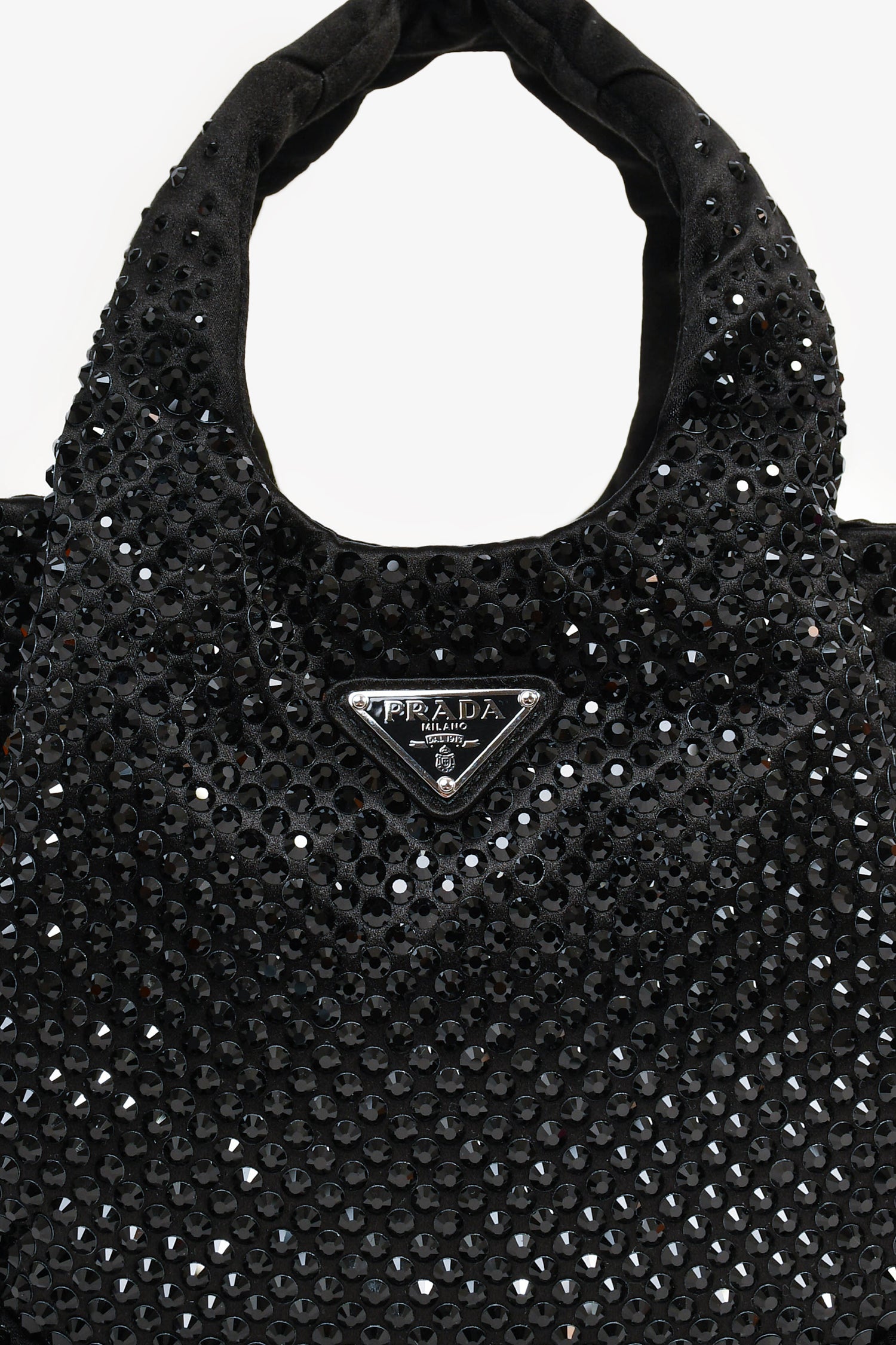 Refresh availabilityPrada 2024 Holiday Black Satin Crystal Top Handle Mini Tote Bag. Black-tone crystal embellishment. Satin-lined interior. 3 interior compartments. Concealed snap closure. Tonal stitching.