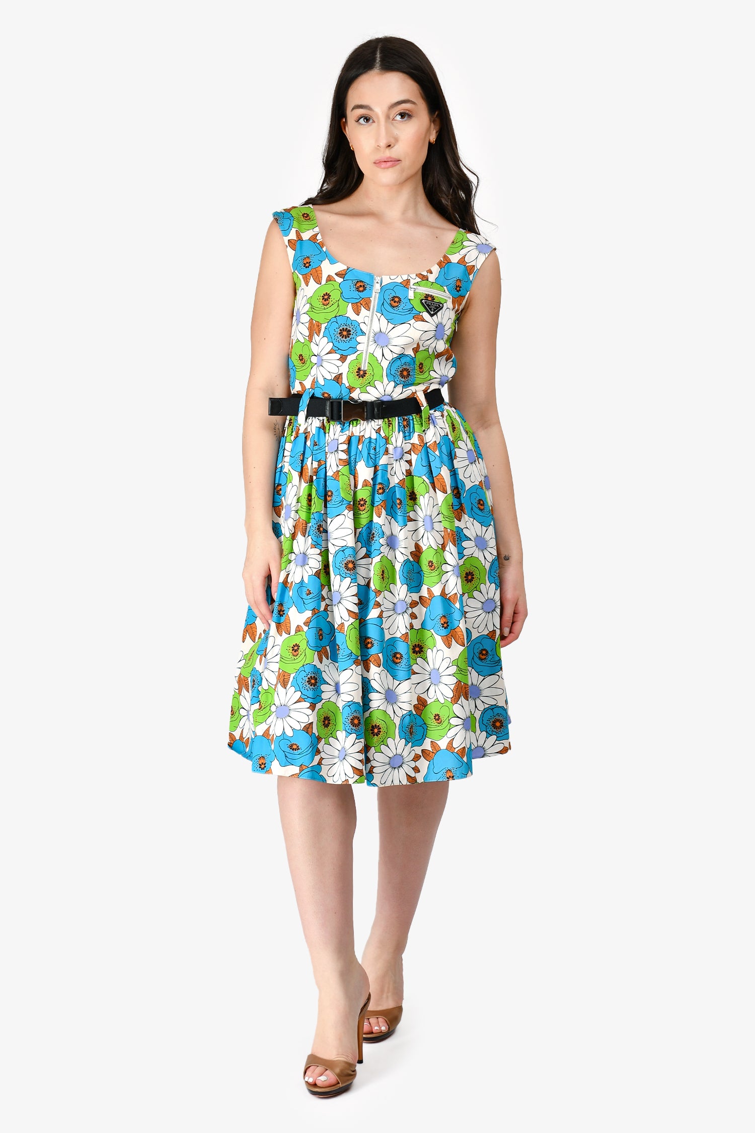 Refresh availabilityPrada 2024 White/Green/Blue Cotton Floral Triangle Pocket Belted Dress. Side zip closure. Quarter-zip at bust. Single zip-closure breast pocket. Buckle closure waist-belt. Silver-toned hardware. Tonal stitching.