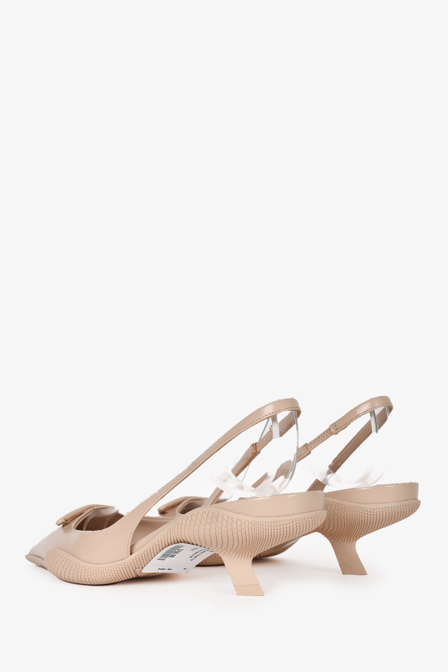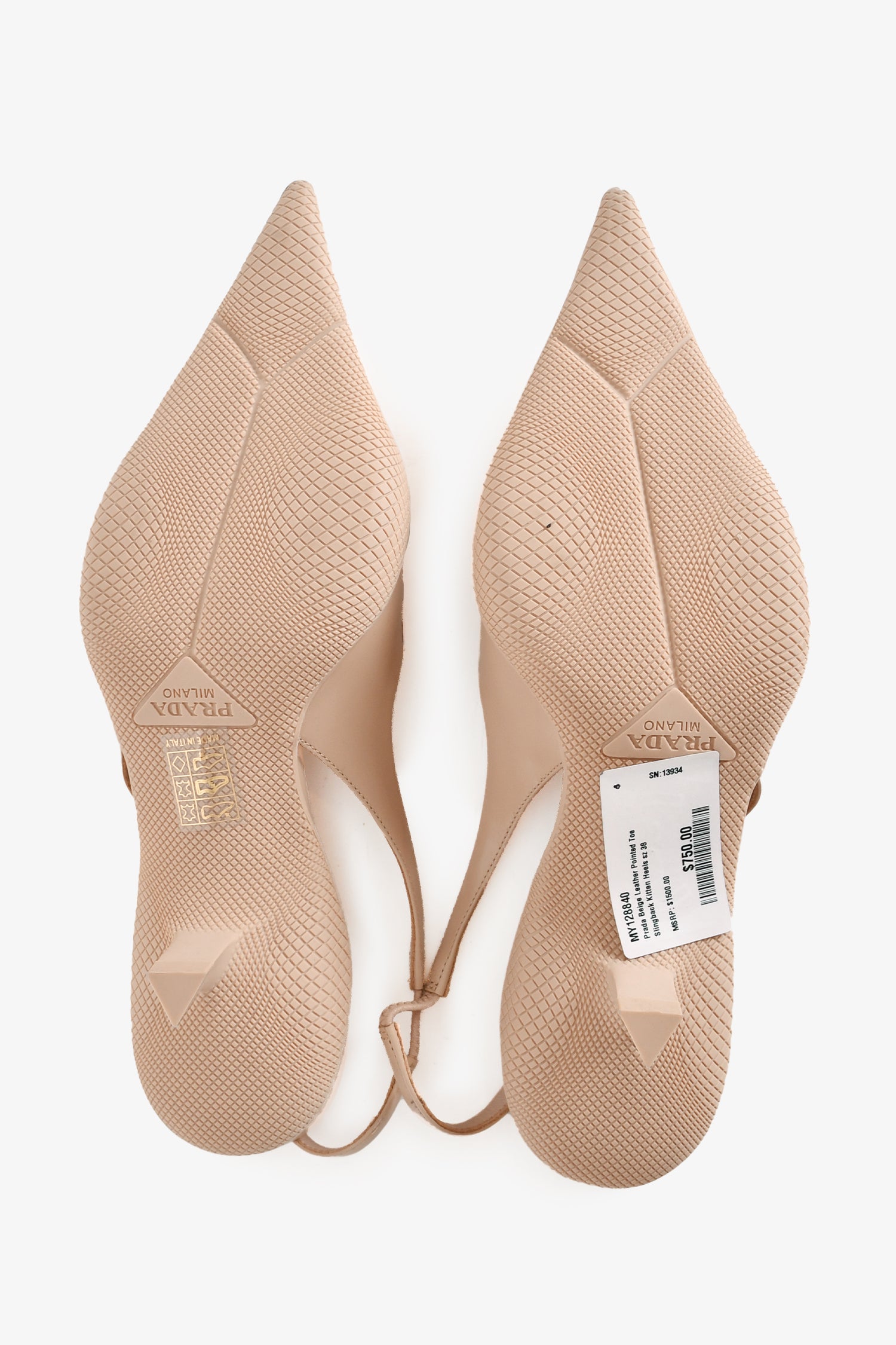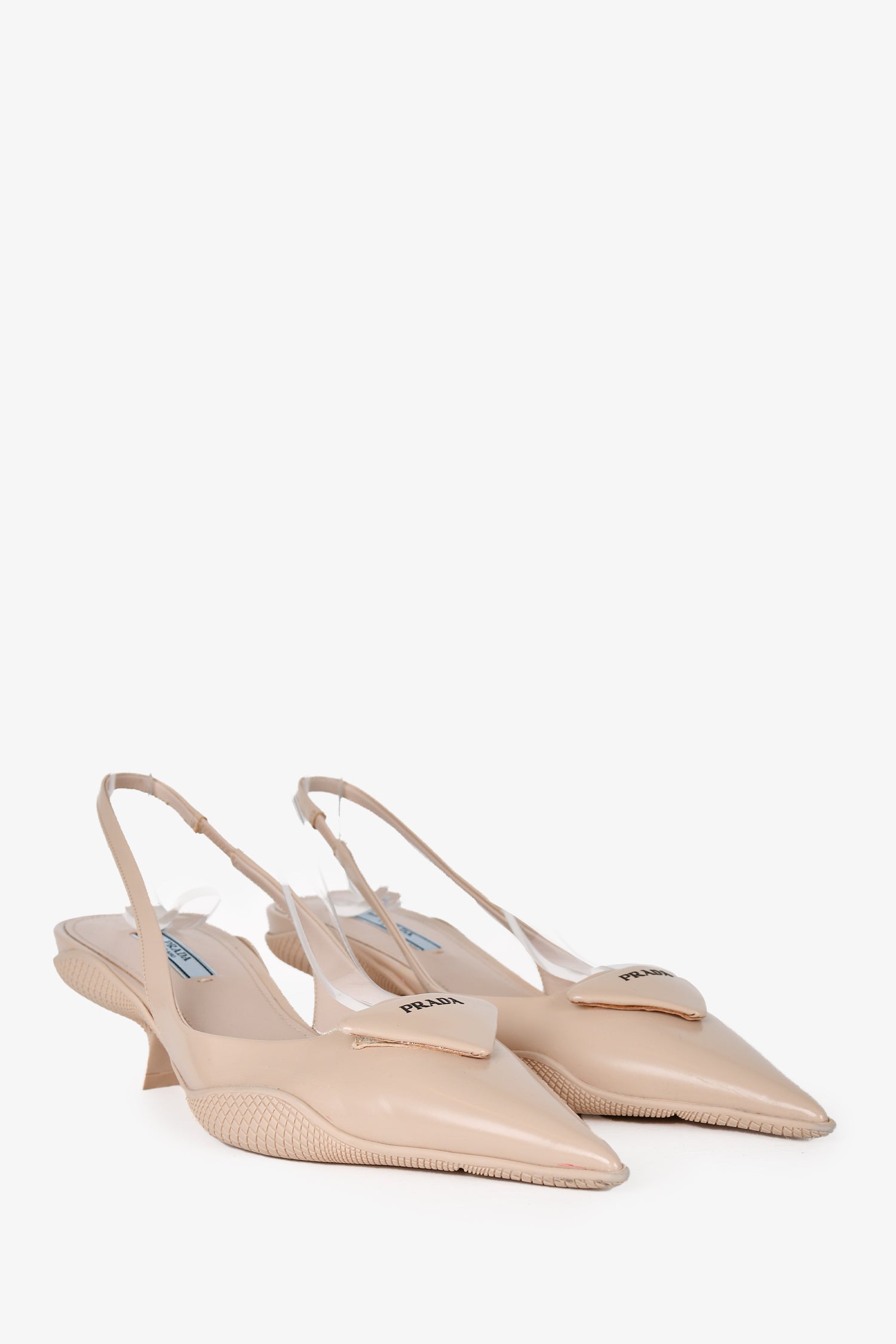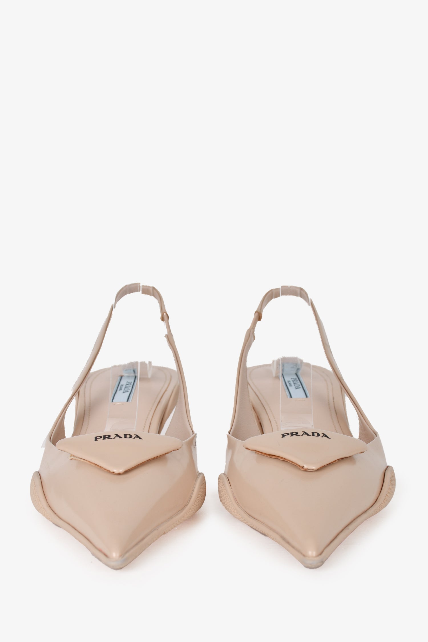 Prada Beige Leather Pointed Toe Slingback Kitten Heels. Pointed closed heel. back ankle strap. Tonal stitching.