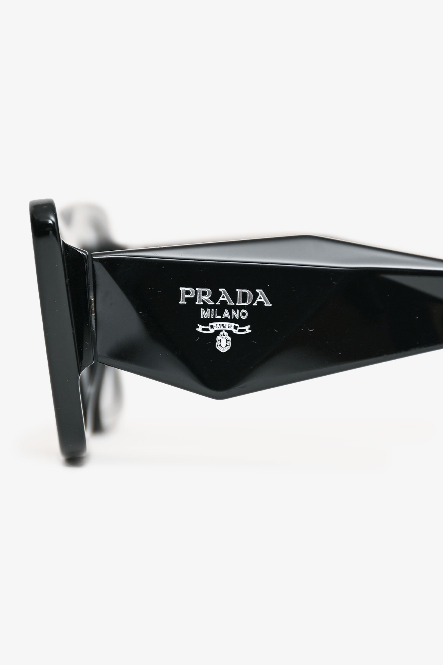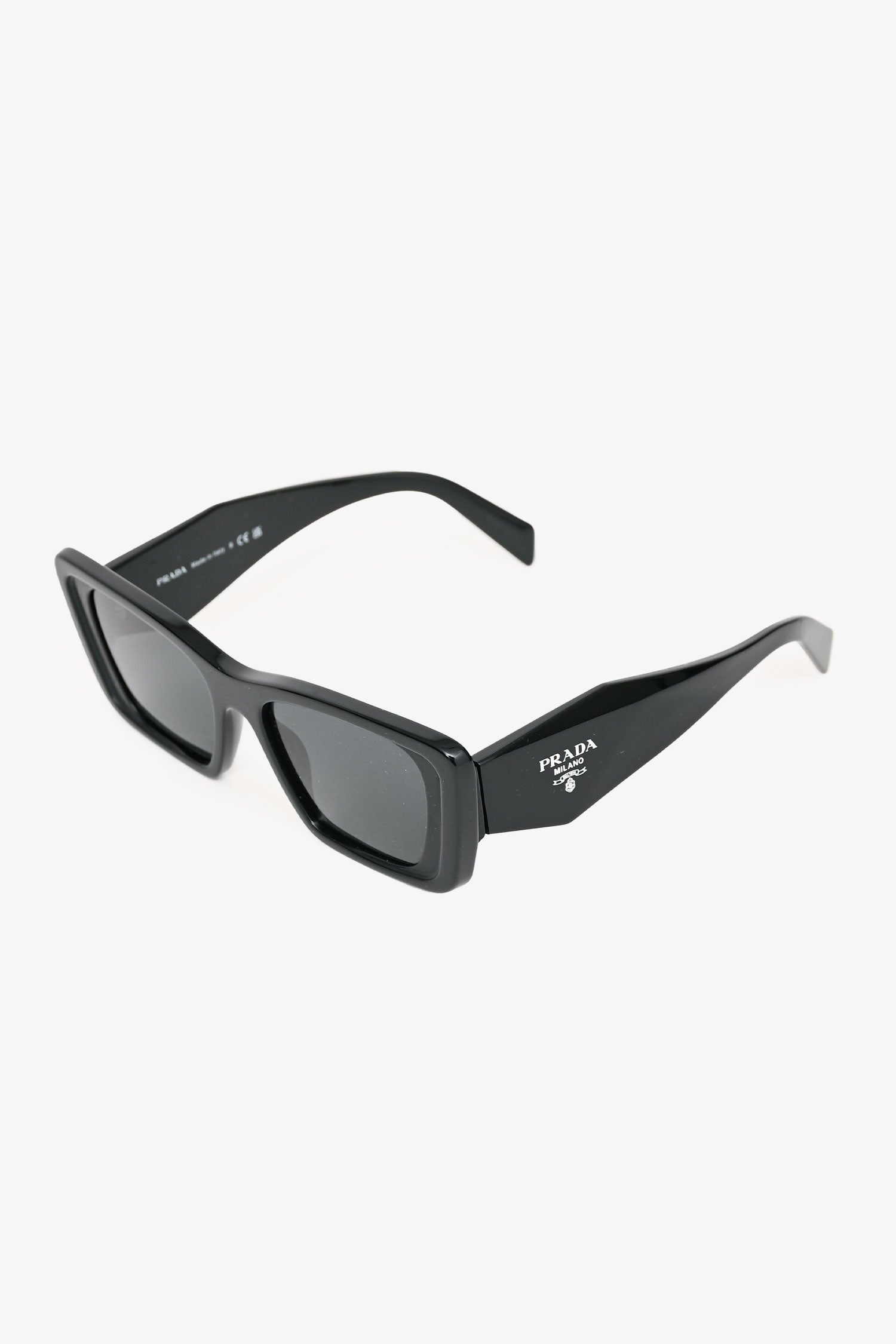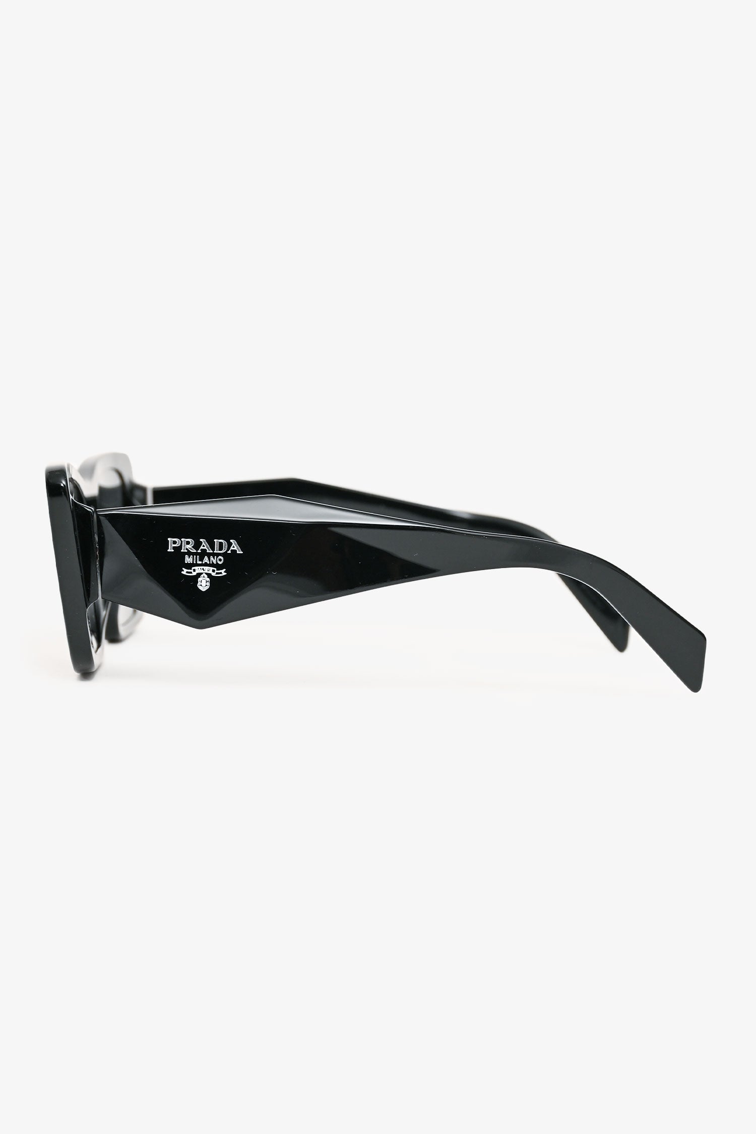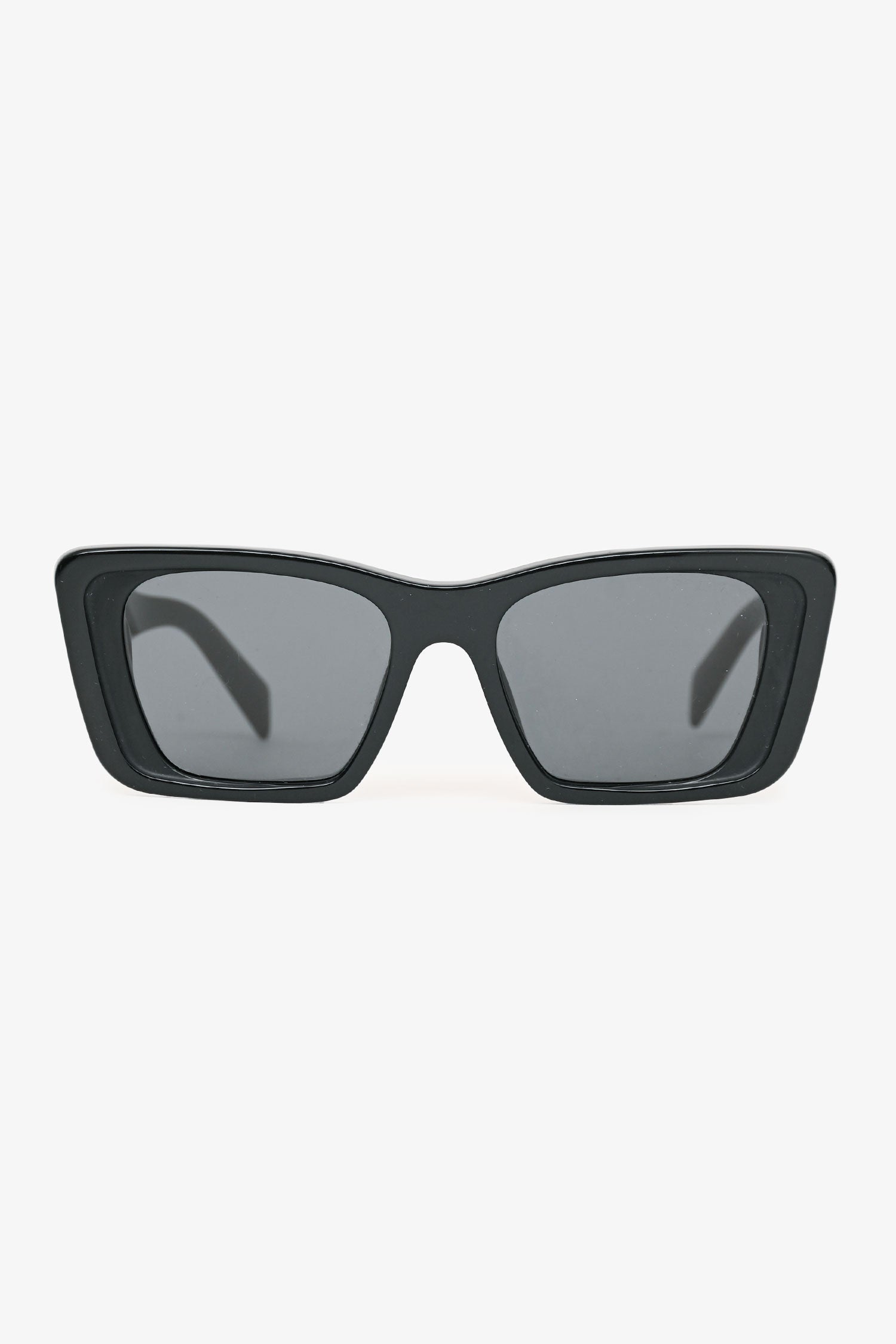 Refresh availabilityPrada Black Acrylic Frame Rectangular Sunglasses. Signature Prada logo at temples. Built-in nose pads.