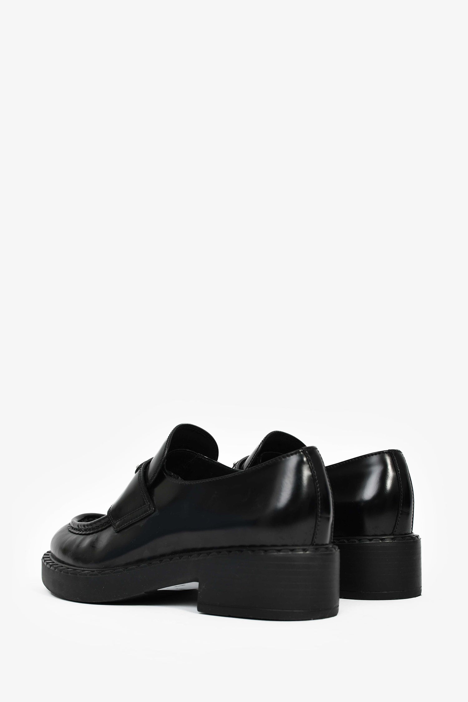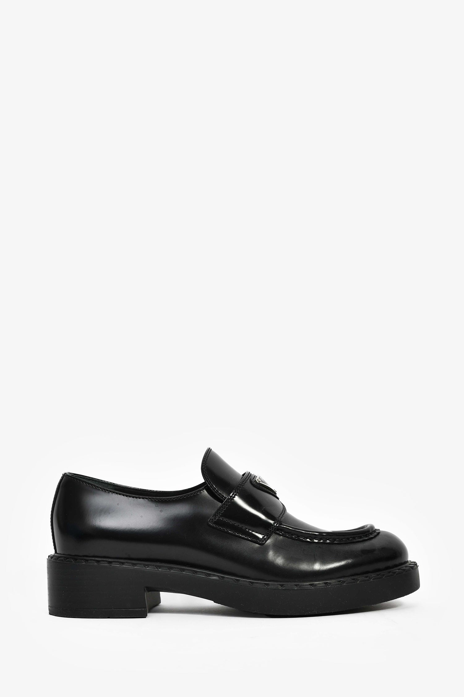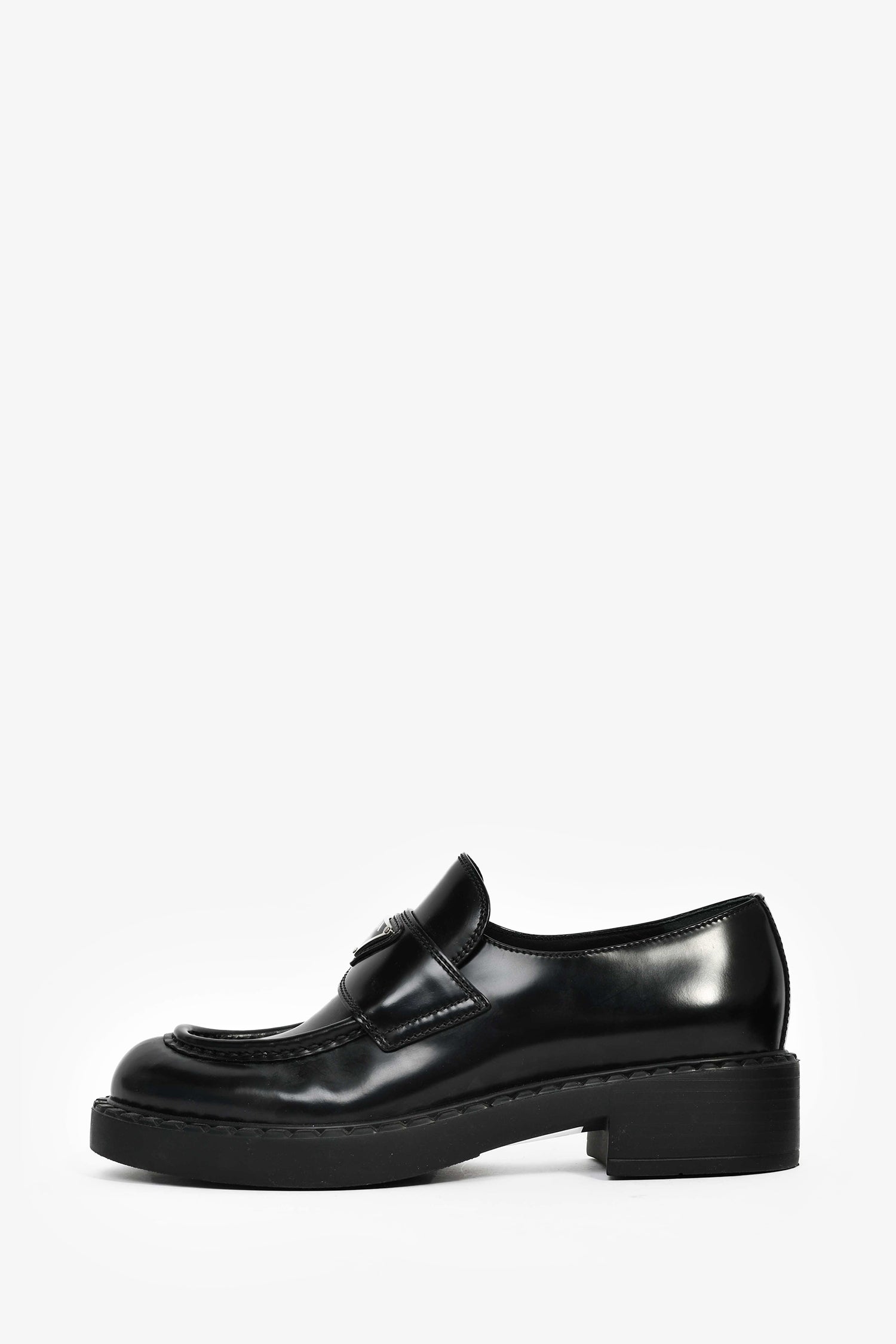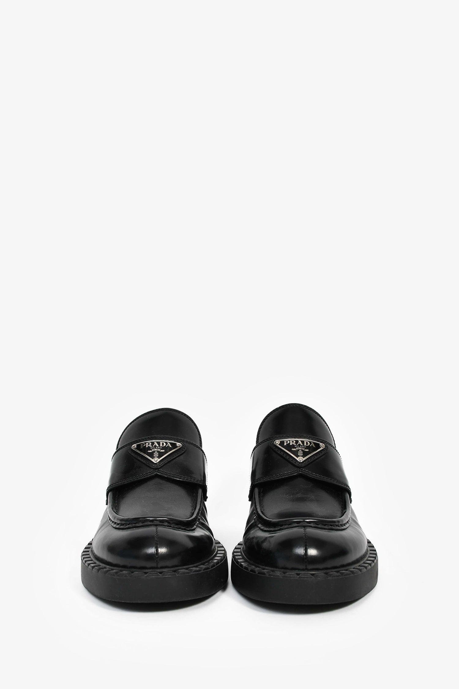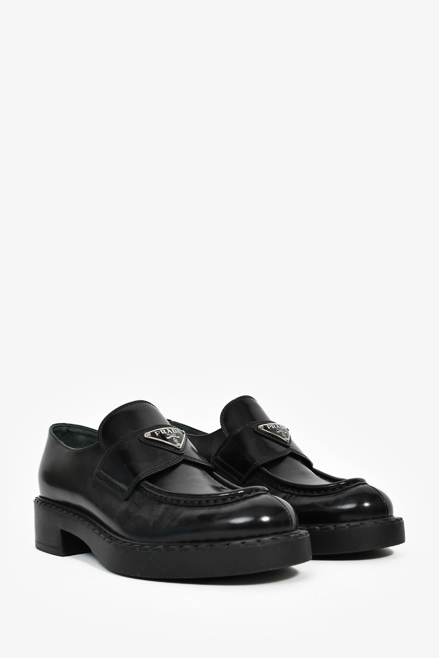 Refresh availabilityPrada Black Brushed Leather Loafers. Round toe. Silver-tone hardware. Leather insoles. Rubber soles. Tonal stitching.