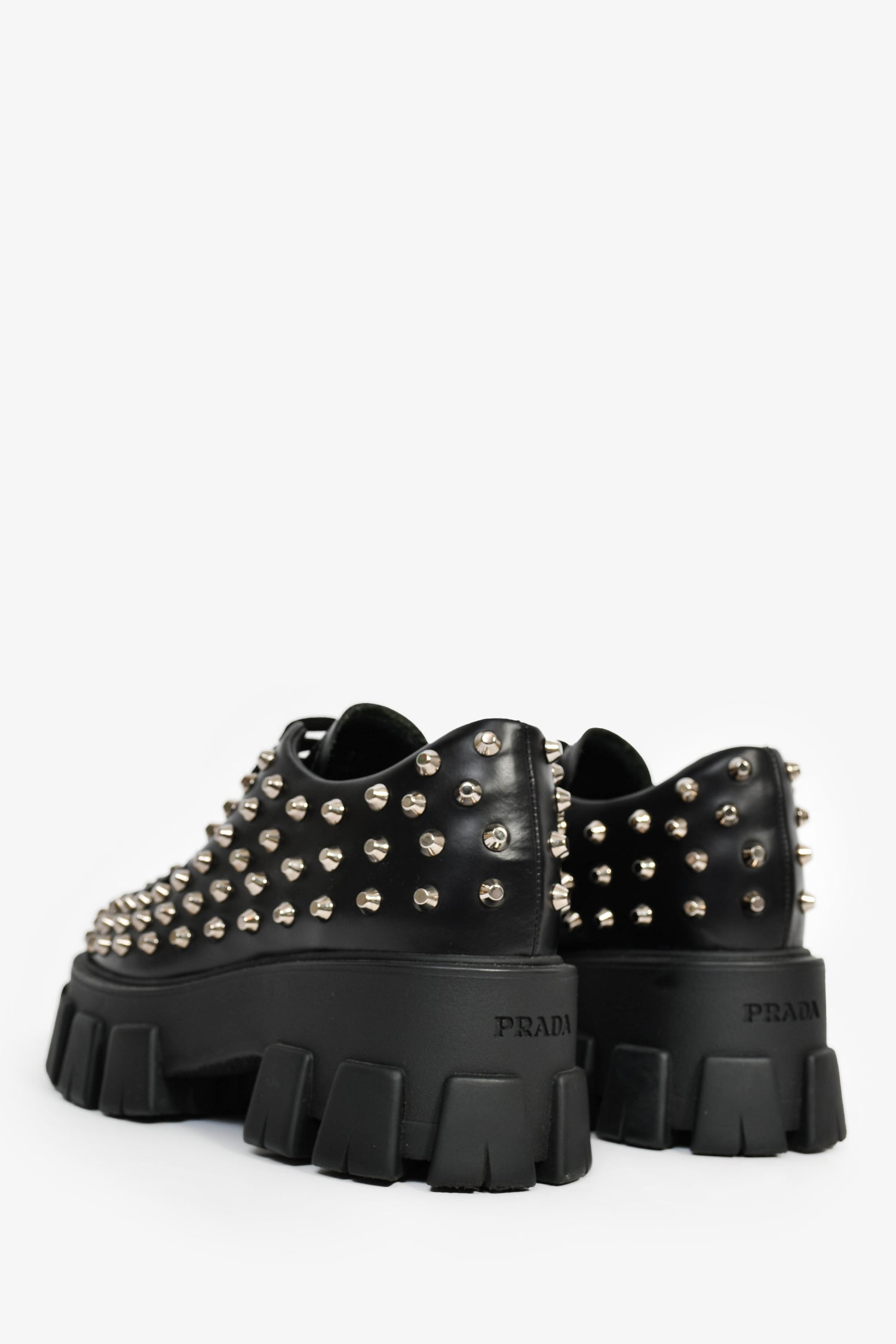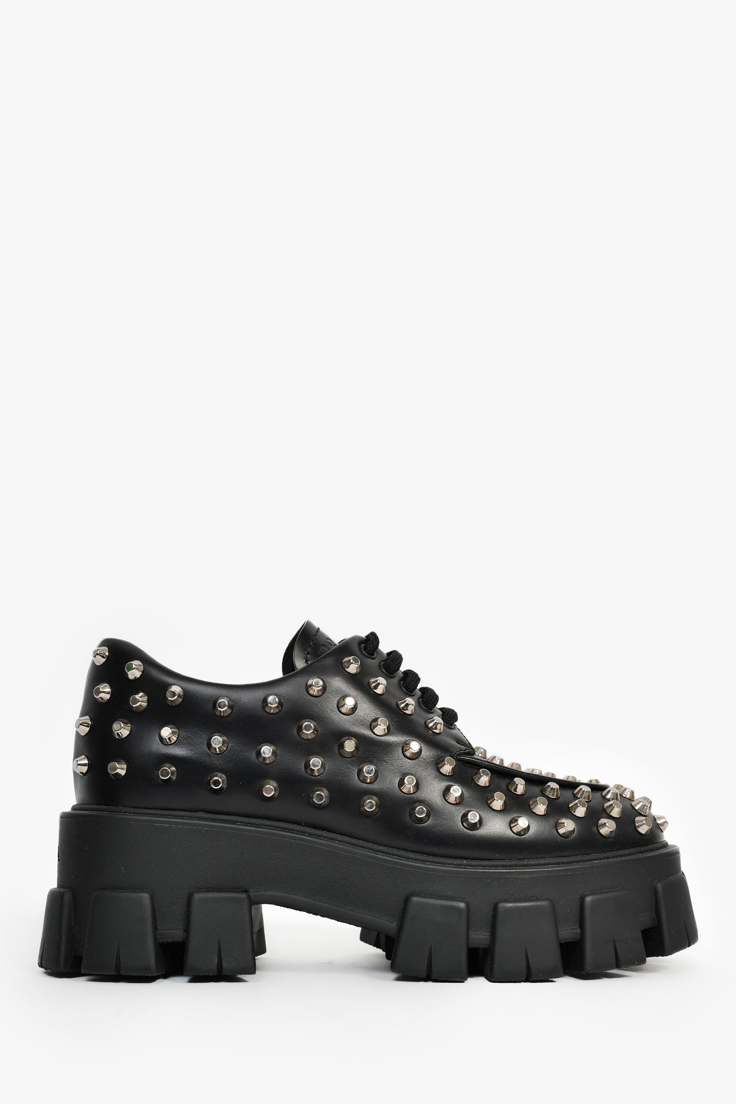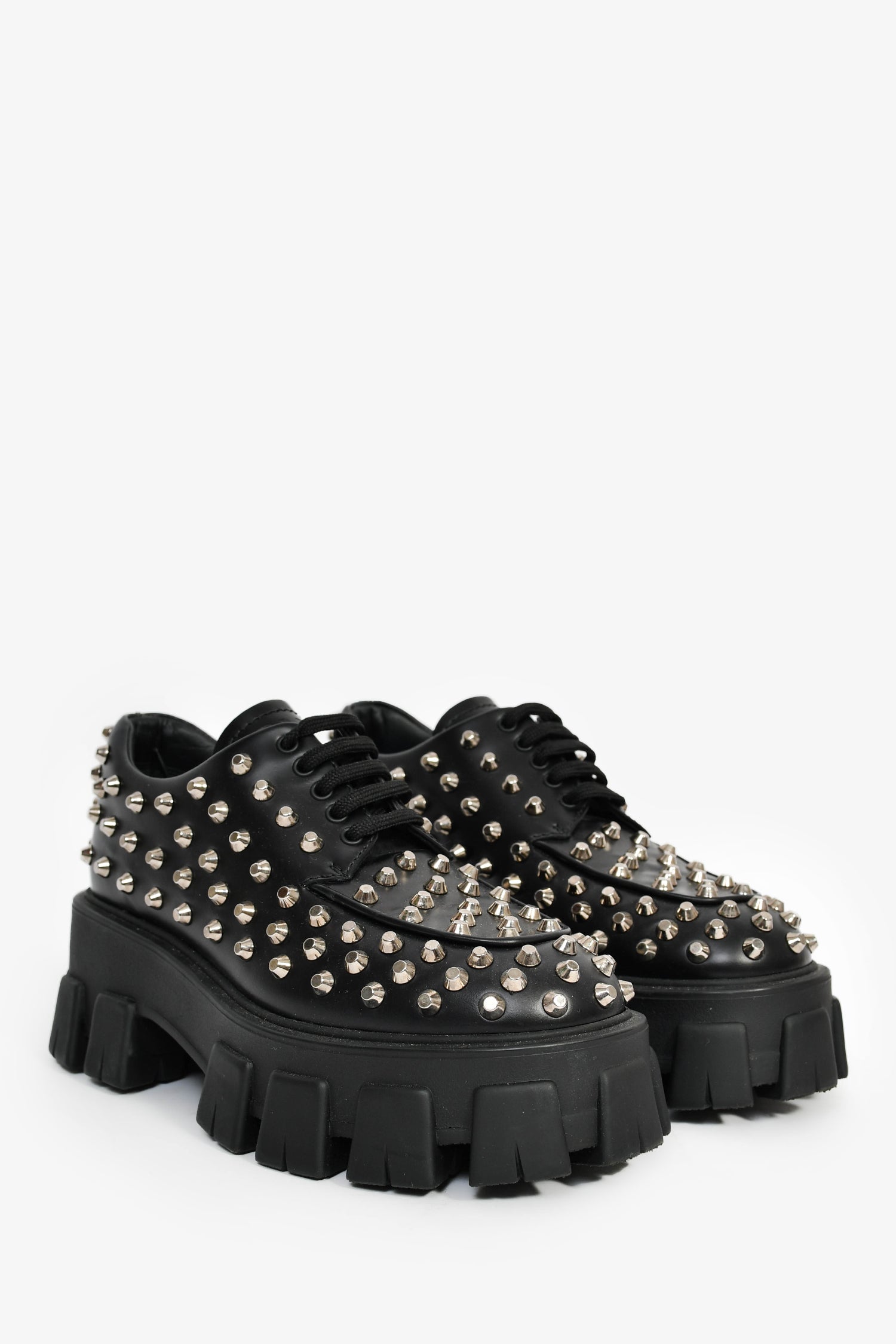 Refresh availabilityPrada Black Brushed Leather Studded Platform Loafers. Round toe. Front lace-up closure. Silver-tone hardware. Tonal stitching.