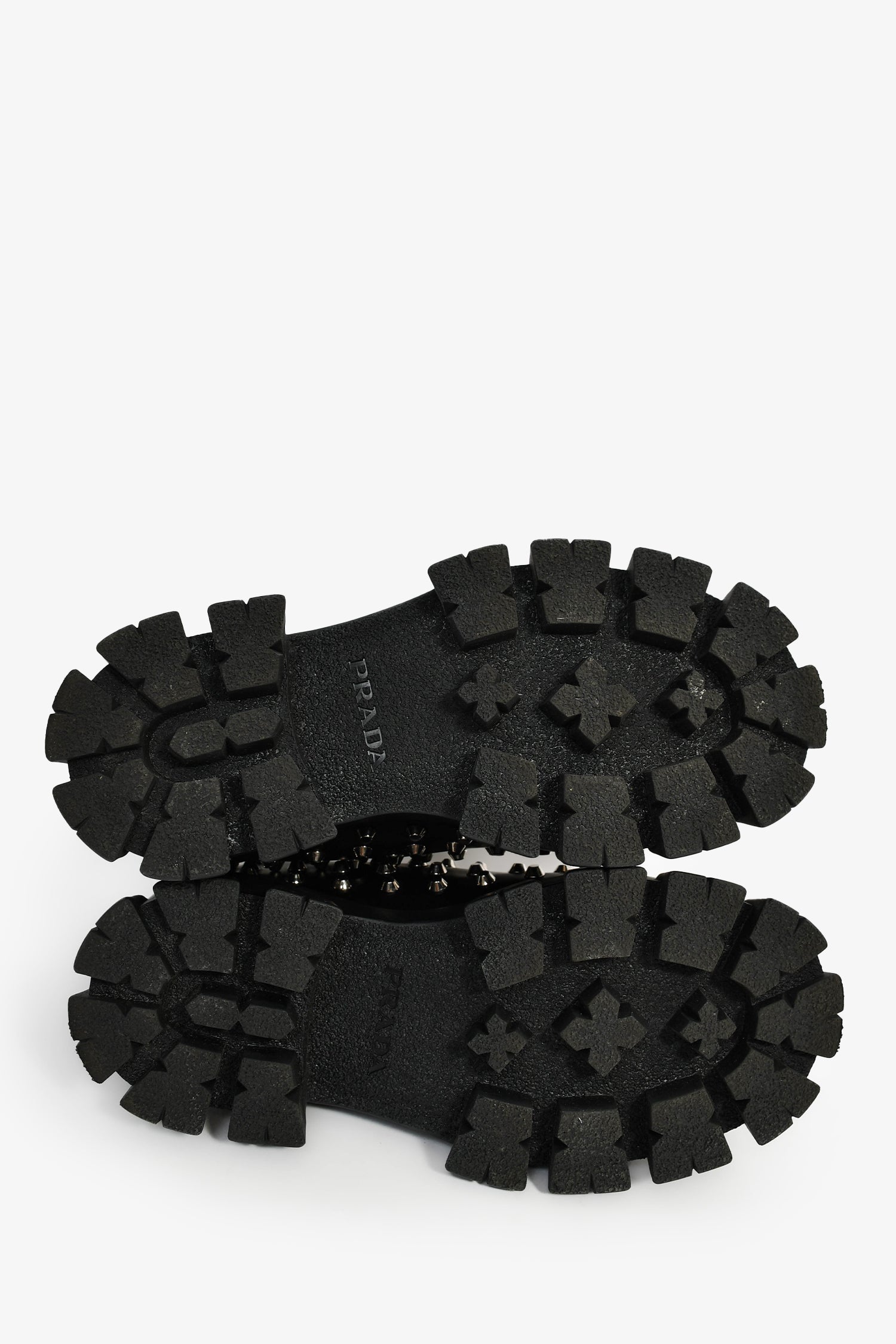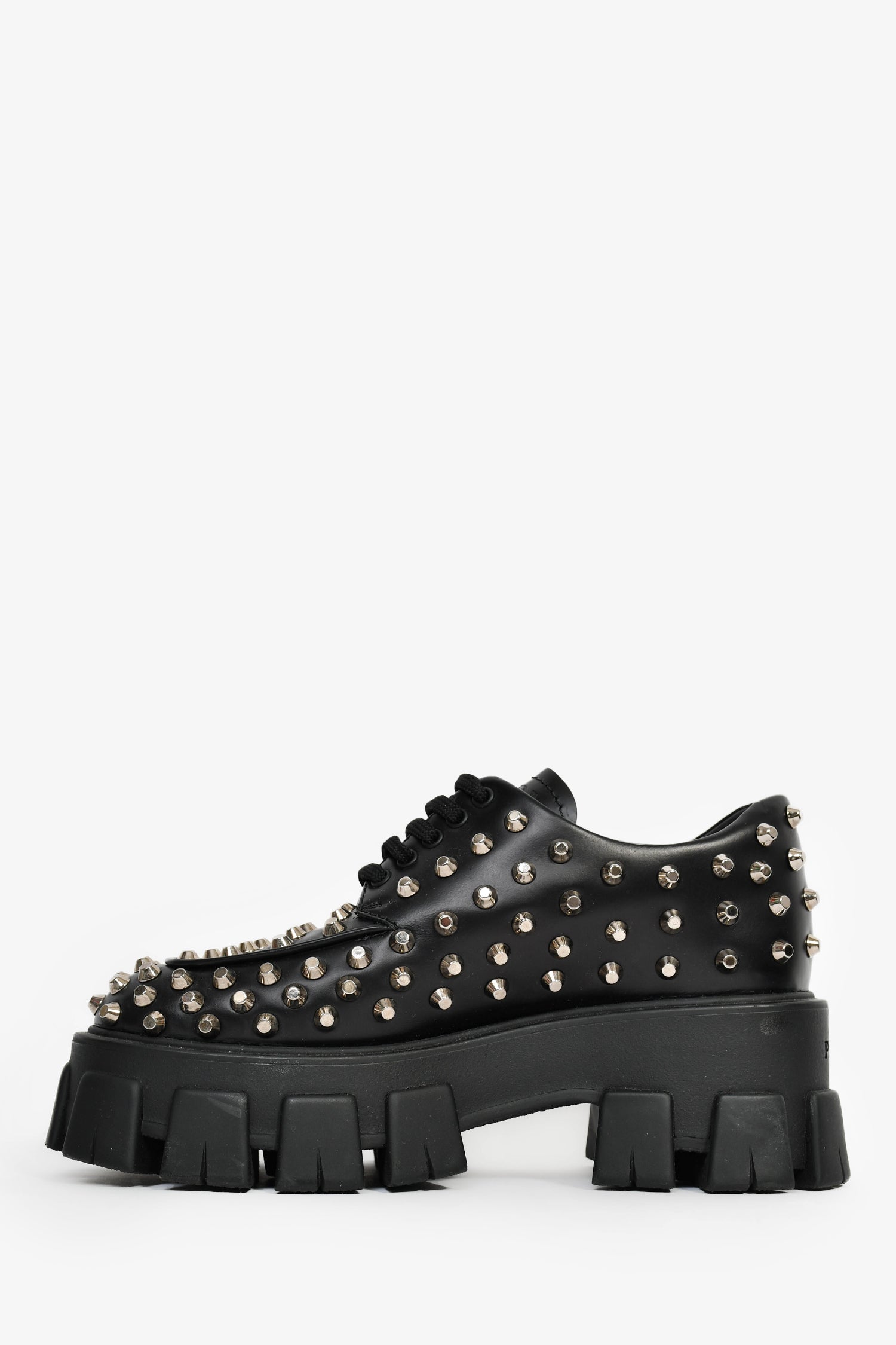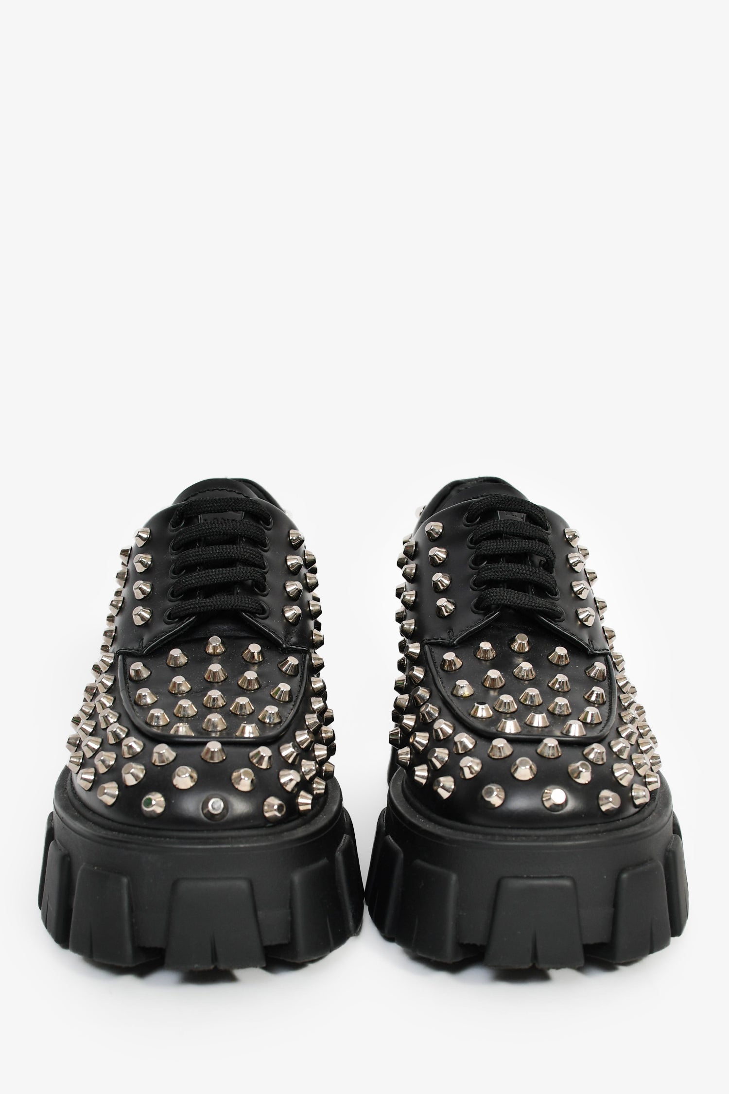 Refresh availabilityPrada Black Brushed Leather Studded Platform Loafers. Round toe. Front lace-up closure. Silver-tone hardware. Tonal stitching.