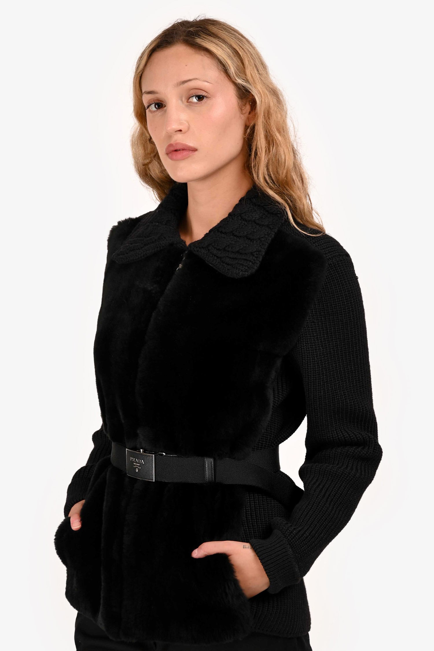 Refresh availabilityPrada Black Cable Knit Wool Fur Cinched Logo Belt Zip-Up Jacket. Front zip closure. Front pockets.