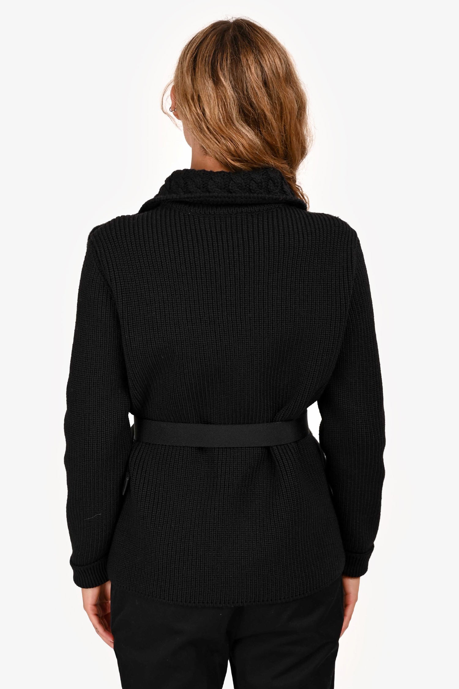 Prada Black Cable Knit Wool Fur Cinched Logo Belt Zip-Up Jacket Size 42